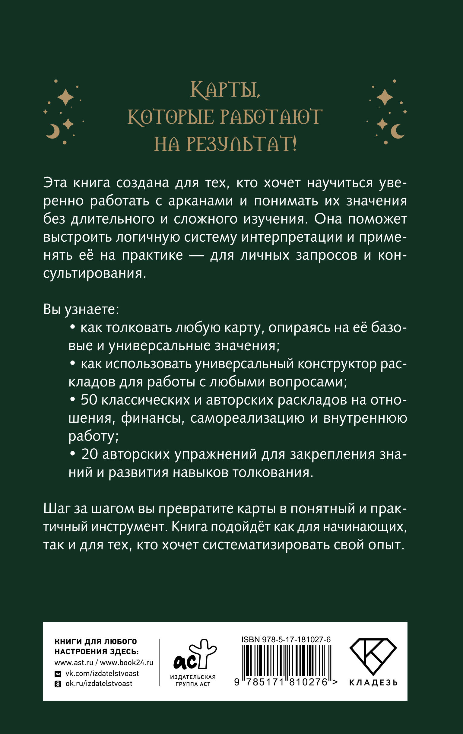 Карты, которые работают на результат! Эта книга создана для тех, кто хочет научиться уверенно работать с арканами и понимать их значения без длительного и сложного изучения. Она поможет выстроить логичную систему интерпретации и применять её на практике - для личных запросов и консультирования. Вы узнаете: • как толковать любую карту, опираясь на её базовые и универсальные значения; • как использовать универсальный конструктор раскладов для работы с любыми вопросами; • 50 классических и авторских раскладов на отношения, финансы, самореализацию и внутреннюю работу; • 20 авторских упражнений для закрепления знаний и развития навыков толкования. Шаг за шагом вы превратите карты в понятный и практичный инструмент. Книга подойдёт как для начинающих, так и для тех, кто хочет систематизировать свой опыт.| Издательство | Издательство "АСТ" |
