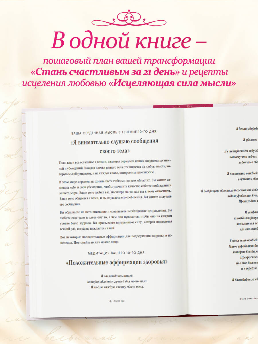 Секрет счастья, на самом деле, прост: принимайте с благодарностью все, чем щедро делится с вами жизнь, и дарите свою любовь окружающим. Именно этими сильными и глубокими посланиями поделилась с человечеством Луиза Хей - всемирно известный психолог, одна из основательниц движения самопомощи, автор десятков бестселлеров о том, как изменить свою жизнь к лучшему одной лишь силой мысли. Осознавайте каждый свой шаг, действие и чувство, любите себя такими, какие вы есть! В этом подарочном сборнике - два самых ярких мировых бестселлера Луизы Хей: «Исцеляющая сила мысли» и «Стань счастливым за 21 день». Черпайте вдохновение в позитивных мыслях и утверждениях - знаменитых аффирмациях автора, и скоро вы испытаете на себе их силу!| Издательство | ООО "Издательство "Эксмо" |