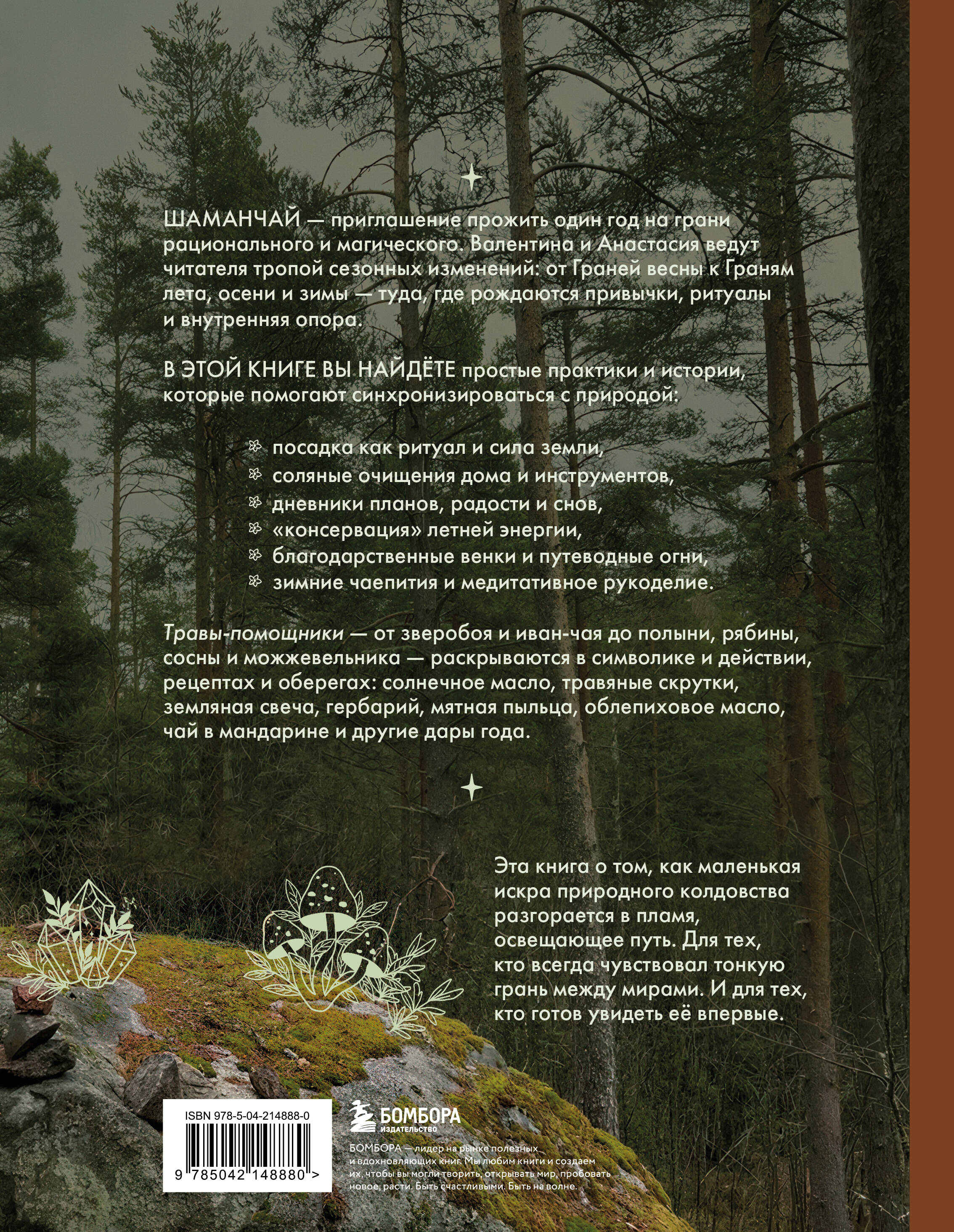 «Шаманчай: год в гармонии с природой» - книга, которая проведёт вас через все сезоны, раскрывая тайны природного колдовства. Весенние ритуалы, летняя энергия, осенние обереги и зимние медитации - почувствуйте магию в каждом дне. Внутри: более 30 растений‑помощников, рецепты травяных чаёв, масел, оберегов, практики очищения и советы по ведению дневника для синхронизации с ритмами природы. Для тех, кто ищет гармонию, вдохновение и связь с живой силой Земли. Почему вам понравится эта книга: ✔ Пошаговые ритуалы и практики для каждого времени года. ✔ Более 50 уникальных рецептов - от мятной пыльцы до чая в мандарине. ✔ Символика и сила трав. ✔ Подходит как начинающим, так и опытным практикам природной магии. ✔ Эстетично оформленный текст и яркие информативные фото - читать приятно, а идеи легко применять! Проживите год на грани рационального и магического - откройте свой путь с Шаманчаем.| Издательство | ООО "Издательство "Эксмо" |