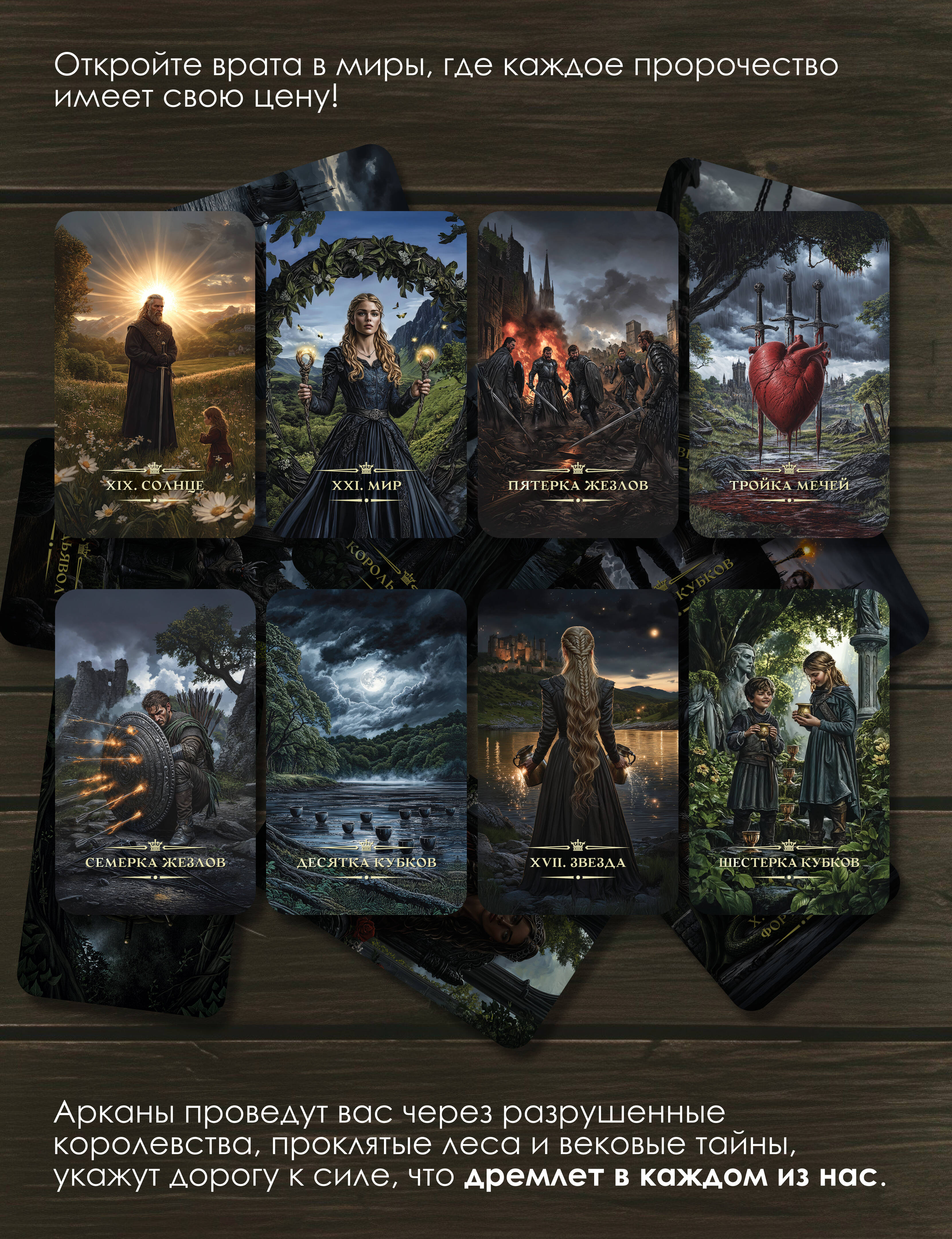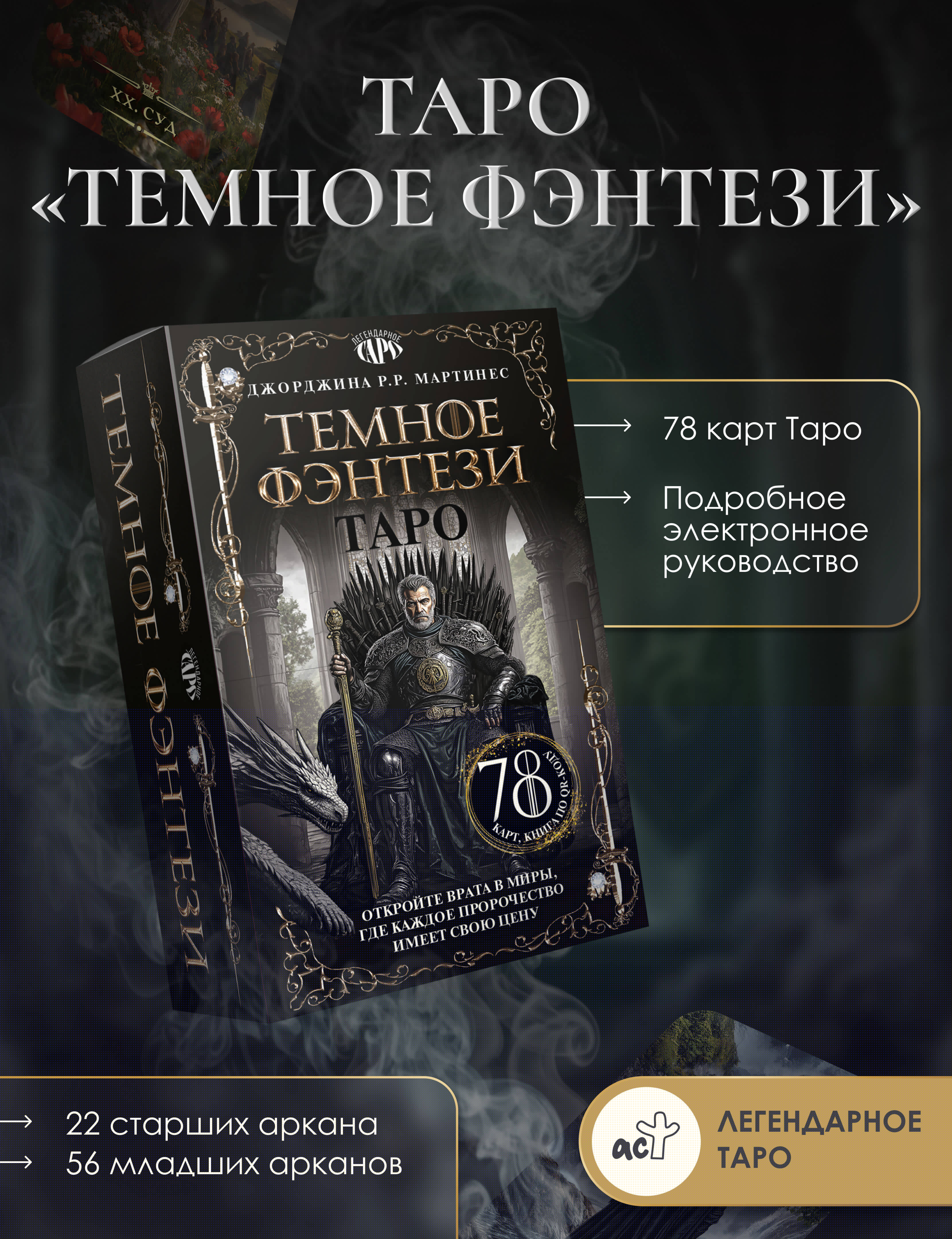 Таро "Темное фэнтези" - колода, в которой архетипы классического Таро обретают плоть в мире, где не утихают войны, не прощаются предательства, а смерть - лишь начало пути. Здесь все пропитано древней магией, горечью потерь и жаждой власти. Арканы проведут вас через разрушенные королевства, проклятые леса и вековые тайны, укажут дорогу к силе, что дремлет в каждом из нас. Придворные фигуры - не просто персонажи: это предатели и герои, ведьмы, правители, изгнанники и охотники на монстров. Автор колоды - Джорджина Р. Р. Мартинес - создает мир, в котором работа с Таро превращается в поединок с судьбой. Эта колода для тех, кто не боится вглядеться в бездну и услышать шепот тьмы. В колоде представлено 78 карт Таро, а также QR-код на электронное руководство, где вы найдете описание колоды, варианты раскладов и толкование всех 78 арканов.| Издательство | Издательство "АСТ" |