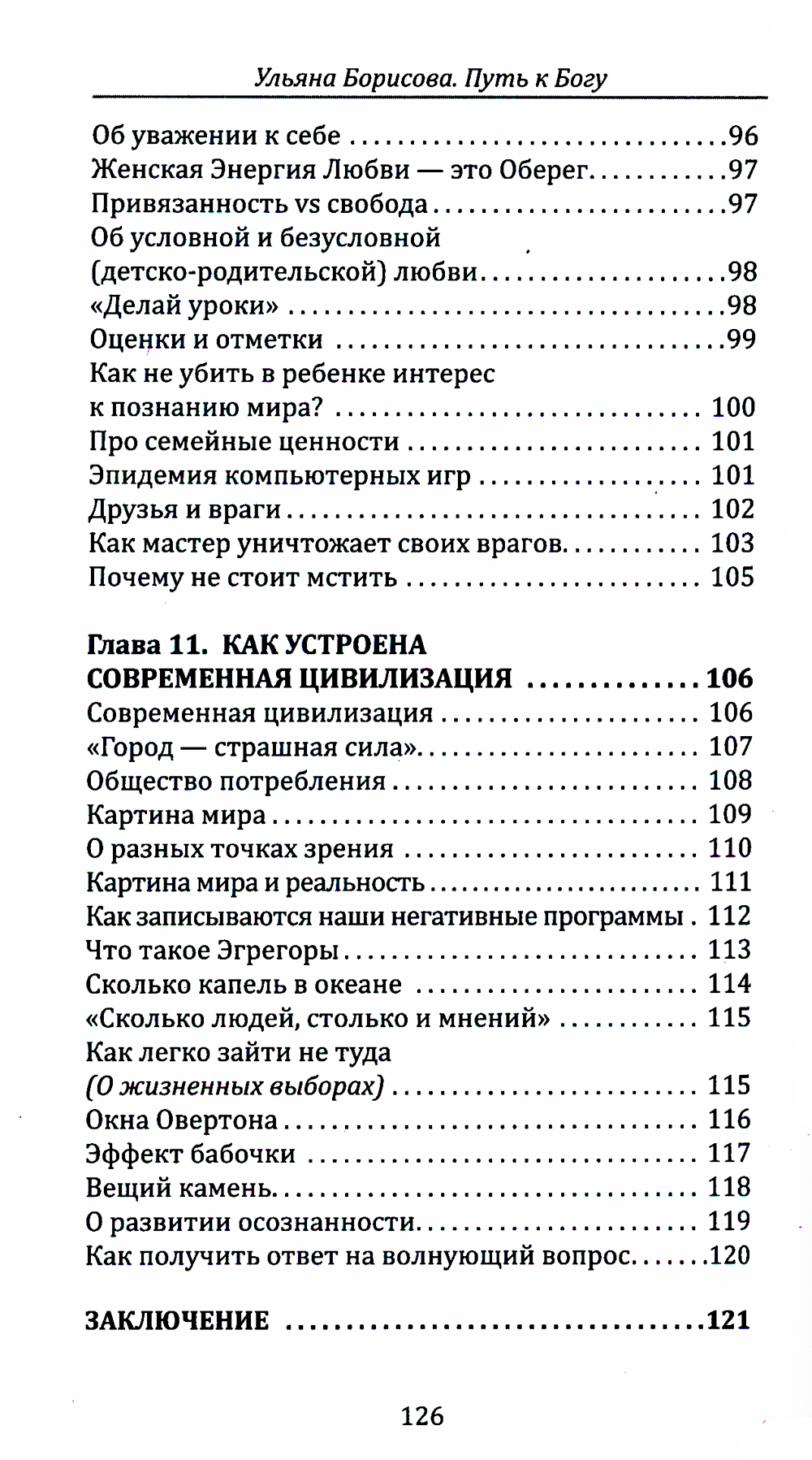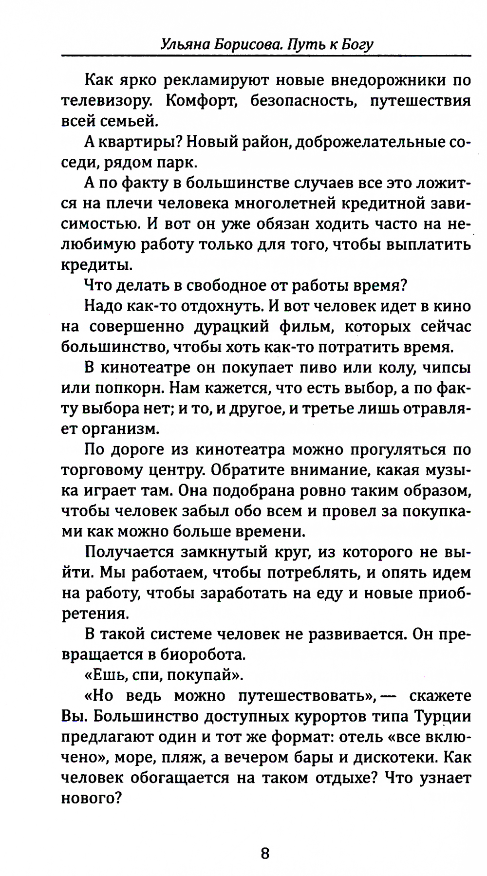 Книга «Путь к Богу» написана на основе личного опыта автора. Проведя более 500 психологических консультаций, автор пришла к выводу, что только обращение человека к Богу, только возврат на путь истины, о котором говорят все религии, поможет ему наладить свою жизнь, решить проблемы и прийти к самому себе настоящему. Пока мы врём себе и окружающим, пока выдаём желаемое за действительное, пока выбираем чужой путь, не согласующийся со своим предназначением, об улучшении жизни говорить не приходится. В книге затронуты следующие важные вопросы: как устроена современная западная цивилизация и почему ценности, принятые в современном обществе, способны испортить жизнь людей и завести нас в тупик? Что делать в сложившейся ситуации? Ответы даются следующие: во-первых, научиться слышать своё тело - оно нам никогда не врёт. Во-вторых, услышать голос совести. В-третьих, обратиться к своей душе и к Богу. Как найти свой путь, открыть божественное в себе и восстановить утраченную связь с мирозданием, рассказывается в этой книге. Книга написана для широкого круга читателей.| Издательство | Амрита-Русь |