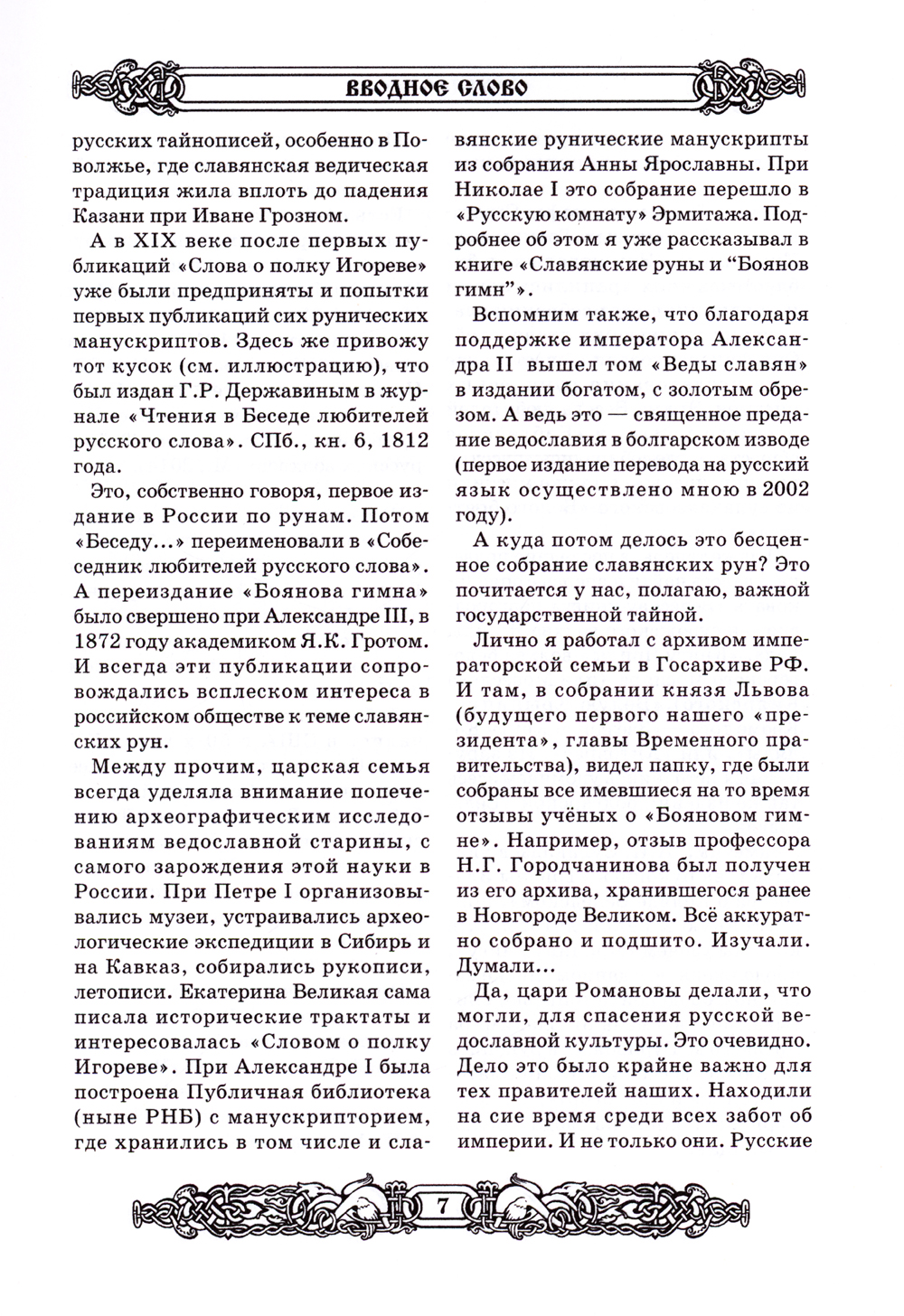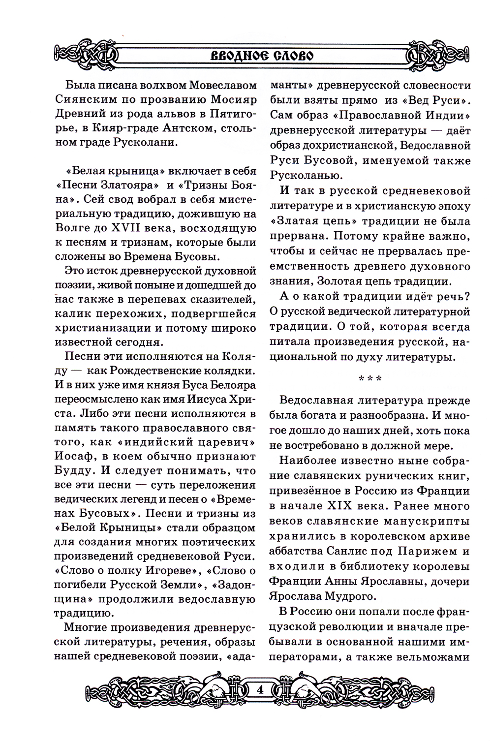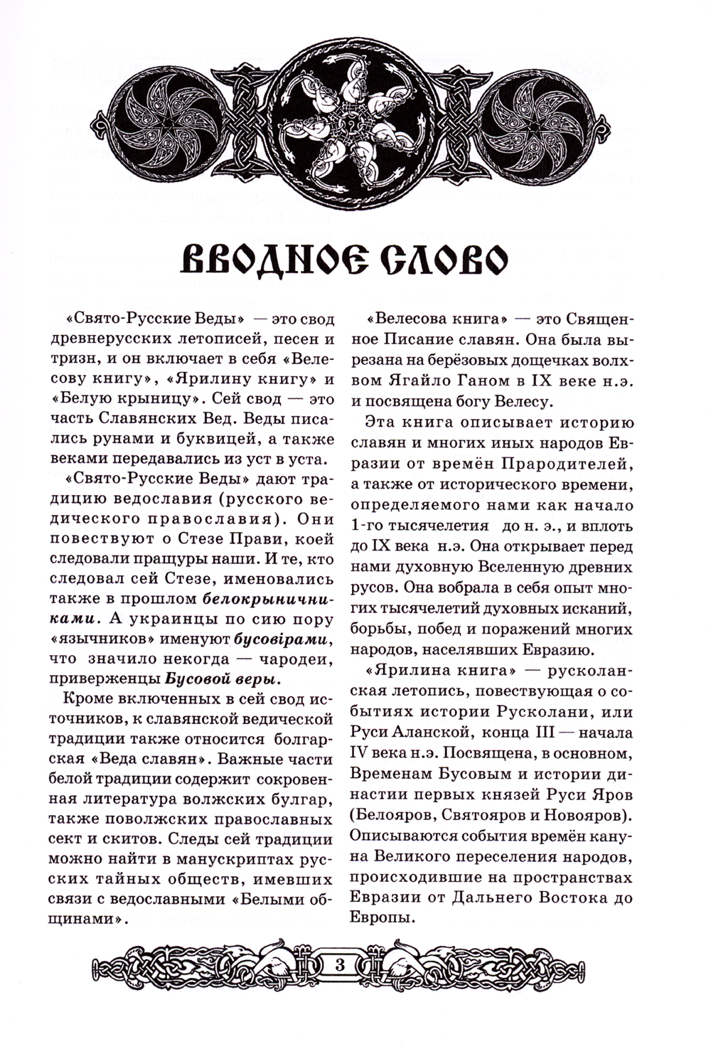 «Свято-Русские Веды» - свод древнерусских летописей, песен и тризн. Передавался по «Златой цепи» традиции от «Времён Бусовых» (IV век н.э.) по наше время. Все памятники этого свода отмечены в каталогах антиквара начала XIX века А.И. Сулакадзева. Содержит сказания и песни, повествующие о древнерусском царстве Русколани. Даёт картину жизни Древней Руси от времён родовичей до IX века н.э. Также рассказывает о великом князе Руси Аланской Бусе Белояре, его сестре Лебеди, брате Златояре, а также внуке Бояне. Обработки сих легенд, перепевы песен и тризн послужили основой для многих памятников древнерусской литературы, поэзии, а также духовных песен, исполняющихся и в наши дни. Тексты (прочтения руники буквицей) и переводы сопровождаются пояснениями.| Издательство | Амрита-Русь |