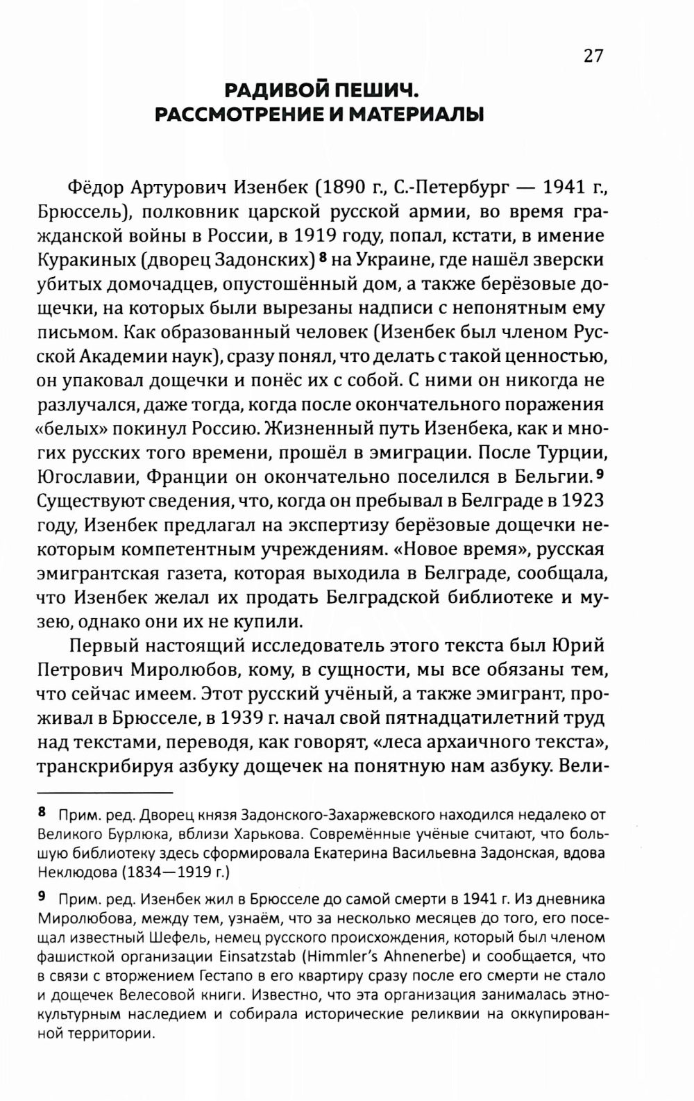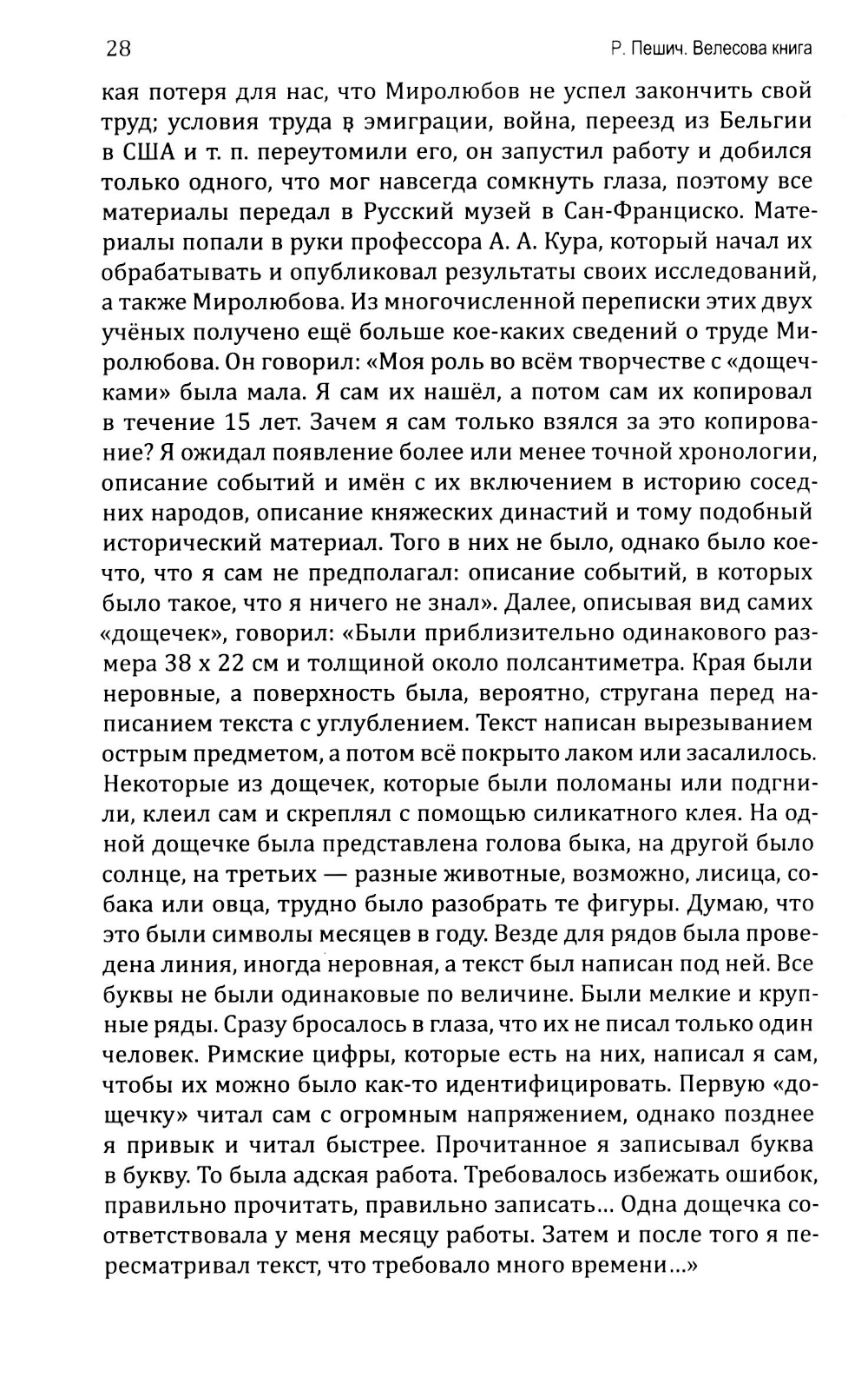 Книга является всеобъемлющим академическим изданием, претендующим на полноту изложения как исторического, так и языкового палеографического характера. В книге приведены перевод и исследования летописного памятника «Велесова книга» профессором доктором палеолингвистики Радивом Пешичем, который для полноты изложения материалов приводит собственную научную аргументацию, что вытекает из результатов его многолетних всесторонних археологических и палеографических исследований славянского прошлого.| Издательство | Амрита-Русь |