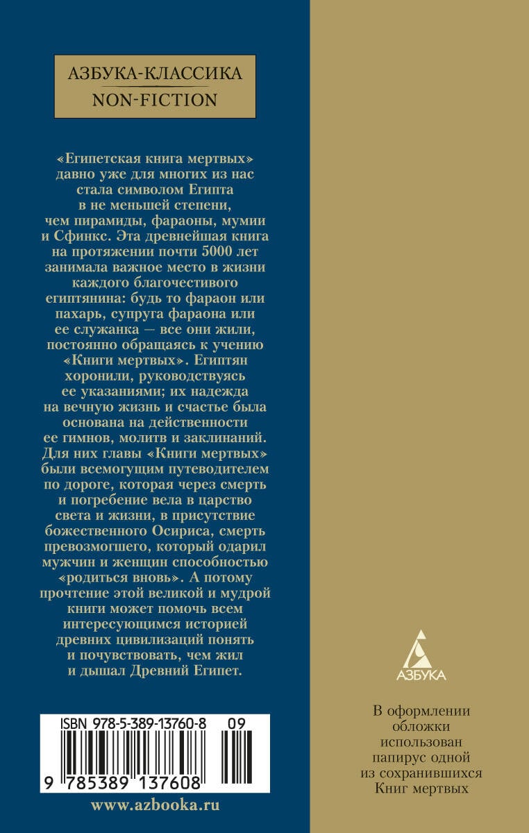 "Египетская книга мертвых" давно уже для многих из нас стала символом Египта в не меньшей степени, чем пирамиды, фараоны, мумии и Сфинкс. Эта древнейшая книга на протяжении почти 5000 лет занимала важное место в жизни каждого благочестивого египтянина: будь то фараон или пахарь, супруга фараона или ее служанка - все они жили, постоянно обращаясь к учению "Книги мертвых". Египтян хоронили, руководствуясь ее указаниями; их надежда на вечную жизнь и счастье была основана на действенности ее гимнов, молитв и заклинаний. Для них главы "Книги мертвых" были всемогущим путеводителем по дороге, которая через смерть и погребение вела в царство света и жизни, в присутствие божественного Осириса, смерть превозмогшего, который одарил мужчин и женщин способностью "родиться вновь". А потому прочтение этой великой и мудрой книги может помочь всем интересующимся историей древних цивилизаций понять и почувствовать, чем жил и дышал Древний Египет.| Издательство | Азбука-Аттикус Издат.группа ООО |