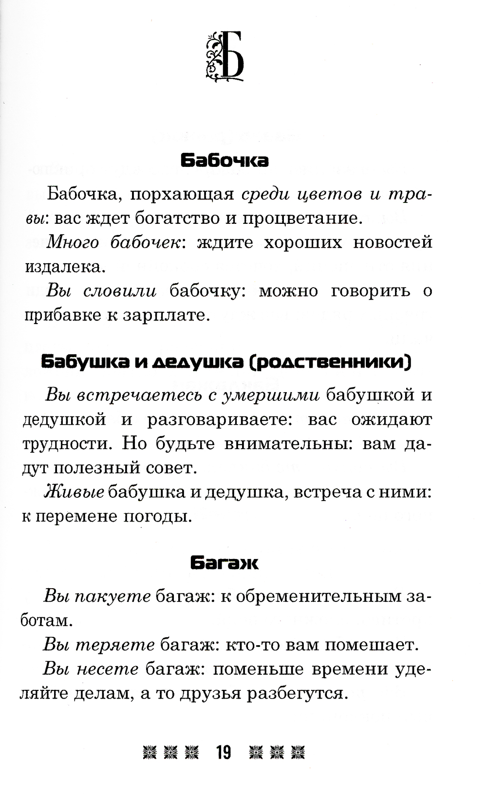 В этой книге даются в алфавитном порядке толкования на самые разнообразные сюжеты и ситуации наших снов; описаны значения предметов и людей, причем в модификациях: в зависимости от разнообразных характеристик, присущих им в нашем сновидении. Сонник составлен на основании традиционных представлений о символах сна; так толковали сновидения многие поколения людей, которые понимали: по ночам у человека открывается сверхзрение, обостряется интуиция, ему становится доступно то, что недоступно наяву. Да, во сне нам приходят предупреждения и алгоритмы решения сложных проблем, важно все запомнить, понять, систематизировать. Книга поможет вам в этом.| Издательство | Омега-Л |