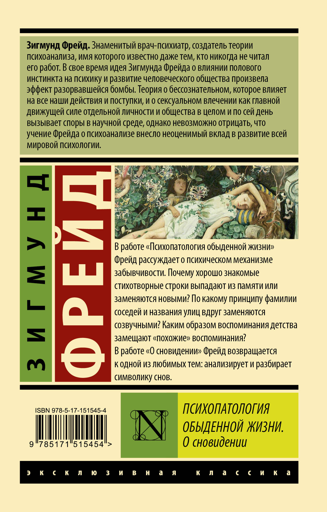 Зигмунд Фрейд. Знаменитый врач-психиатр, создатель теории психоанализа, имя которого известно даже тем, кто никогда не читал его работ. В свое время идея Зигмунда Фрейда о влиянии полового инстинкта на психику и развитие человеческого общества произвела эффект разорвавшейся бомбы. Теория о бессознательном, которое влияет на все наши действия и поступки, и о сексуальном влечении как главной движущей силе отдельной личности и общества в целом и по сей день вызывает споры в научной среде, однако невозможно отрицать, что учение Фрейда о психоанализе внесло неоценимый вклад в развитие всей мировой психологии. В работе "Психопатология обыденной жизни" Фрейд рассуждает о психическом механизме забывчивости. Почему хорошо знакомые стихотворные строки выпадают из памяти или заменяются новыми? По какому принципу фамилии соседей и названия улиц вдруг заменяются созвучными? Каким образом воспоминания детства замещают "похожие" воспоминания? В работе "О сновидении" Фрейд возвращается к одной из любимых тем: анализирует и разбирает символику снов.| Издательство | Издательство "АСТ" |