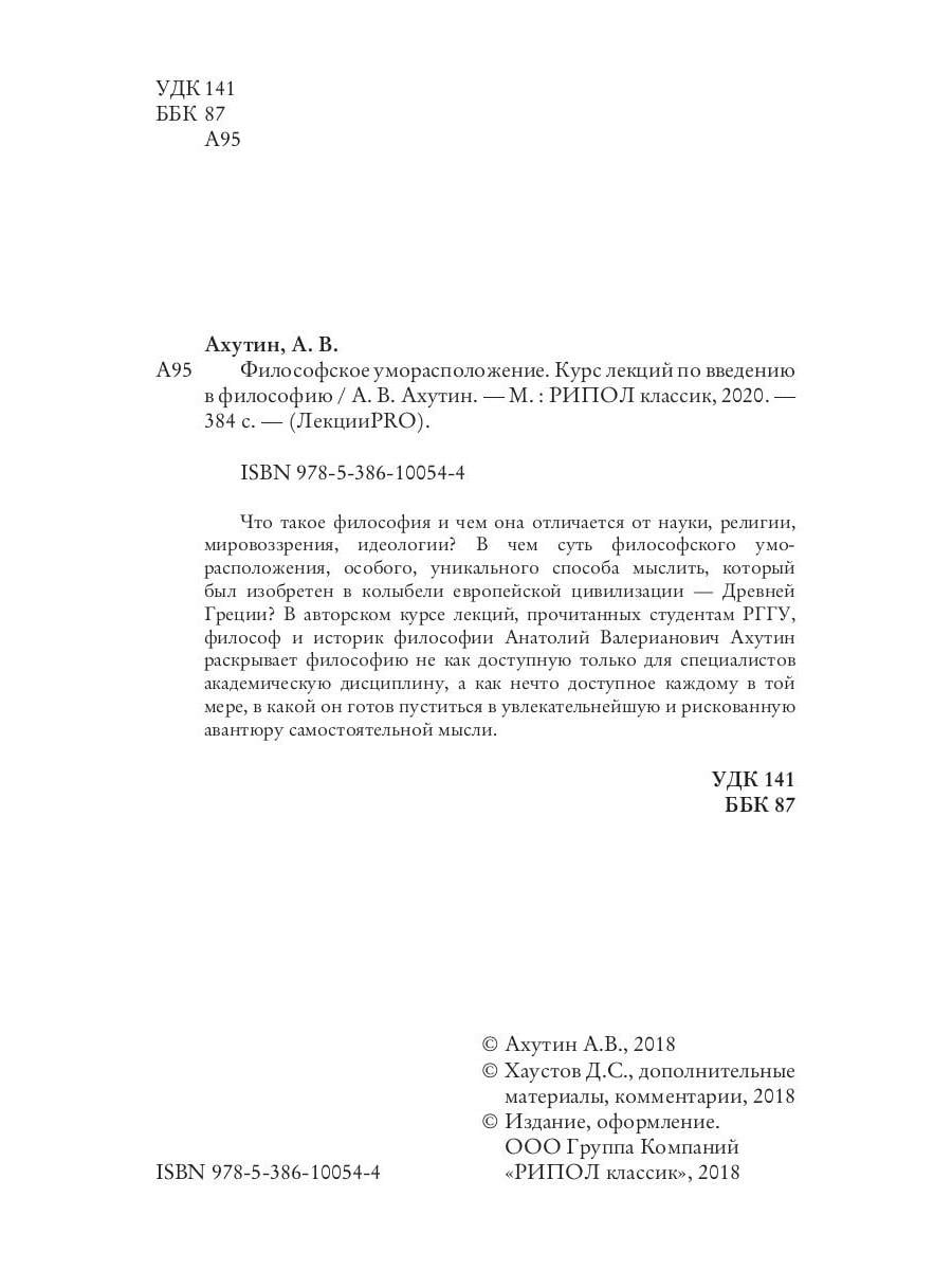 Что такое философия и чем она отличается от науки, религии, мировоззрения, идеологии? В чем суть философского уморасположения, особого, уникального способа мыслить, который был изобретен в колыбели европейской цивилизации - Древней Греции? В авторском курсе лекций, прочитанных студентам РГГУ, философ и историк философии Анатолий Валерианович Ахутин раскрывает философию не как доступную только для специалистов академическую дисциплину, а как нечто доступное каждому в той мере, в какой он готов пуститься в увлекательнейшую и рискованную авантюру самостоятельной мысли.| Издательство | Рипол Классик |