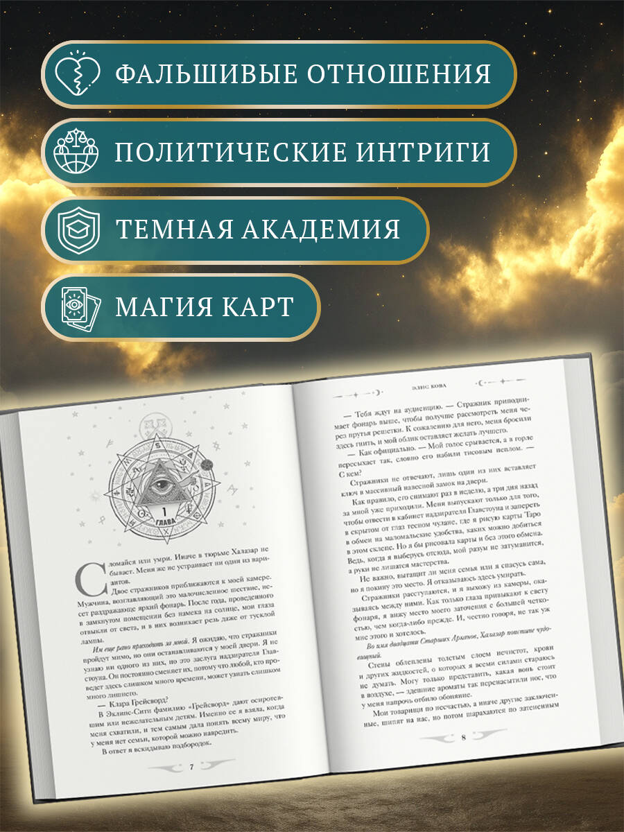 Добро пожаловать в магическую «Академию Арканов»! В этом цикле культовой писательницы фэнтези Элис Ковы вас ждет погружение в темную школу магии карт, фиктивный роман, тропы «от врагов к возлюбленным», «прикоснешься к ней - умрешь» и тайные преступления. Одна из самых ожидаемых новинок 2025 года! Клара Грейсворд выжила в преступном мире Эклипс-Сити благодаря своей изворотливости, воровству, невероятной удаче и… магии. Карты Таро незаконны, их отрисовка карается законом. Спасение Клару ждет в лице таинственного директора Академии Арканов, Принца Кэйлиса. Она поклялась его ненавидеть, но противостоять его обаянию невозможно…
