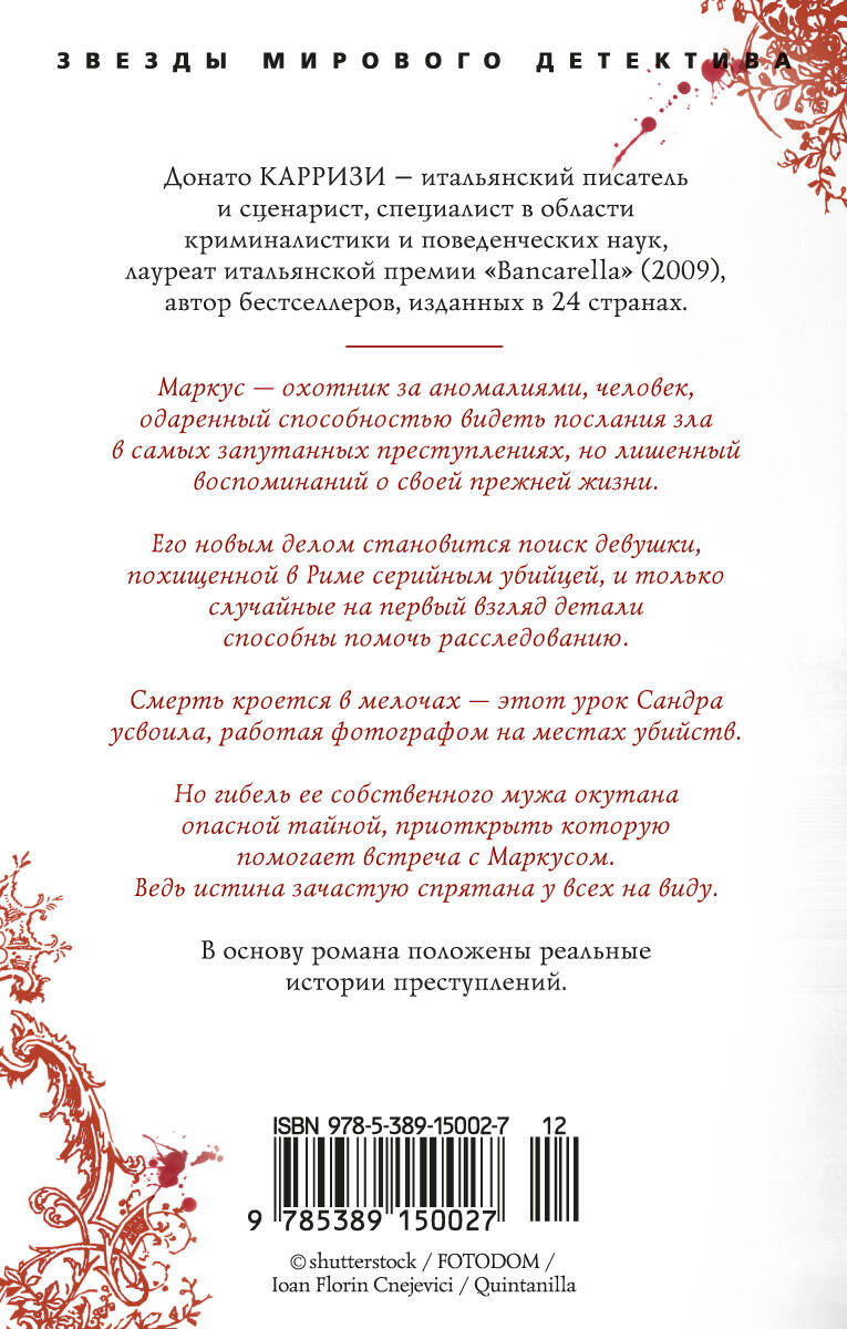 Маркус - охотник за аномалиями, человек, одаренный способностью видеть послания зла в самых запутанных преступлениях, но лишенный воспоминаний о своей прежней жизни. Его новым делом становится поиск девушки, захваченной серийным убийцей в Риме, и только случайные на первый взгляд детали способны помочь расследованию. Смерть кроется в мелочах - этот урок Сандра усвоила, работая фотографом на местах убийств. Но гибель ее собственного мужа покрыта опасной тайной, важным ключом к которой становится встреча с Маркусом. Ведь истина зачастую спрятана у всех на виду. В основу романа положены реальные истории преступлений.| Издательство | Азбука-Аттикус Издат.группа ООО |
