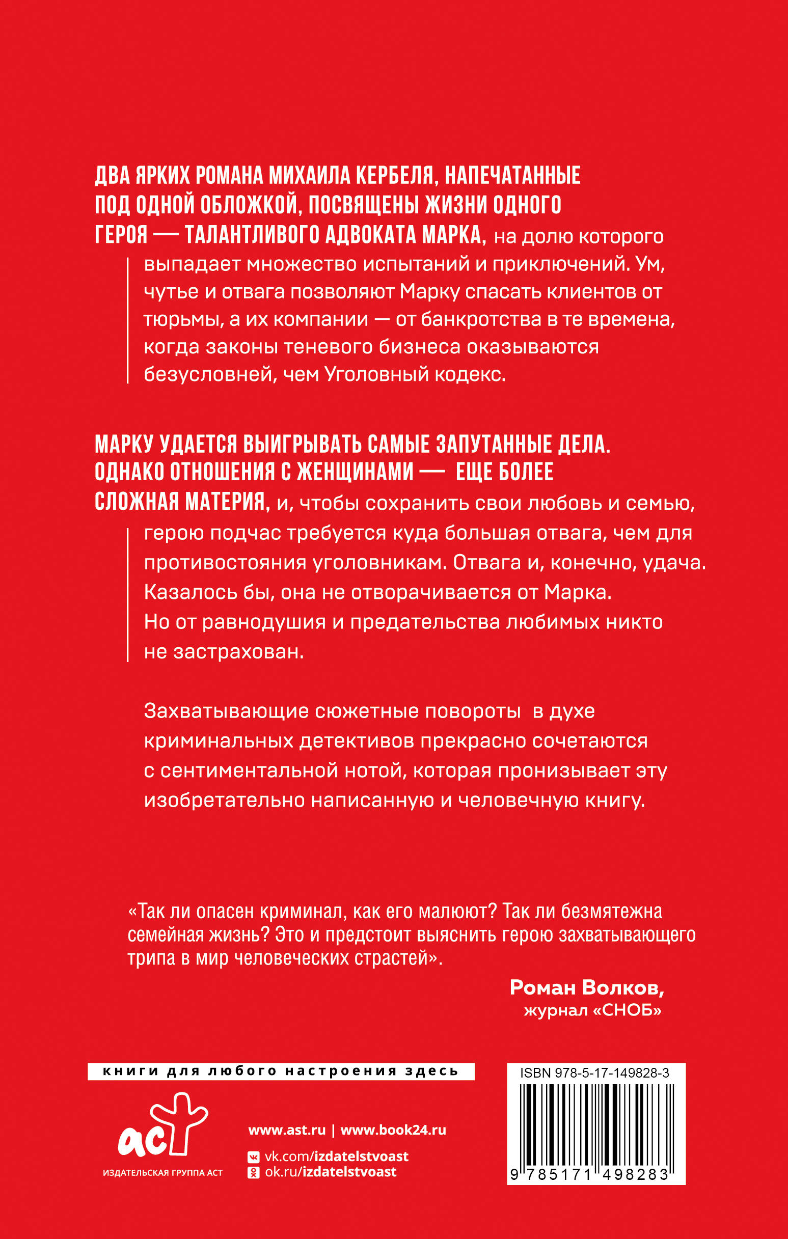 Два ярких романа Михаила Кербеля, напечатанные под одной обложкой, посвящены жизни одного героя - талантливого адвоката Марка, на долю которого выпадает множество испытаний и приключений. Ум, чутье и отвага позволяют Марку спасать клиентов от тюрьмы, а их компании - от банкротства в те времена, когда законы теневого бизнеса оказываются безусловней, чем уголовный кодекс. Марку удается выигрывать самые запутанные дела. Однако отношения с женщинами - еще более сложная материя, и, чтобы сохранить свои любовь и семью, герою подчас требуется куда большая отвага, чем для противостояния уголовникам. Отвага и, конечно, удача. Казалось бы, она не отворачивается от Марка. Но от равнодушия и предательства любимых никто не застрахован. Захватывающие сюжетные повороты в духе криминальных детективов прекрасно сочетаются с сентиментальной нотой, которая пронизывает эту изобретательно написанную и человечную книгу.| Издательство | Издательство "АСТ" |