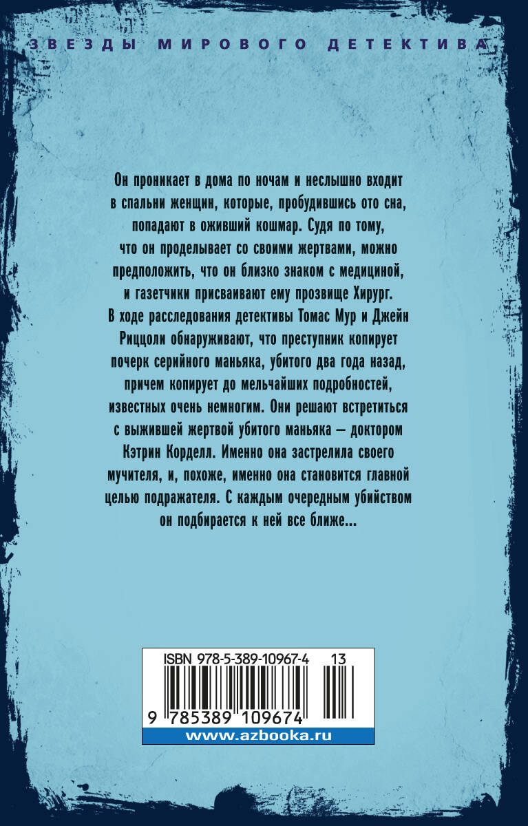 Он проникает в дома по ночам и неслышно входит в спальни женщин, которые, пробудившись ото сна, попадают в оживший кошмар. Судя по тому, что он проделывает со своими жертвами, можно предположить, что он близко знаком с медициной, и газетчики присваивают ему прозвище Хирург. В ходе расследования детективы Томас Мур и Джейн Риццоли обнаруживают, что преступник копирует почерк серийного маньяка, убитого два года назад, причем копирует до мельчайших подробностей, известных очень немногим. Они решают встретиться с выжившей жертвой убитого маньяка - доктором Кэтрин Корделл. Именно она застрелила своего мучителя, и, похоже, именно она становится главной целью подражателя. С каждым очередным убийством он подбирается к ней все ближе...| Издательство | Азбука-Аттикус Издат.группа ООО |