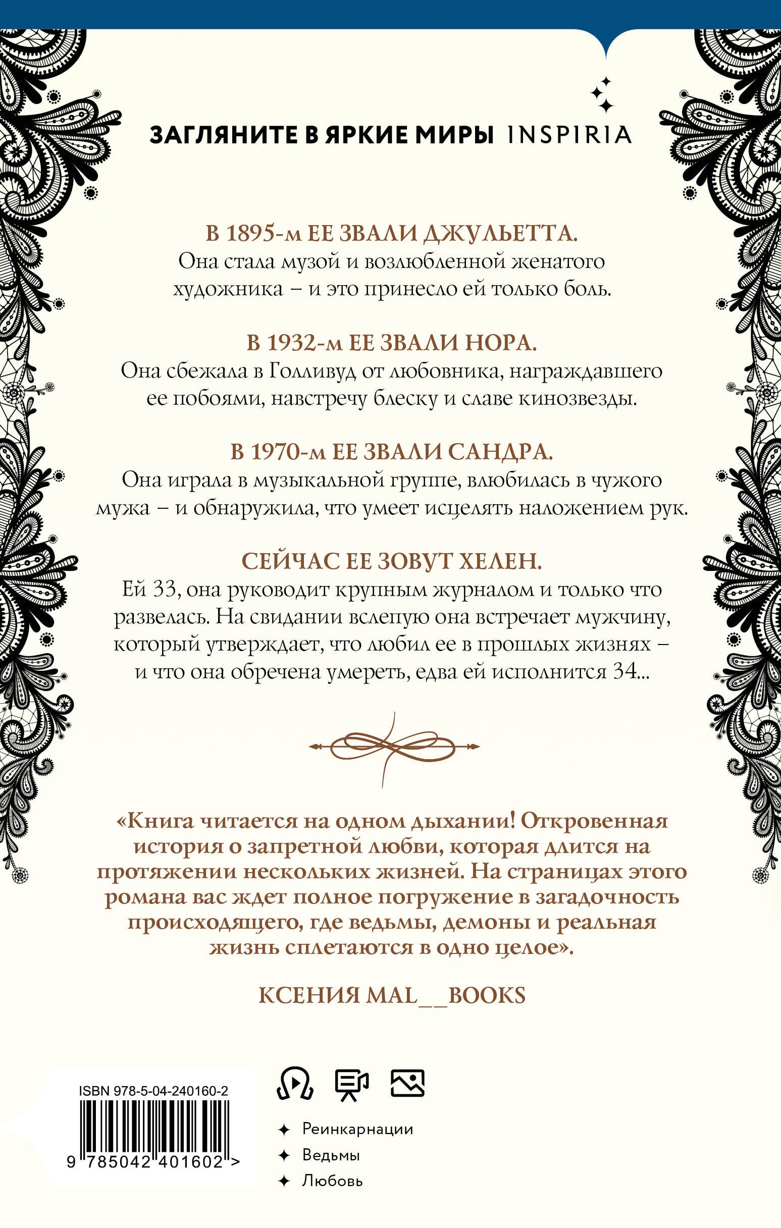 В 1895-м её звали Джульетта. В 16 лет она стала музой и возлюбленной женатого художника - и это принесло ей только боль. В 1932-м её звали Нора. Она сбежала в Голливуд от любовника, награждавшего её побоями, навстречу блеску и славе кинозвезды. В 1970-м её звали Сандра. Она играла в музыкальной группе, влюбилась в чужого мужа - и обнаружила, что умеет исцелять наложением рук. Сейчас её зовут Хелен Ламберт. Ей 33, она руководит крупным журналом и только что развелась. На свидании вслепую она встречает мужчину, который утверждает, что любил её в прошлых жизнях - и что она обречена умереть, едва ей исполнится 34. А чтобы разорвать проклятый круг смерти, перерождений и любовных интриг, делающих несчастной её и других, Хелен придётся пожертвовать самым дорогим…| Издательство | ООО "Издательство "Эксмо" |