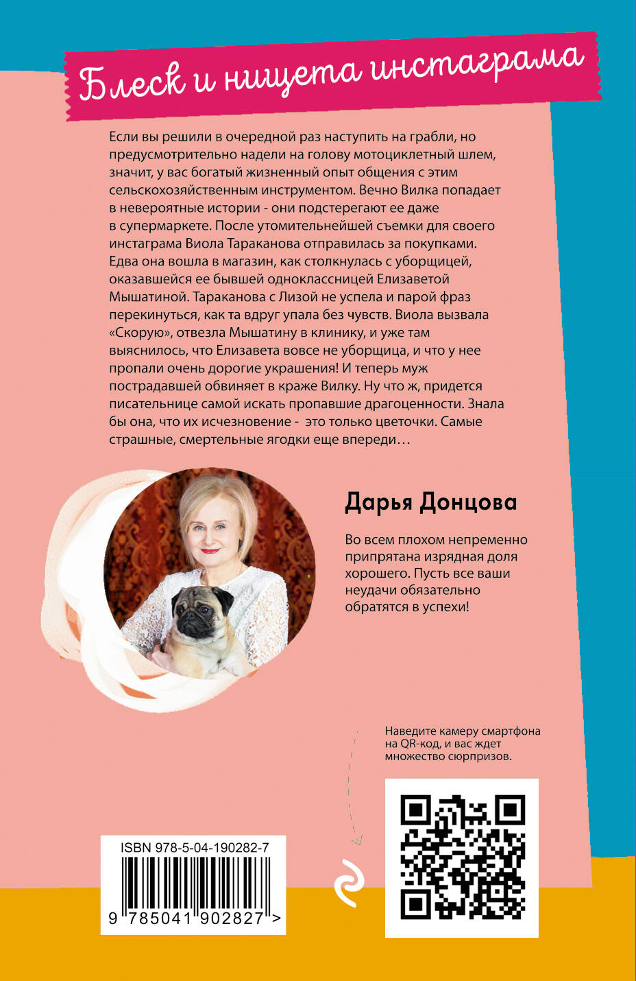 Дарья Донцова - самый популярный и востребованный автор в нашей стране, любимица миллионов читателей. В России продано более 200 миллионов экземпляров ее книг. Ее творчество наполняет сердца и души светом, оптимизмом, радостью, уверенностью в завтрашнем дне! Если вы решили в очередной раз наступить на грабли, но предусмотрительно надели на голову мотоциклетный шлем, значит, у вас богатый жизненный опыт общения с этим сельскохозяйственным инструментом. Вечно Вилка попадает в невероятные истории - они подстерегают ее даже в супермаркете. После утомительнейшей съемки для своего инстаграма Виола Тараканова отправилась за покупками. Едва она вошла в магазин, как столкнулась с уборщицей, оказавшейся ее бывшей одноклассницей Елизаветой Мышатиной. Тараканова с Лизой не успела и парой фраз перекинуться, как та вдруг упала без чувств. Виола вызвала «Скорую», отвезла Мышатину в клинику, и уже там выяснилось, что Елизавета вовсе не уборщица и что у нее пропали очень дорогие украшения! И теперь муж пострадавшей обвиняет в краже Вилку. Ну что ж, придется писательнице самой искать пропавшие драгоценности. Знала бы она, что их исчезновение - это только цветочки. Самые страшные, смертельные ягодки еще впереди… «Донцова невероятная работяга! Я не знаю ни одного другого писателя, который столько работал бы. Я отношусь к ней с уважением, как к образцу писательского трудолюбия. Женщины нуждаются в психологической поддержке и получают ее от Донцовой. Я и сама в свое время прочла несколько романов Донцовой. Ее читают очень разные люди. И очень занятые бизнес-леди, чтобы на время выключить голову, и домохозяйки, у которых есть перерыв 15-20 минут между отвести-забрать детей». - Галина Юзефович, литературный критик| Издательство | ООО "Издательство "Эксмо" |