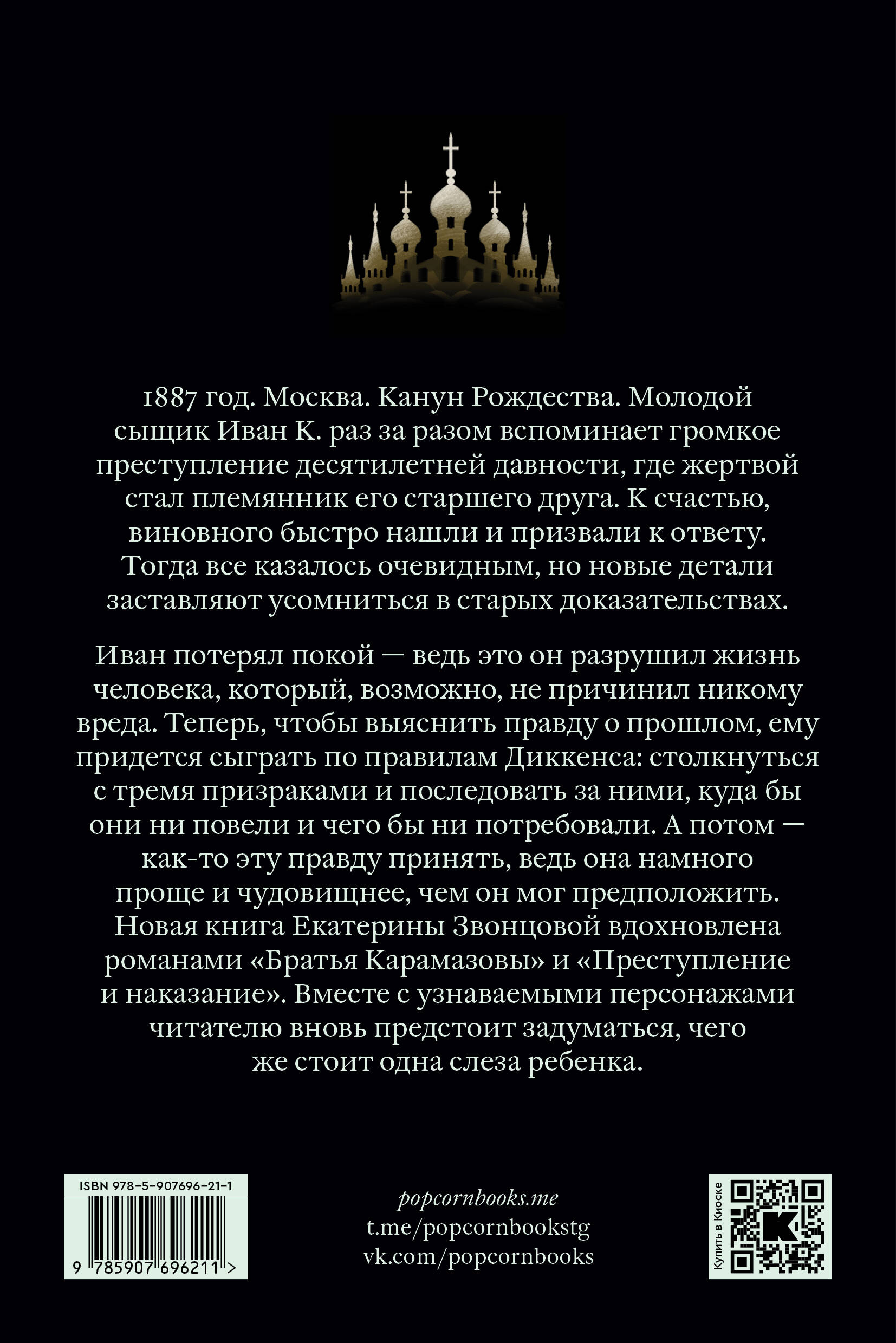 1887 год. Москва. Канун Рождества. Молодой сыщик Иван К. раз за разом вспоминает громкое преступление десятилетней давности, где жертвой стал племянник его старшего друга. К счастью, виновного быстро нашли и призвали к ответу. Тогда все казалось очевидным, но новые детали заставляют усомниться в старых доказательствах. Иван потерял покой ― ведь это он разрушил жизнь человека, который, возможно, не причинил никому вреда. Теперь, чтобы выяснить правду о прошлом, ему придется сыграть по правилам Диккенса: столкнуться с тремя призраками и последовать за ними, куда бы они ни повели и чего бы ни потребовали. А потом ― как-то эту правду принять, ведь она намного проще и чудовищнее, чем он мог предположить. Новая книга Екатерины Звонцовой вдохновлена романами «Братья Карамазовы» и «Преступление и наказание». Вместе с узнаваемыми персонажами читателю вновь предстоит задуматься, чего же стоит одна слеза ребенка.| Издательство | ИНДИВИДУУМ ПРИНТ ООО |