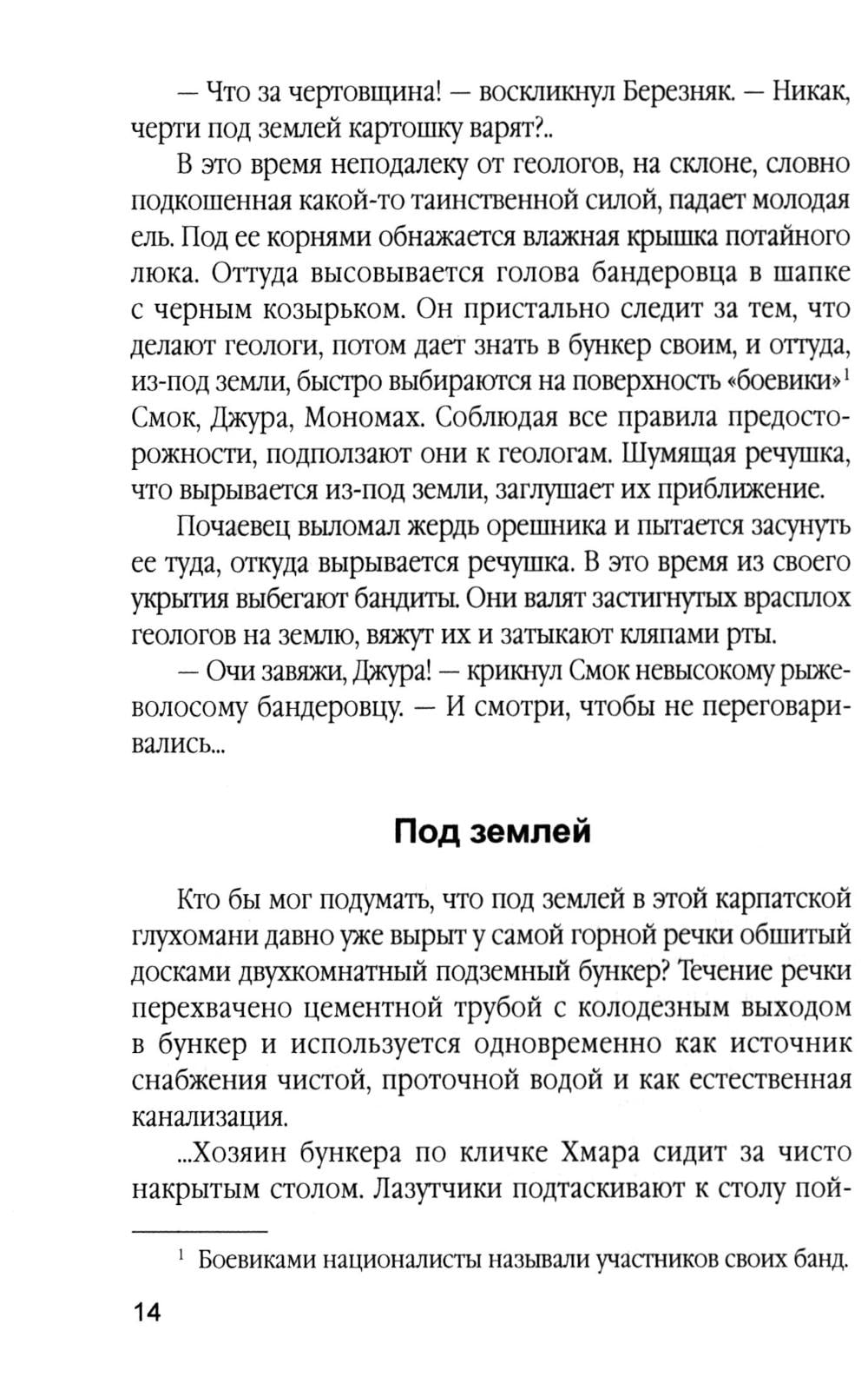 Захватывающая повесть о тайнах прошлого, раскрытии секретов и борьбе с врагами Родины. Действие происходит в первые послевоенные годы, когда Украина еще залечивала раны войны, а бывшие пособники нацистов продолжали свою преступную деятельность. Авторы воссоздают реальные события, когда чекисты вступают в смертельную схватку с агентурной сетью украинских националистов, оставшуюся от гитлеровской Германии. История основана на реальных событиях, однако авторы меняют детали и имена некоторых персонажей. Впервые опубликованная в 1963 году во время «оттепели», она больше не переиздавалась в СССР и в современной России. Причина: слишком реалистично показано противостояние чекистов и «бандеровцев». А так же правдиво рассказано о работе разведки и контрразведки.| Издательство | Родина |