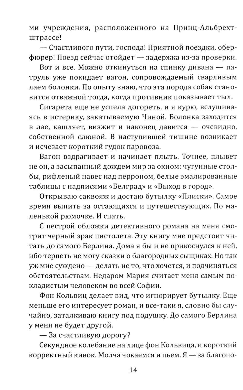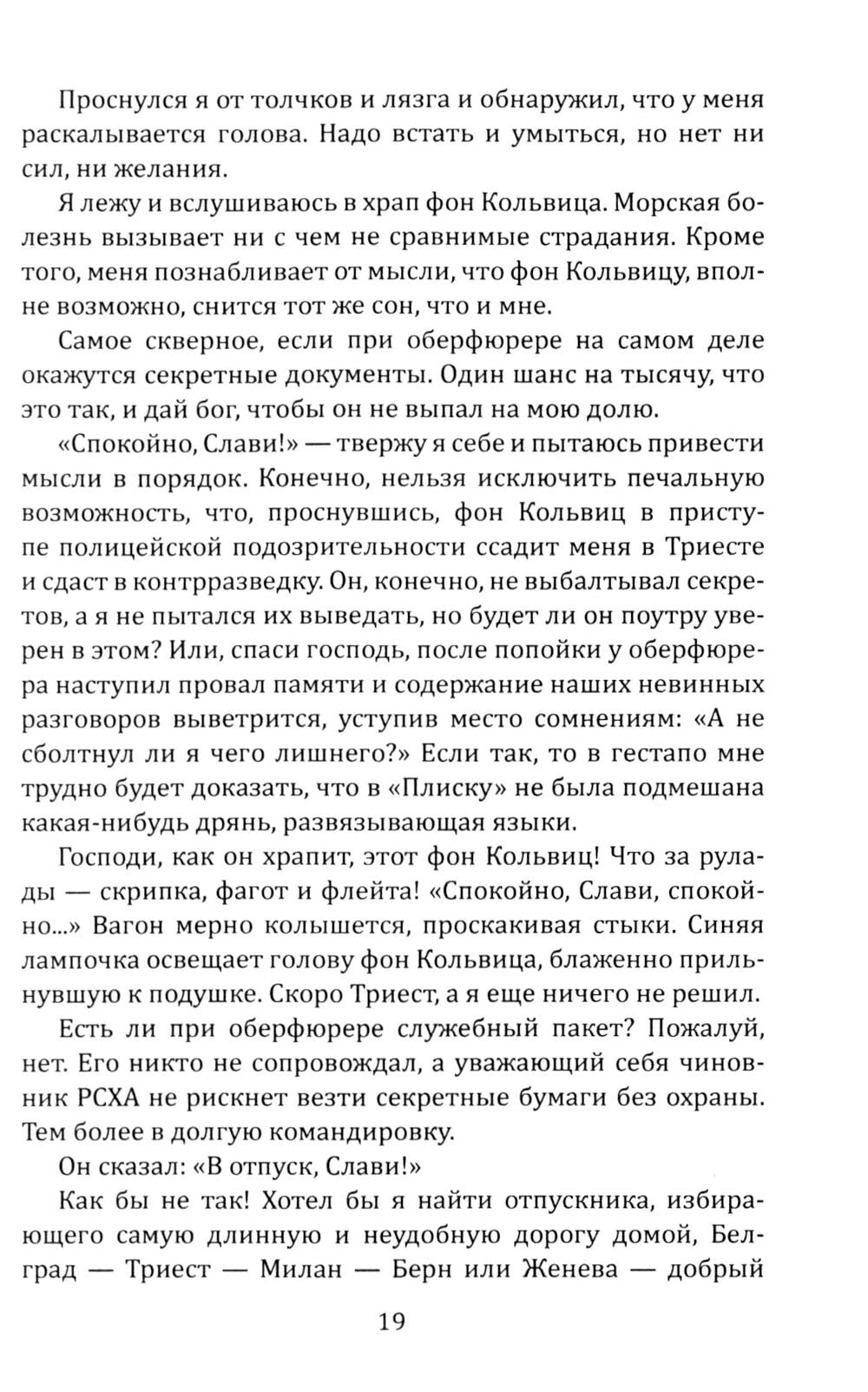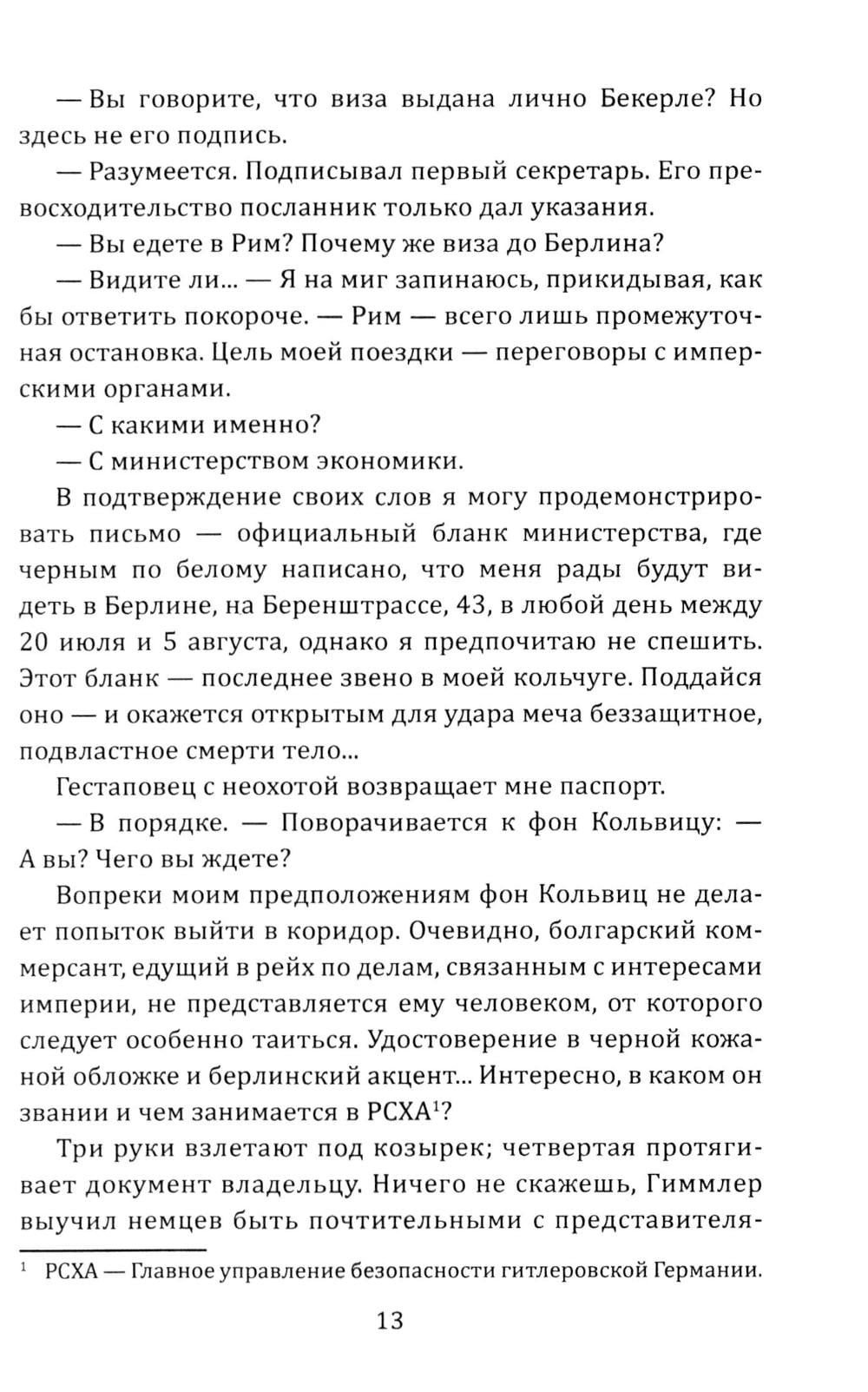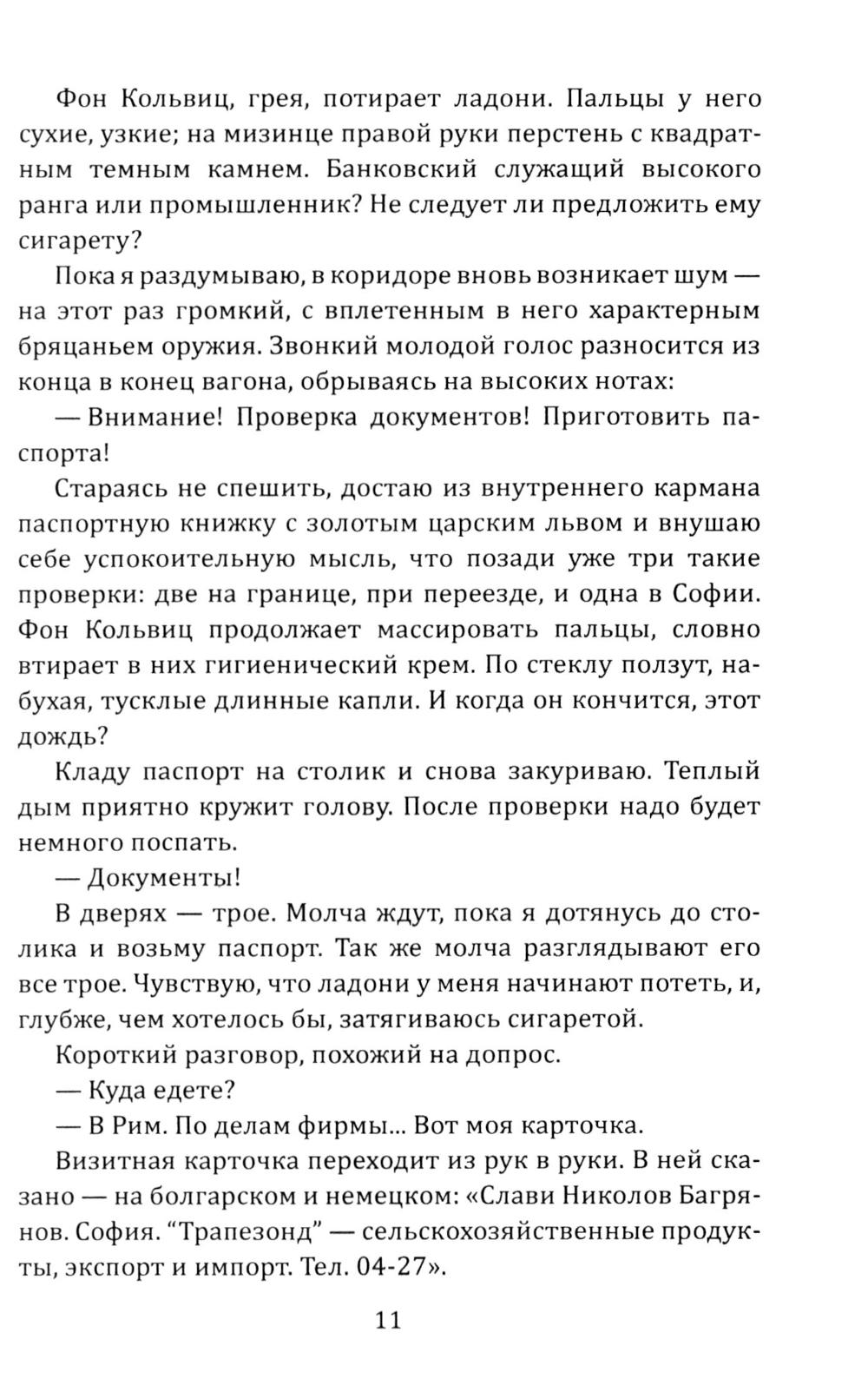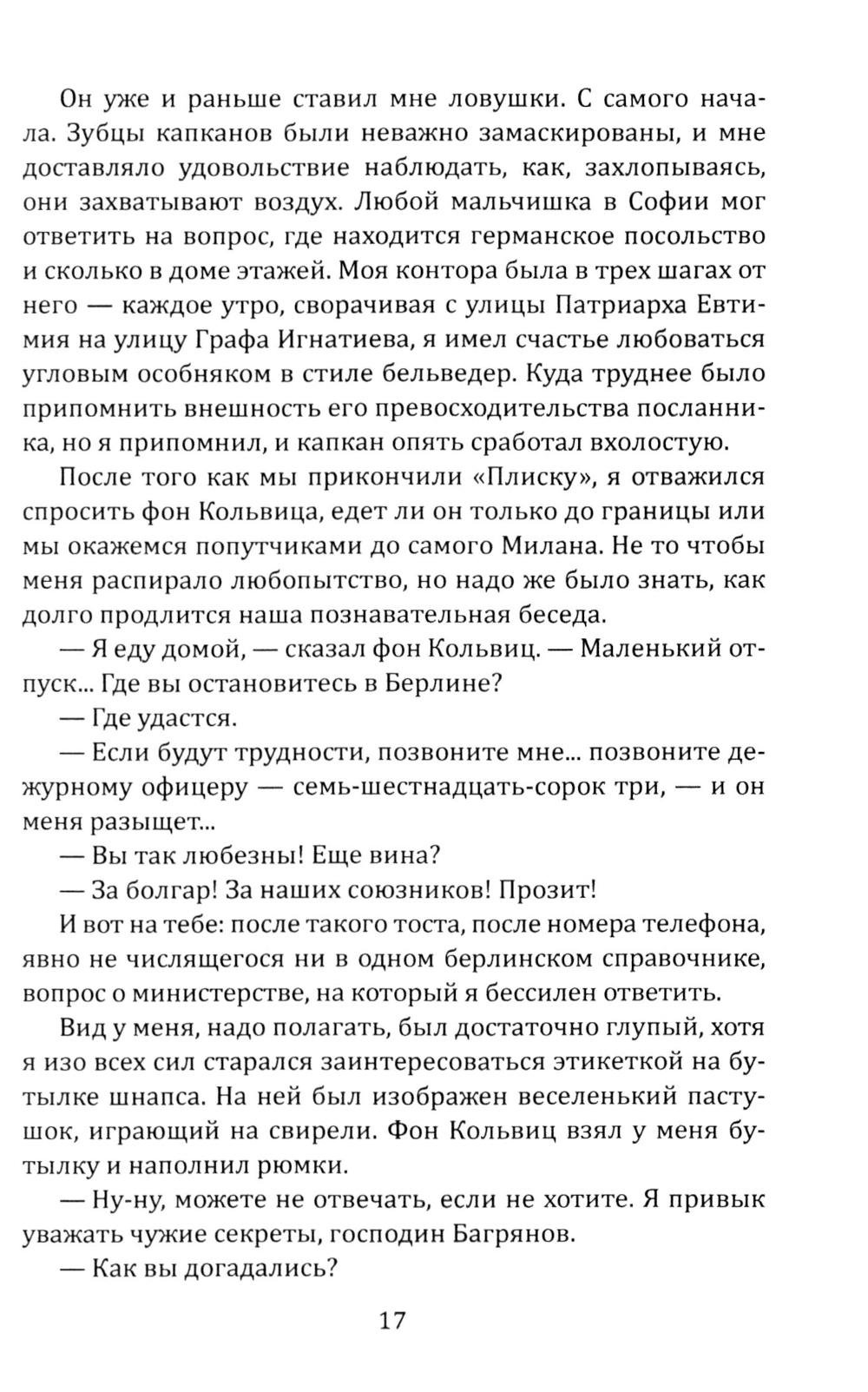 История советского разведчика болгарского происхождения Слави Багрянова. В начале Второй мировой войны под легендой коммерсанта из Софии, он ведет тайную деятельность на территориях Италии, Франции, Германии и собственной родины - Болгарии. Первая повесть сборника, «Идите с миром», описывает драматическое путешествие Багрянова, направленного с заданием доставить в столицу Третьего рейха ценнейшую шифровальную книгу и драгоценности. Преодолев многочисленные испытания, пройдя Италию и занятую нацистами Францию, герой достигает цели, демонстрируя стойкость и мужество перед лицом смертельной опасности. Вторая повесть, «Островитянин», раскрывает судьбу разведчика на родине, в Болгарии, которая была ареной ожесточенных сражений против фашистских захватчиков. Повесть насыщена напряженными эпизодами конспирации, опасностью разоблачения и примерами исключительного мужества советских агентов, работающих глубоко в тылу врага.| Издательство | Родина |