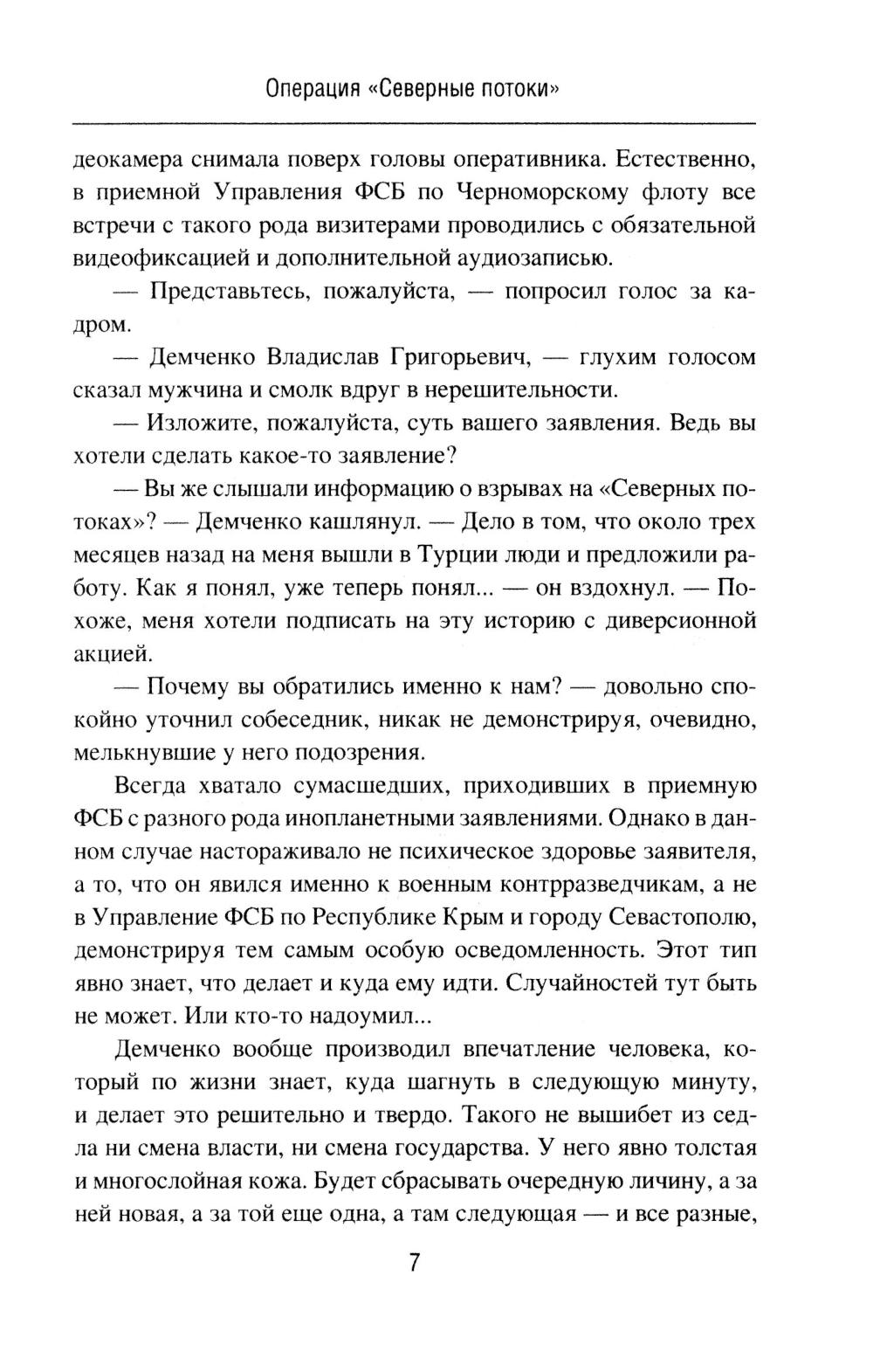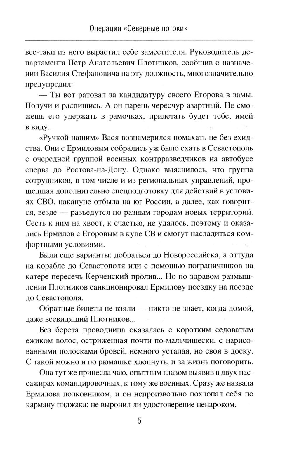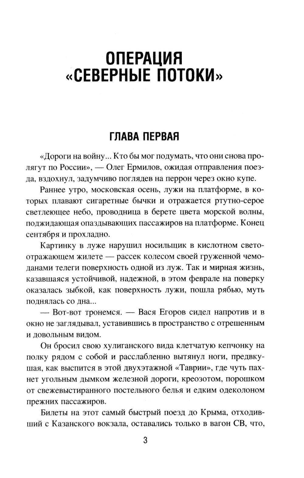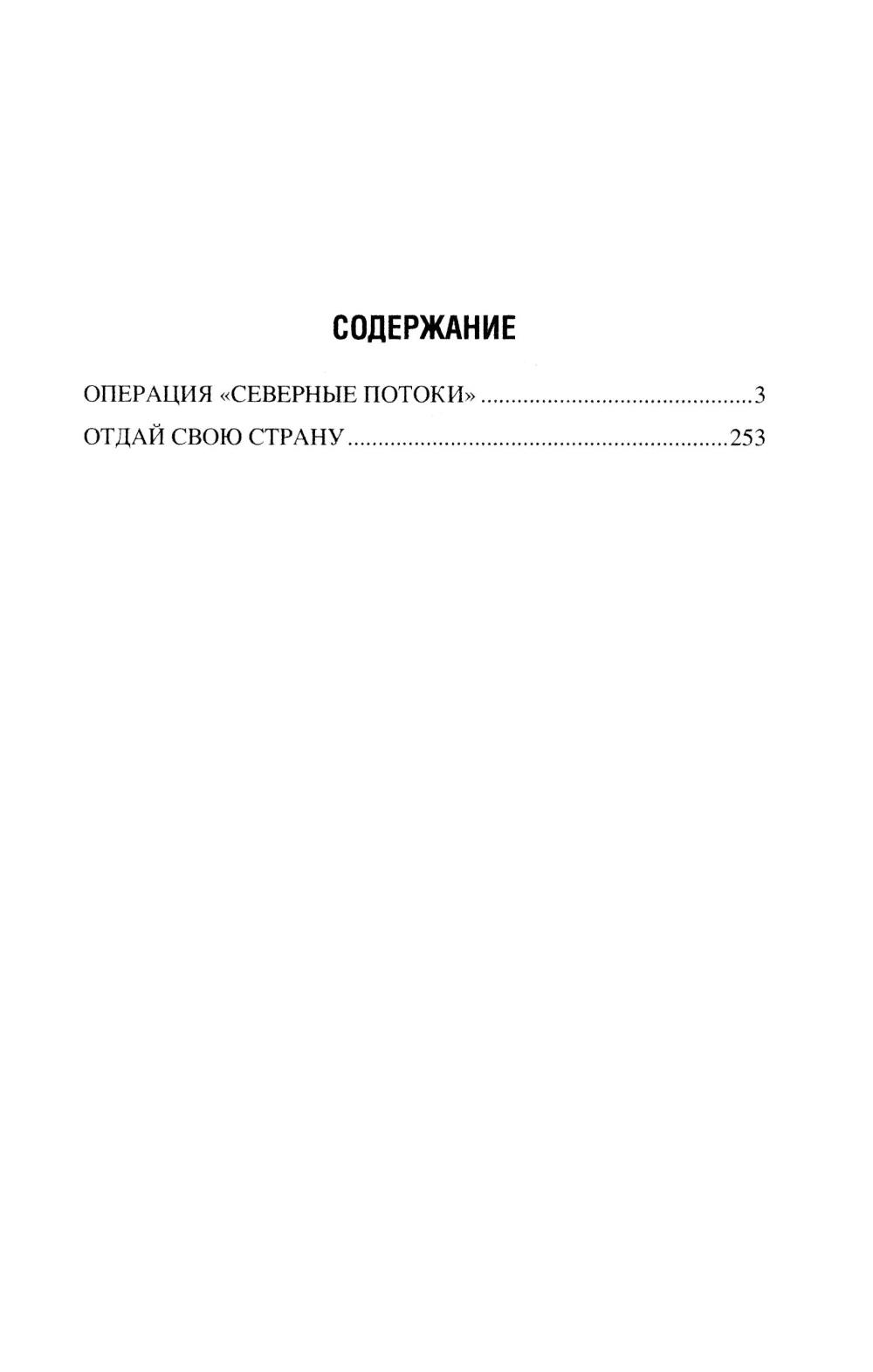 В романе «Операция "Северные потоки"» описываются события, связанные с нашумевшим диверсионным подрывом на российских газопроводах. Полковник Олег Ермилов из Департамента военной контрразведки ФСБ России со своим замом Егоровым начинает расследование после того, как в УФСБ по Черноморскому флоту в Севастополе пришел с заявлением бывший боевой пловец 73-го Морского центра специальных операций. Этот человек наводит контрразведчиков на след английской спецслужбы MI6, которая тем временем планирует новые провокации против России. Основные события романа разворачиваются в Крыму осенью 2022 года, когда Ермилов вскрывает диверсионную сеть украинской военной разведки, а отчасти занимается еще и расследованием диверсии на Крымском мосту. Роман «Отдай свою страну» посвящен событиям в Центральной Африканской Республике, Колумбии и Конго. Главный герой романа - агент российской разведки Марио Санчес, завербованный еще во времена СССР и продолжающий работать в двухтысячных годах. Это человек непростой судьбы, порой вынужденный идти на рискованные действия. Он - участник партизанского движения ФАРК в Колумбии, который также был связан с событиями в Руанде, а в итоге обосновался в Конго, добывая информацию для Центра. Например, о поставках стратегически важных грузов в некоторые страны Африки из Китая, Франции, Бельгии и США через порт в Пуэнт-Нуаре. Его пути пересекаются с разведчиком из китайской спецслужбы «Гуанбу». Дороги России и Китая в этом регионе идут параллельными курсами!| Издательство | Вече |