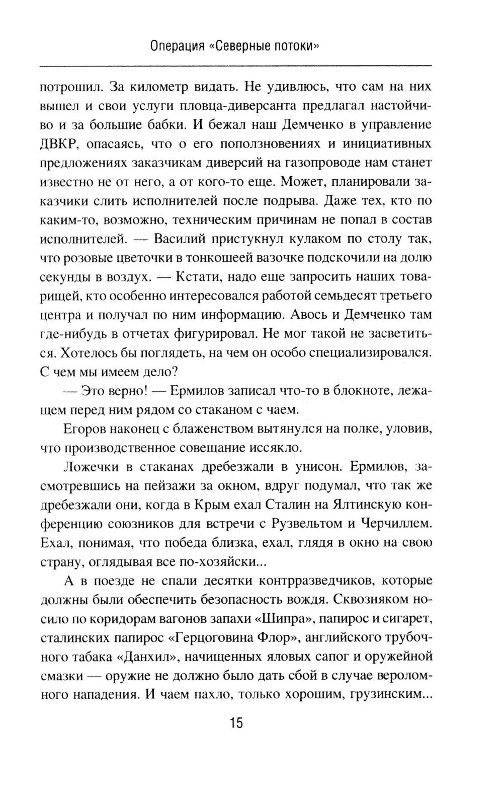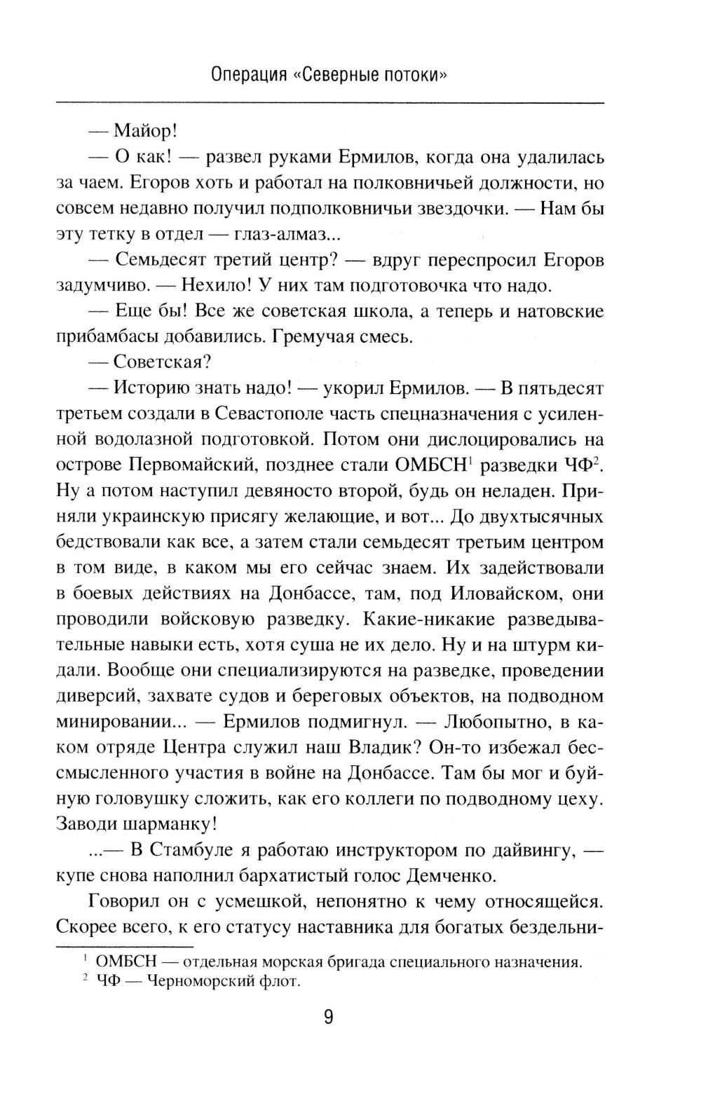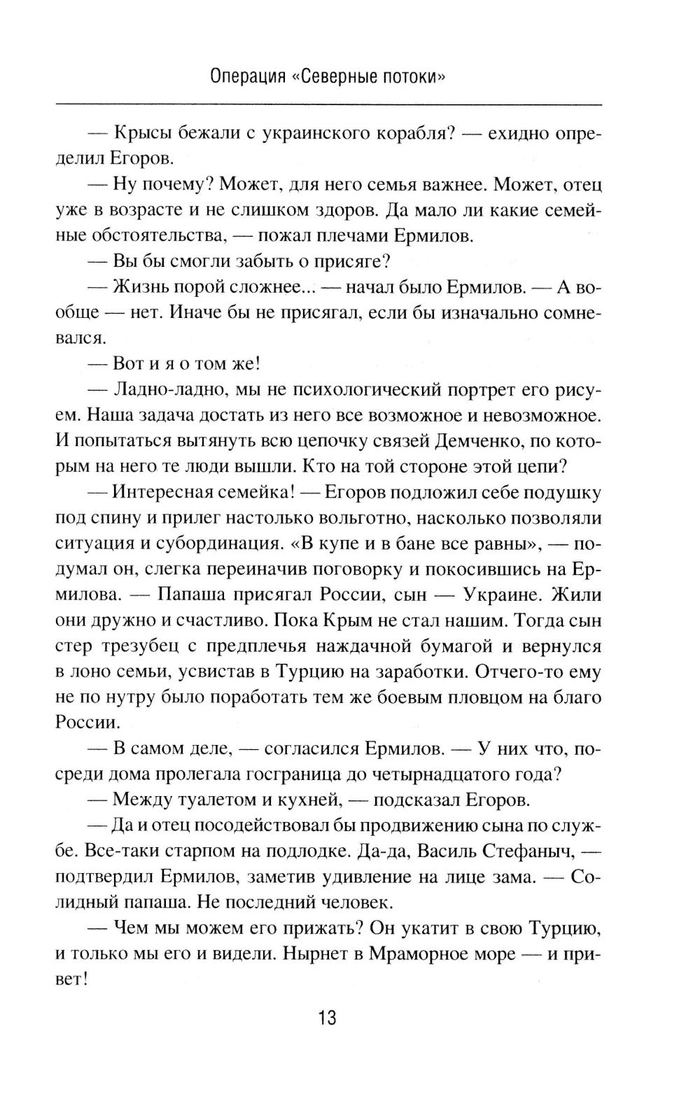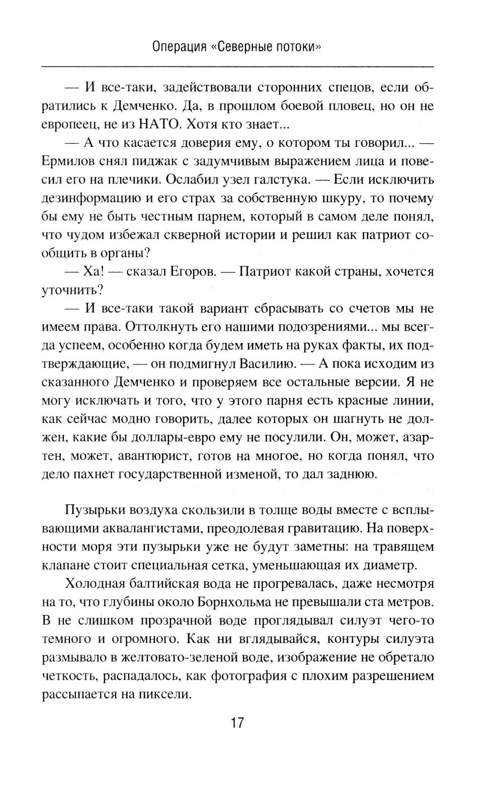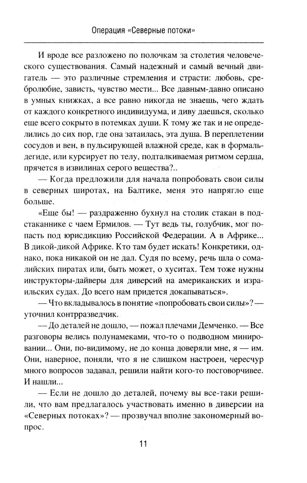 В романе «Операция "Северные потоки"» описываются события, связанные с нашумевшим диверсионным подрывом на российских газопроводах. Полковник Олег Ермилов из Департамента военной контрразведки ФСБ России со своим замом Егоровым начинает расследование после того, как в УФСБ по Черноморскому флоту в Севастополе пришел с заявлением бывший боевой пловец 73-го Морского центра специальных операций. Этот человек наводит контрразведчиков на след английской спецслужбы MI6, которая тем временем планирует новые провокации против России. Основные события романа разворачиваются в Крыму осенью 2022 года, когда Ермилов вскрывает диверсионную сеть украинской военной разведки, а отчасти занимается еще и расследованием диверсии на Крымском мосту. Роман «Отдай свою страну» посвящен событиям в Центральной Африканской Республике, Колумбии и Конго. Главный герой романа - агент российской разведки Марио Санчес, завербованный еще во времена СССР и продолжающий работать в двухтысячных годах. Это человек непростой судьбы, порой вынужденный идти на рискованные действия. Он - участник партизанского движения ФАРК в Колумбии, который также был связан с событиями в Руанде, а в итоге обосновался в Конго, добывая информацию для Центра. Например, о поставках стратегически важных грузов в некоторые страны Африки из Китая, Франции, Бельгии и США через порт в Пуэнт-Нуаре. Его пути пересекаются с разведчиком из китайской спецслужбы «Гуанбу». Дороги России и Китая в этом регионе идут параллельными курсами!| Издательство | Вече |