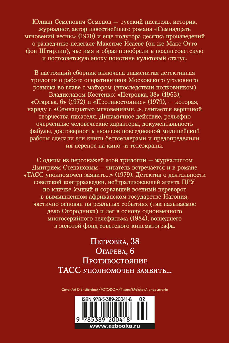 Юлиан Семенович Семенов - русский писатель, историк, журналист, автор знаменитого романа "Семнадцать мгновений весны" (1970) и еще полутора десятка произведений о разведчике-нелегале Максиме Исаеве (он же Макс Отто фон Штирлиц), чье имя и образ приобрели в позднесоветскую и постсоветскую эпоху поистине культовый статус. Однако, помимо романов о Штирлице, Ю. Семеновым написано несколько прозаических циклов с участием других героев - в том числе включенная в настоящий сборник детективная трилогия о работе оперативников Московского уголовного розыска во главе с майором (впоследствии полковником) Владиславом Костенко: "Петровка, 38" (1963), "Огарева, 6" (1972) и "Противостояние" (1979), считающееся, наряду с "Семнадцатью мгновениями…", вершиной творчества писателя. Динамичное действие, рельефно очерченные человеческие характеры, документальность фабулы, достоверность нюансов повседневной милицейской работы сделали эти книги бестселлерами и предопределили их перенос на кино- и телеэкраны. С одним из персонажей этой трилогии - журналистом Дмитрием Степановым - читатель встречается и в романе "ТАСС уполномочен заявить…" (1979). Детектив о деятельности советской контрразведки, нейтрализовавшей агента ЦРУ по кличке Умный и сорвавшей военный переворот в вымышленном африканском государстве Нагония, частично основан на реальных событиях (так называемое дело Огородника) и лег в основу одноименного многосерийного телефильма (1984), который, как и экранизации других книг писателя, вошел в золотой фонд советского кинематографа.| Издательство | Азбука-Аттикус Издат.группа ООО |