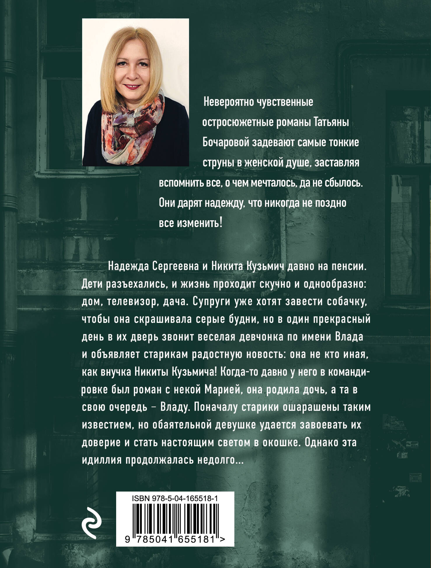 Надежда Сергеевна и Никита Кузьмич давно на пенсии. Дети разъехались, и жизнь проходит скучно и однообразно: дом, телевизор, дача. Супруги уже хотят завести собачку, чтобы она скрашивала серые будни, но в один прекрасный день в их дверь звонит веселая девчонка по имени Влада и объявляет старикам радостную новость: она не кто иная, как внучка Никиты Кузьмича! Когда-то давно у него в командировке был роман с некоей Марией, она родила дочь, а та в свою очередь - Владу. Поначалу старики ошарашены таким известием, но обаятельной девушке удается завоевать их доверие и стать настоящим светом в окошке. Однако эта идиллия продолжалась недолго… В своих романах Татьяна Бочарова синтезирует разные жанры: это и детектив, и мелодрама, и обязательно лирическая история о человеческих чувствах и переживаниях. Ее герои - простые люди, наши с вами современники, которые волею судьбы оказались в сложной ситуации. Им предстоит сделать непростой выбор, разобраться в дебрях козней и обмана, не сломаться, выстоять, помочь не только себе, но и тем, кому необходима их помощь.| Издательство | Эксмо |