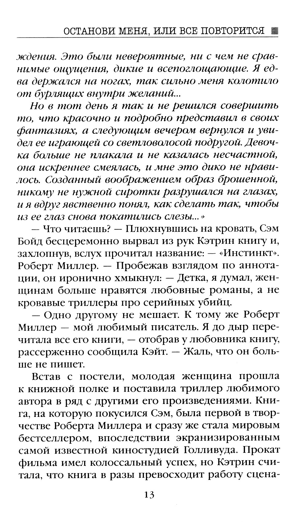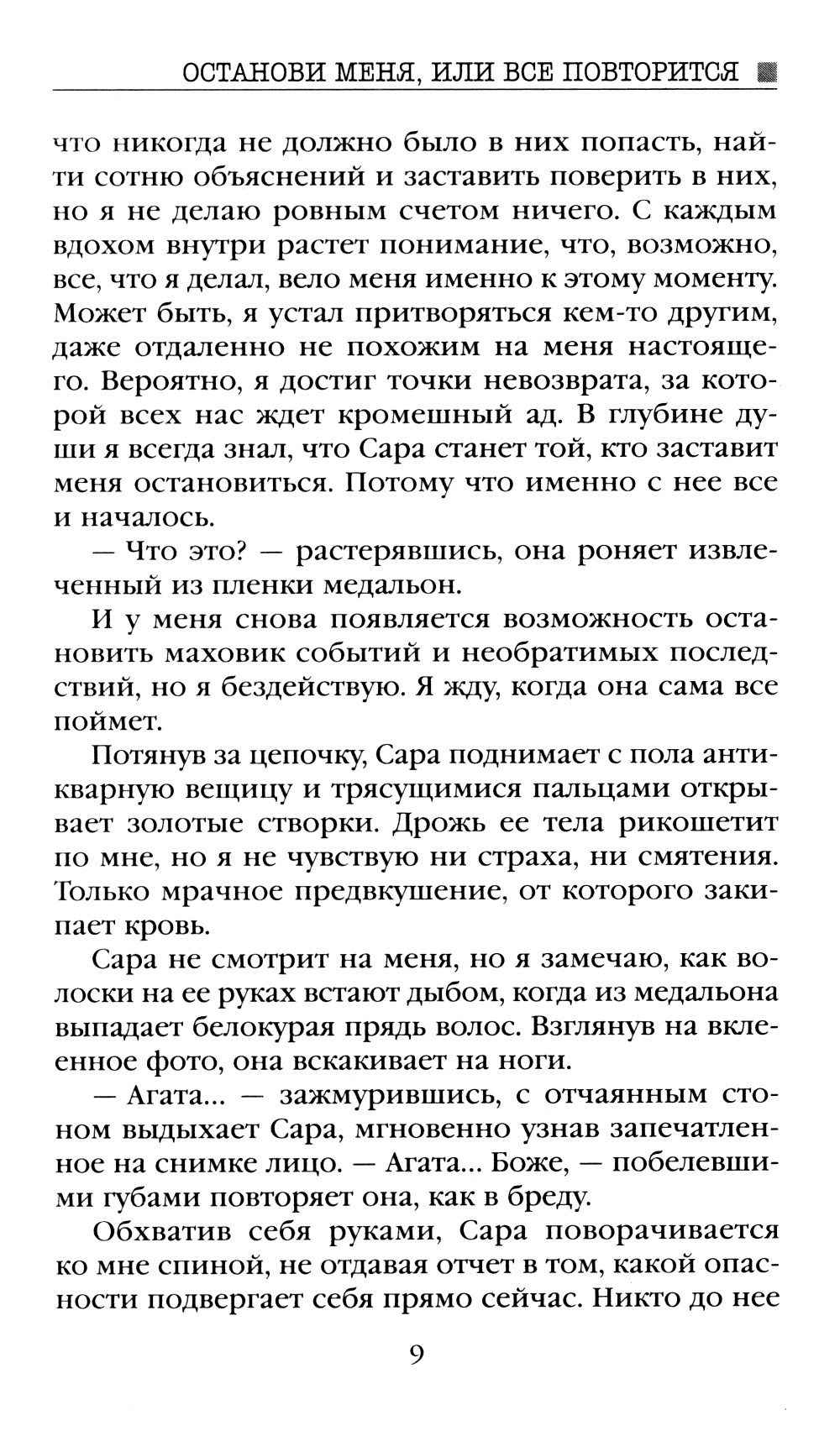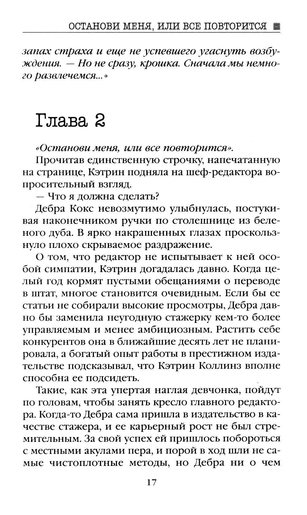 Известный писатель на пике карьеры внезапно прекращает свою творческую деятельность. В течение пяти лет из-под его пера не выходит ни одной новой книги. Несмотря на мировой успех, популярного автора никто никогда не видел в лицо. Его интересы всегда и везде представлял не менее загадочный литературный агент. Было время, когда в богемных кругах ходили слухи, что это один и тот же человек. Внештатной сотруднице крупного издательства, являющейся преданной поклонницей таинственного писателя, выпадает шанс выяснить, насколько правдивы эти домыслы. Но чтобы попасть в дом писателя в качестве личной помощницы, девушке наравне с другими претендентами придется пройти не большое испытание - написать рассказ, начинающийся со слов: «Останови меня, или все повторится».| Издательство | Яуза-каталог |