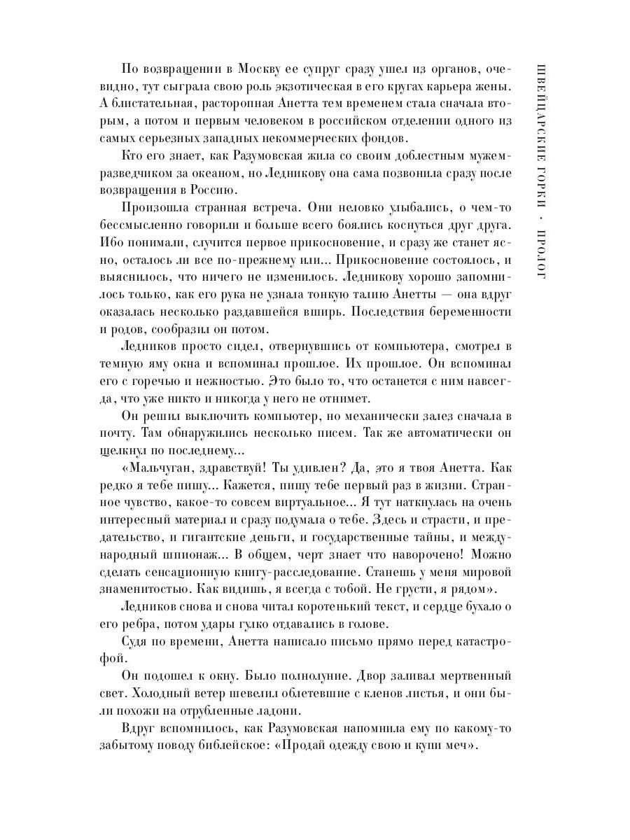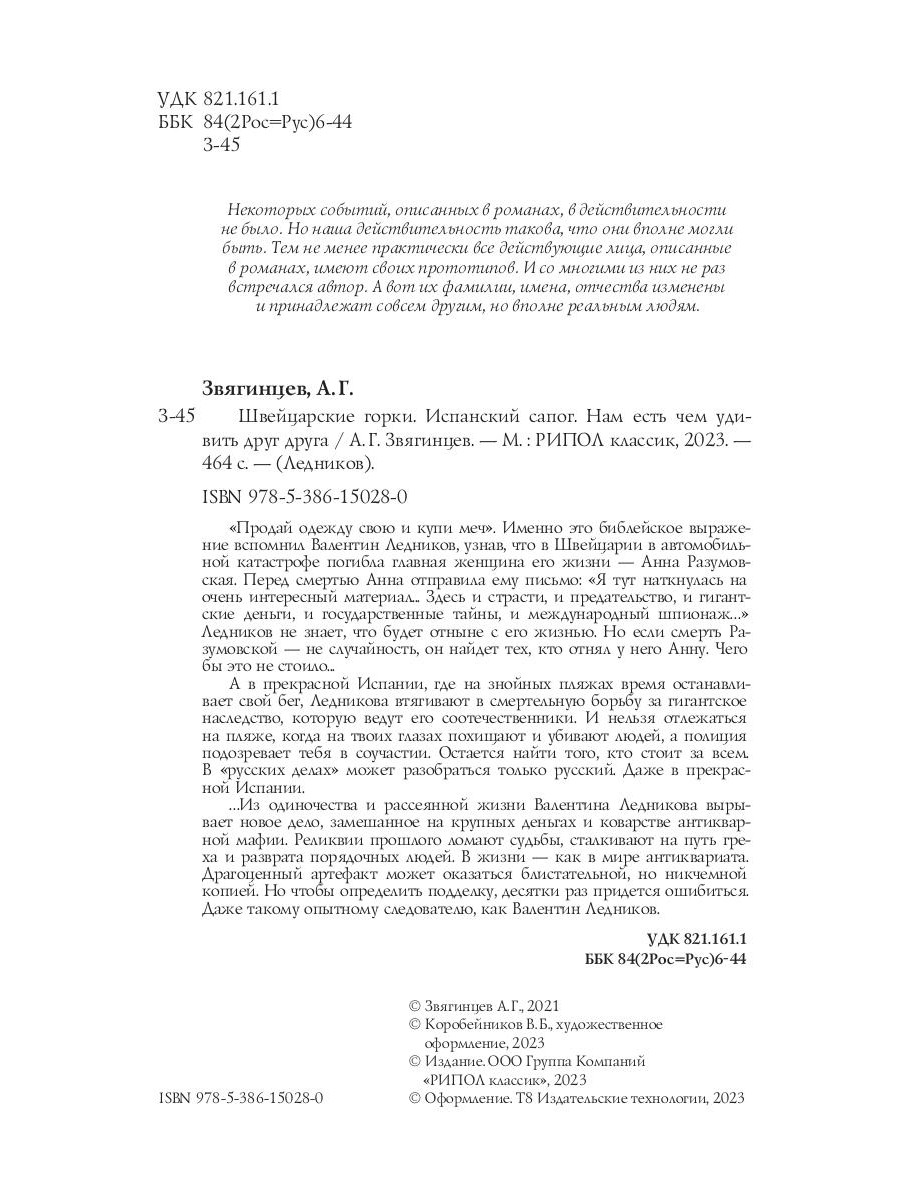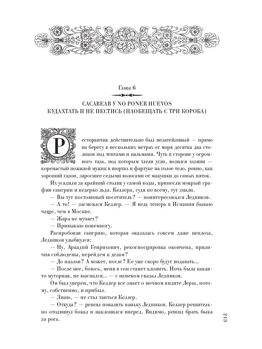 "Продай одежду свою и купи меч". Именно это библейское выражение вспомнил Валентин Ледников, когда узнал, что в Швейцарии в автомобильной катастрофе погибла главная женщина его жизни Анна Разумовская. Ибо его интуиция следователя говорила, что эта гибель не могла быть просто несчастным случаем. А потом он получил по электронной почте письмо от... Анны. Она написала его перед самой смертью. "Я тут наткнулась на очень интересный материал... Здесь и страсти, и предательство, и гигантские деньги, и государственные тайны, и международный шпионаж... В общем, черт знает что наворочено! Можно сделать сенсационную книгу-расследование. Станешь у меня мировой знаменитостью. Как видишь, я всегда с тобой. Не грусти, я рядом". Ледников не знает, что будет отныне с его жизнью. Но точно знает другое - если смерть Разумовской не случайность, он найдет тех, кто отнял у него Анну. Чего бы это не стоило. И какая разница, что будет потом... А в прекрасной Испании, где на знойных пляжах время останавливает свой бег, где пылающую паэлью запивают ледяной сангрией, а на площадях танцуют страстную сардану, Валентин Ледников, совершенно не желая того, оказывается втянут в смертельную борьбу за гигантское наследство, которую ведут его соотечественники. И нельзя отлежаться на пляже, когда на твоих глазах похищают людей, сходят с ума, убивают невинных, предают любимых, торгуют честью и профессиональным долгом, а испанская полиция подозревает тебя в соучастии. У него есть один выход - найти того, кто стоит за всем. И сделать это больше некому. В "русских делах" может разобраться только русский. Даже в прекрасной Испании... ...Из одиночества и рассеянной жизни Валентина Ледникова вырывает новое дело, замешанное на крупных деньгах, проституции и коварстве антикварной мафии. Портрет Державина, уникальный Константиновский рубль - созидательные реликвии далекого прошлого, рушат современную жизнь: ломают судьбы, уничтожают репутации, сталкивают на путь греха и разврата людей, в чью верность и чистоту верили близкие. В жизни - как в мире антиквариата. Драгоценный артефакт может оказаться блистательной, но никчемной копией. Но чтобы с легкостью определить подделку с первого взгляда, десятки раз придется ошибиться. Даже такому опытному следователю, как Валентин Ледников.| Издательство | Рипол Классик |