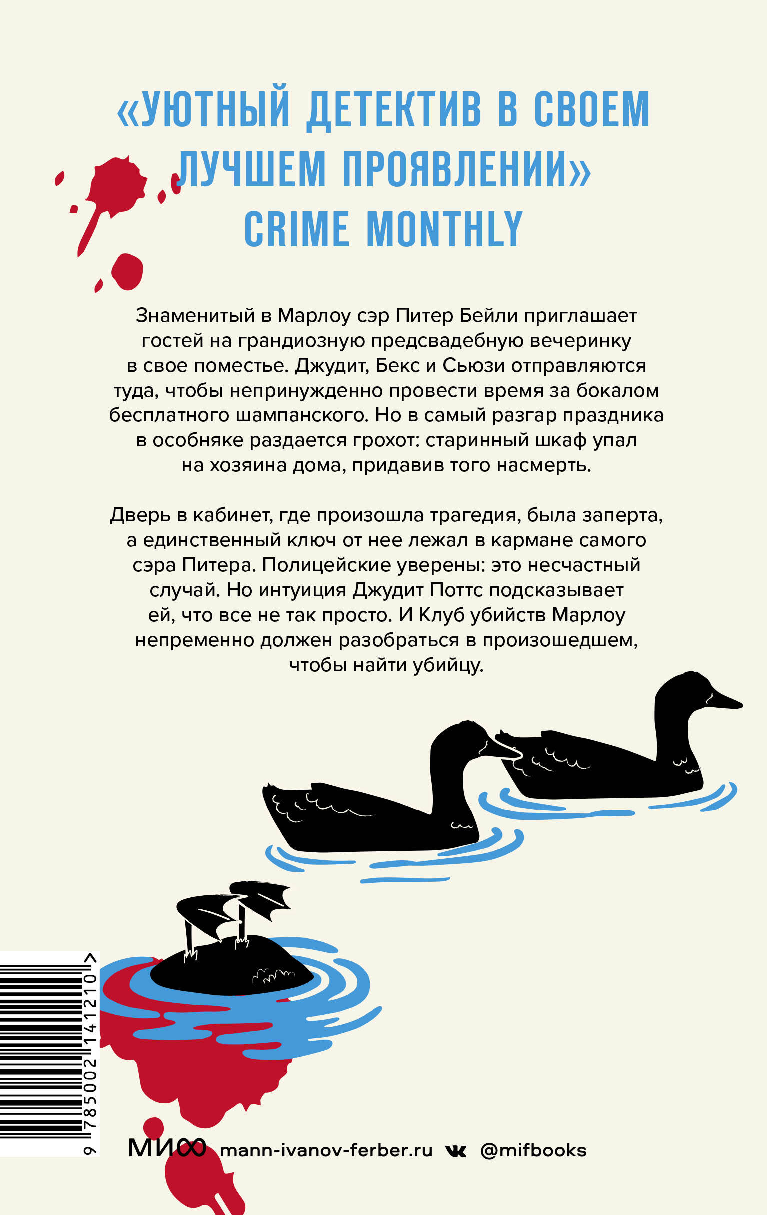 Знаменитый в Марлоу сэр Питер Бейли приглашает гостей на грандиозную предсвадебную вечеринку в свое поместье. Джудит, Бекс и Сьюзи отправляются туда, чтобы непринужденно провести время за бокалом бесплатного шампанского. Но в самый разгар праздника в особняке раздается грохот: старинный шкаф упал на хозяина дома, придавив того насмерть. Дверь в кабинет, где произошла трагедия, была заперта, а единственный ключ от нее лежал в кармане самого сэра Питера. Полицейские уверены: это несчастный случай. Но интуиция Джудит Поттс подсказывает ей, что все не так просто. И Клуб убийств Марлоу непременно должен разобраться в произошедшем, чтобы найти убийцу. Для кого эта книга: Для любителей английского юмора и детективов. Для тех, кто соскучился по приключениям знаменитого Клуба убийств Марлоу. Для всех, кто хочет весело провести время за чтением и помочь английским леди раскрыть преступления. Для читателей, которым интересно узнать, как бы писала Агата Кристи, если бы жила в XXI веке. Для читателей "Клуба убийств по четвергам".