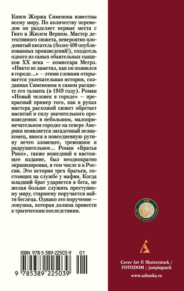 "Никто не заметил, как он появился в городе…" - этими словами открывается увлекательная история, созданная классиком французской детективной литературы Жоржем Сименоном в самом расцвете его таланта (в 1949 году). Роман "Новый человек в городе" - прекрасный пример того, как в руках мастера расхожий сюжет обретает масштаб и силу значительного произведения: в небольшом, малопримечательном городке на севере Америки появляется загадочный незнакомец, внося в повседневную рутину нечто зловещее, тревожное и разрушительное… Роман "Братья Рико", также вошедший в настоящее издание, был неоднократно экранизирован, в том числе и в России. Это история трех братьев, состоящих на службе у мафии. Когда младший брат ударяется в бега, не желая больше служить преступному миру, старшему поручается найти беглеца. Однако это поручение - ловушка, которая должна привести к трагическим последствиям.| Издательство | Азбука-Аттикус Издат.группа ООО |