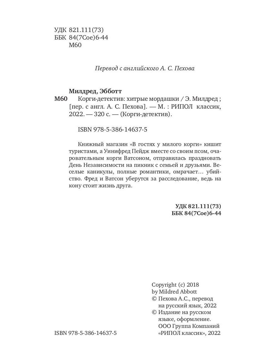 Книжный магазин «В гостях у милого корги» кишит туристами, а Уинифред Пейдж вместе со своим псом, очаровательным корги Ватсоном, отправилась праздновать День Независимости на пикник с семьей и друзьями. Веселые каникулы, полные романтики, омрачает... убийство. Фред и Ватсон уберутся за расследование, ведь на кону стоит жизнь друга.| Издательство | Рипол Классик |
