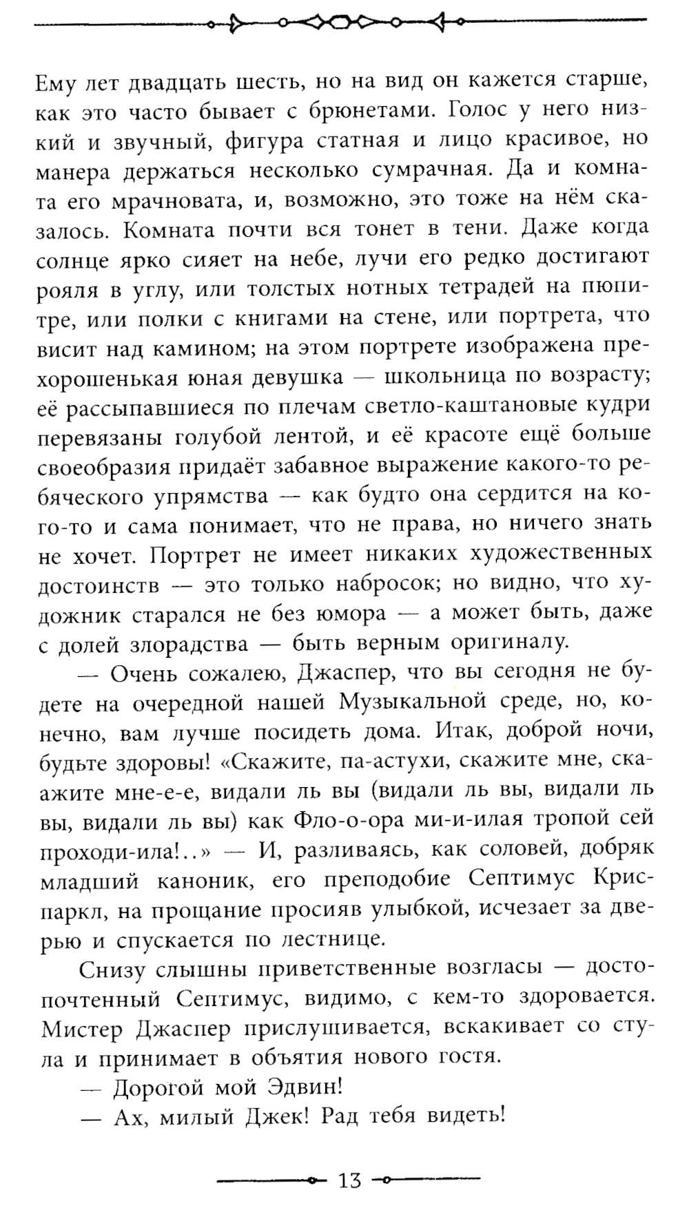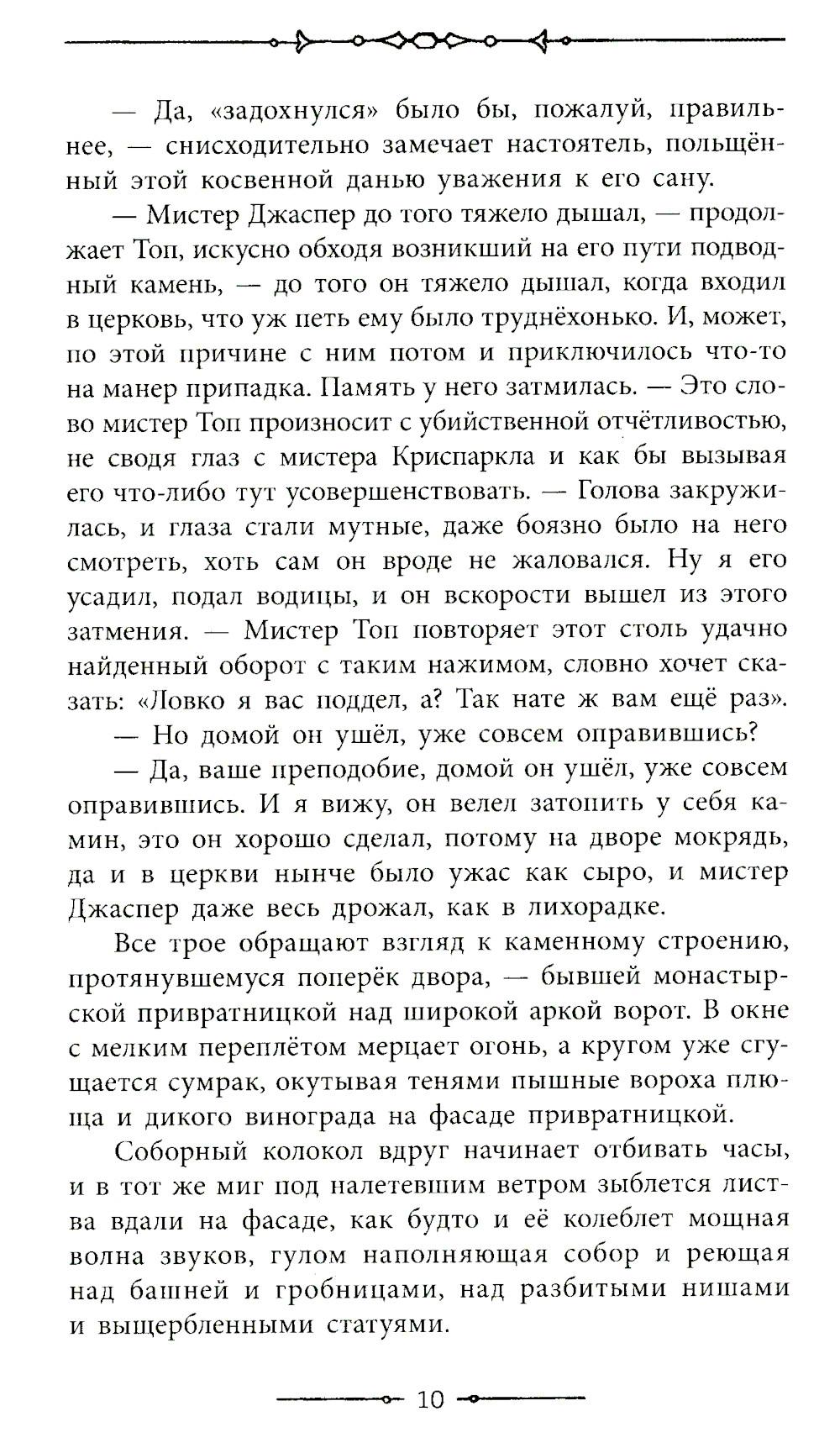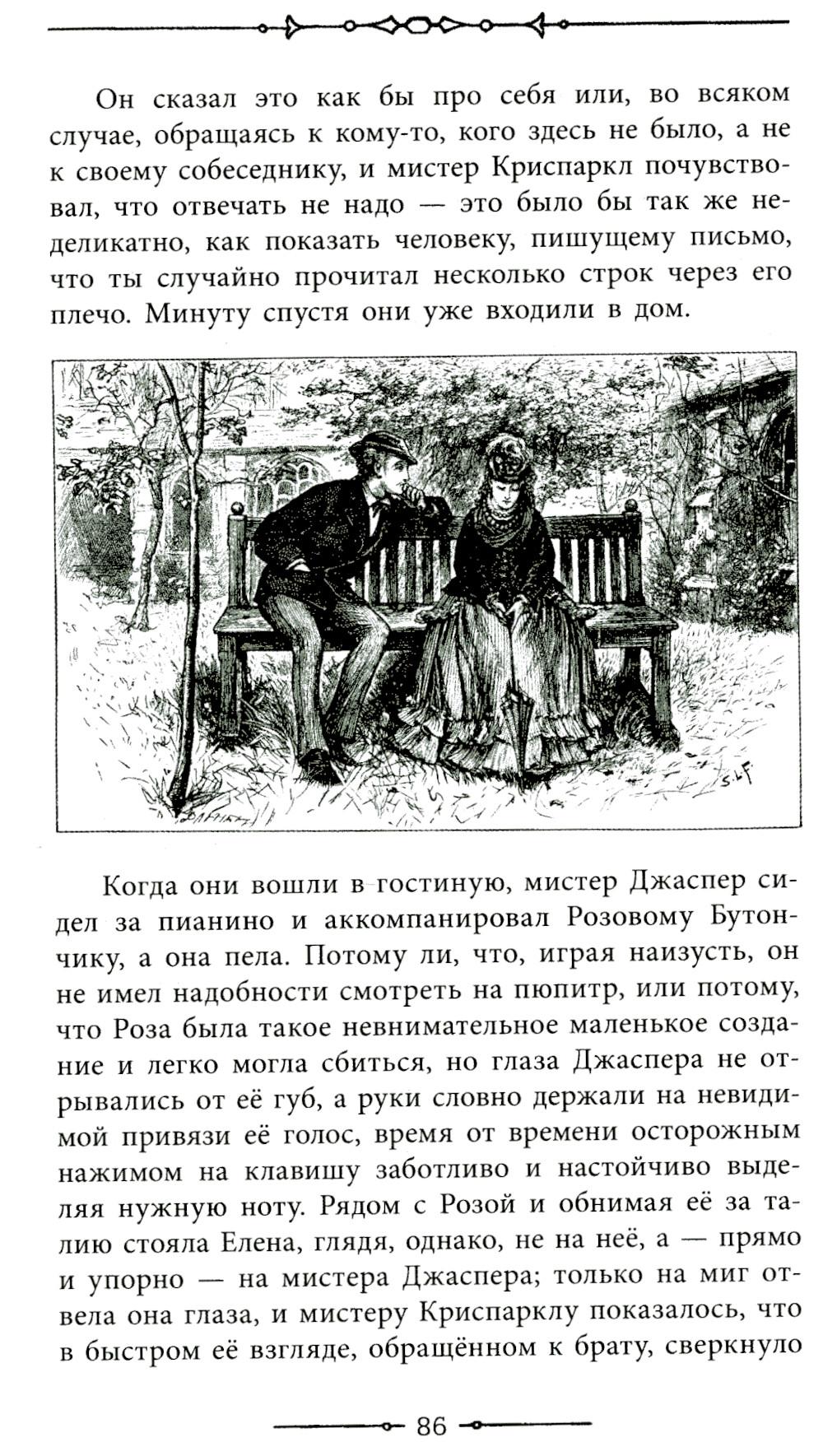 «Тайна Эдвина Друда» - великолепный психологический детектив, полный загадочных событий. Читатель оказывается вовлечен в поиски разгадки исчезновения главного героя, и ответ ему придется найти самостоятельно, ведь этот последний роман Диккенс так и не завершил. До сих пор тайна Эдвина Друда не разгадана и вызывает множество предположений и споров. В оформлении использованы оригинальные иллюстрации Люка Филдса.