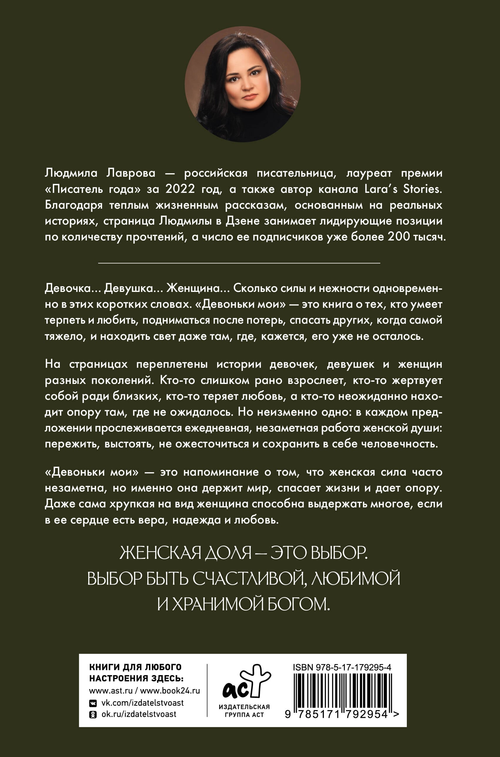 Девочка… Девушка… Женщина… Сколько силы и нежности одновременно в этих коротких словах. "Девоньки мои" - это книга о тех, кто умеет терпеть и любить, подниматься после потерь, спасать других, когда самой тяжело, и находить свет даже там, где, кажется, его уже не осталось. На страницах переплетены истории девочек, девушек и женщин разных поколений. Кто-то слишком рано взрослеет, кто-то жертвует собой ради близких, кто-то теряет любовь, а кто-то неожиданно находит опору там, где не ожидалось. Но неизменно одно: в каждом предложении прослеживается ежедневная, незаметная работа женской души: пережить, выстоять, не ожесточиться и сохранить в себе человечность. "Девоньки мои" - это напоминание о том, что женская сила часто незаметна, но именно она держит мир, спасает жизни и дает опору. Даже сама хрупкая на вид женщина способна выдержать многое, если в ее сердце есть вера, надежда и любовь. Женская доля - это выбор. Выбор быть счастливой, любимой и хранимой Богом.| Издательство | Издательство "АСТ" |