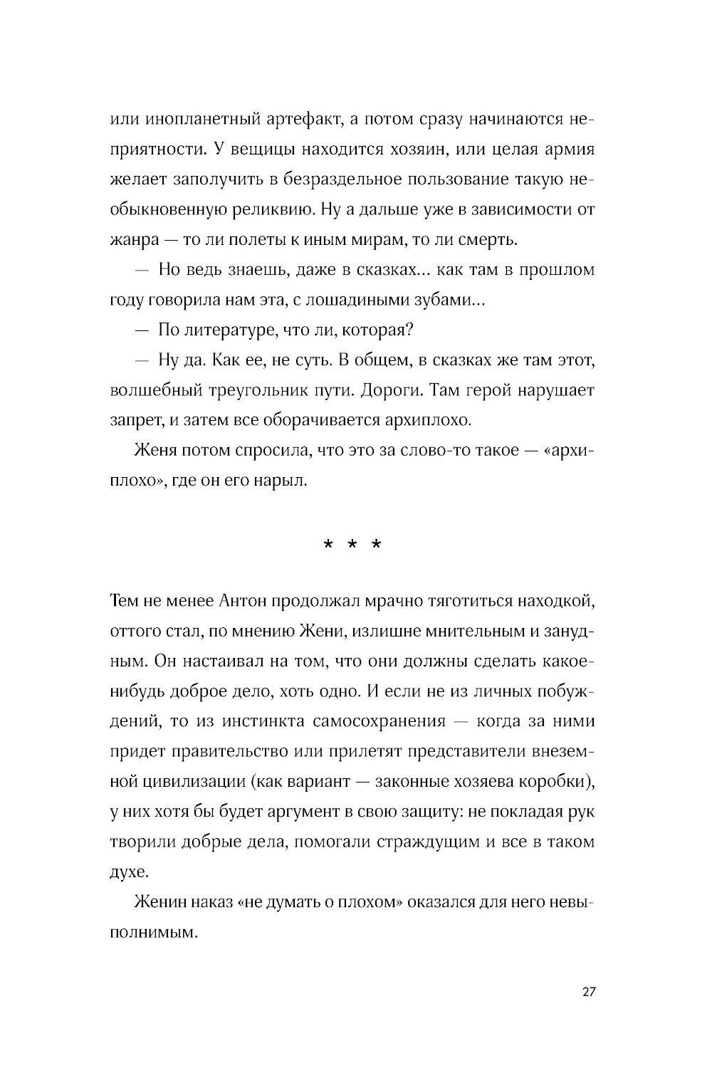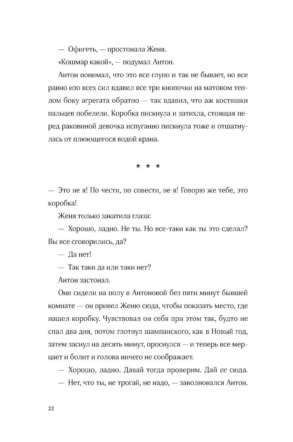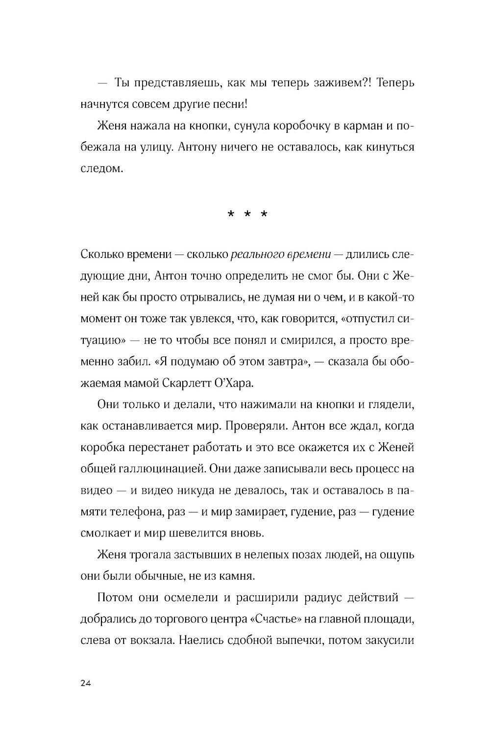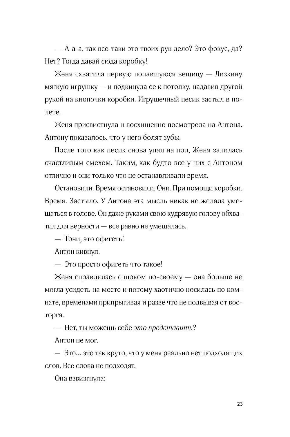 Антон и Женя живут по соседству в тихом провинциальном городке и с детства обожают всевозможные розыгрыши. Волей случая друзья становятся обладателями невероятного прибора - пульта по управлению временем. Мир теперь можно поставить на паузу, а потом запустить снова! Но почему-то только что тебе было четырнадцать, а сейчас - все двадцать пять, мама тебя не узнает и где-то рядом рыщут жуткие существа, крадущие годы жизни. Еще вчера самым страшным событием для Антона был предстоящий переезд. А теперь он в центре детективной истории с погонями, тайнами и даже убийством. И времени остается все меньше....| Издательство | Альпина Паблишер |