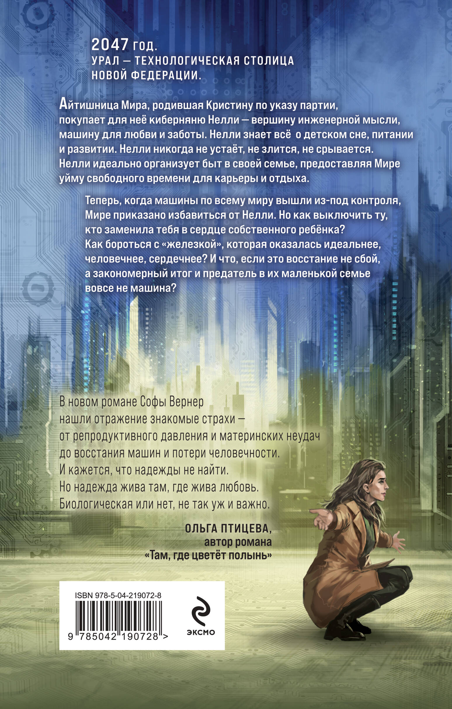 2047 год. Урал - технологическая столица новой Федерации. Айтишница Мира, родившая Кристину по указу партии, покупает для неё киберняню Нелли - вершину инженерной мысли, машину для любви и заботы. Нелли знает всё о детском сне, питании и развитии. Нелли никогда не устаёт, не злится, не срывается. Нелли идеально организует быт в своей семье, предоставляя Мире уйму свободного времени для карьеры и отдыха. Теперь, когда машины по всему миру вышли из-под контроля, Мире приказано избавиться от Нелли. Но как выключить ту, кто заменила тебя в сердце собственного ребёнка? Как бороться с "железкой", которая оказалась идеальнее, человечнее, любящее? И что, если это восстание не сбой, а закономерный итог, и предатель в их маленькой семье - вовсе не машина? В новом романе Софы Вернер нашли отражение знакомые страхи - от репродуктивного давления и материнских неудач до восстания машин и потери человечности. И кажется, что надежды не найти. Но надежда жива там, где жива любовь. Биологическая или нет, не так уж и важно. Ольга Птицева, автор романа "Там, где цветет полынь"| Издательство | ООО "Издательство "Эксмо" |