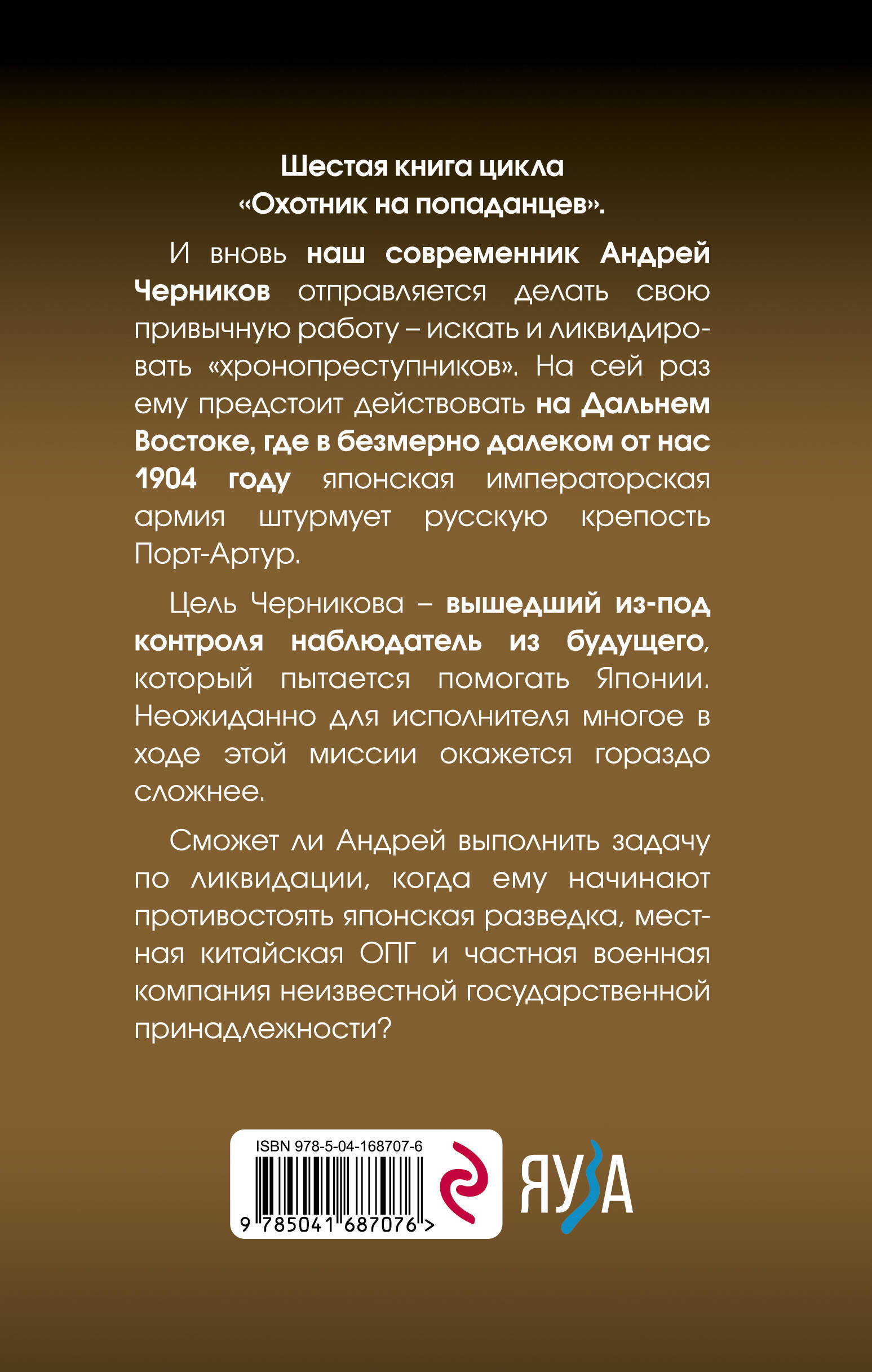 Шестая книга цикла «Охотник на попаданцев». И вновь наш современник Андрей Черников отправляется делать свою привычную работу - искать и ликвидировать «хронопреступников». На сей раз ему предстоит действовать на Дальнем Востоке, где в безмерно далёком от нас 1904 году японская императорская армия штурмует русскую крепость Порт-Артур. Цель Черникова - вышедший из-под контроля наблюдатель из будущего, который пытается помогать Японии. Неожиданно для исполнителя, многое в ходе этой миссии окажется гораздо сложнее. Сможет ли Андрей выполнить задачу по ликвидации, когда ему начинают противостоять японская разведка, местная китайская ОПГ и частная военная компания неизвестной государственной принадлежности?