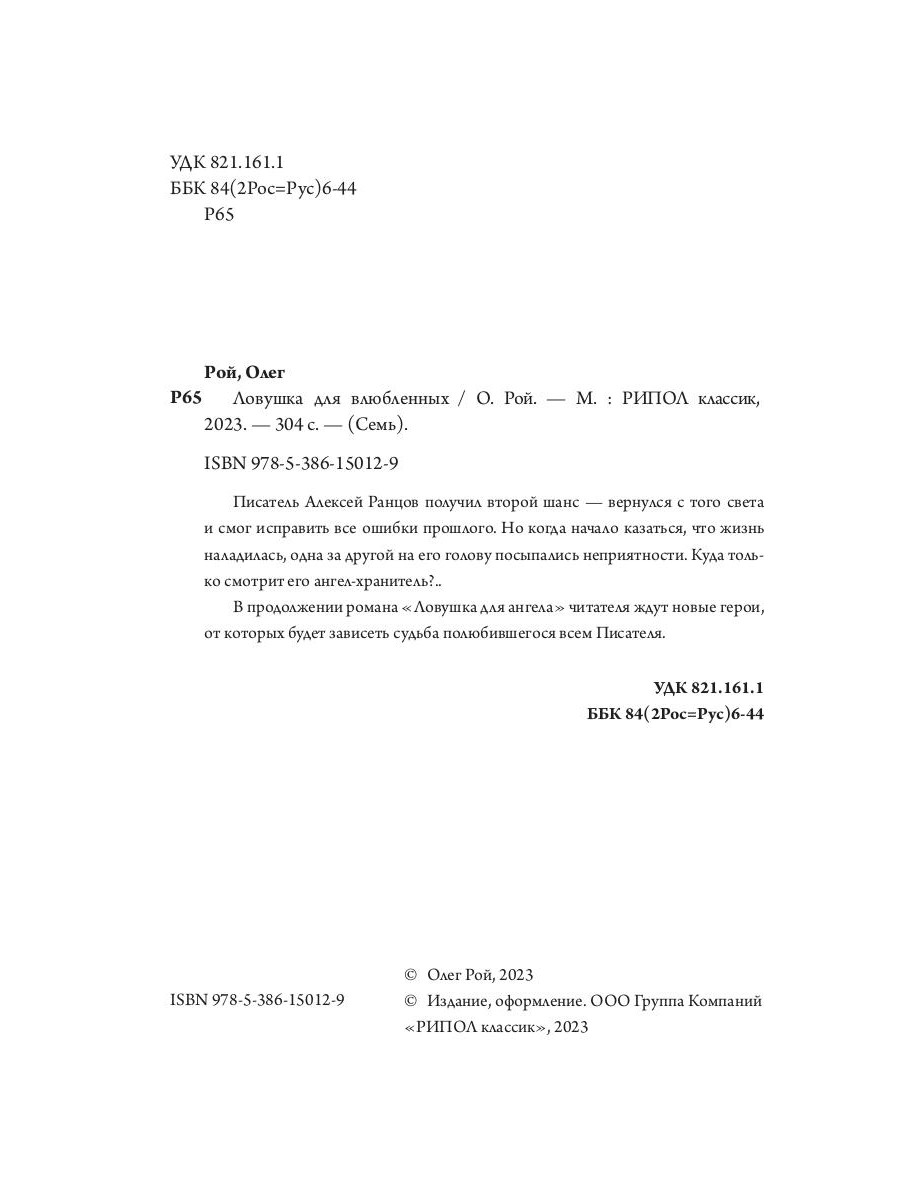Писатель Алексей Ранцов получил второй шанс - вернулся с того света и смог исправить все ошибки прошлого. Но когда начало казаться, что жизнь наладилась, одна за другой на его голову посыпались неприятности. Куда только смотрит его ангел-хранитель?.. В продолжении романа "Ловушка для ангела" читателя ждут новые герои, от которых будет зависеть судьба полюбившегося всем Писателя.| Издательство | Рипол Классик |