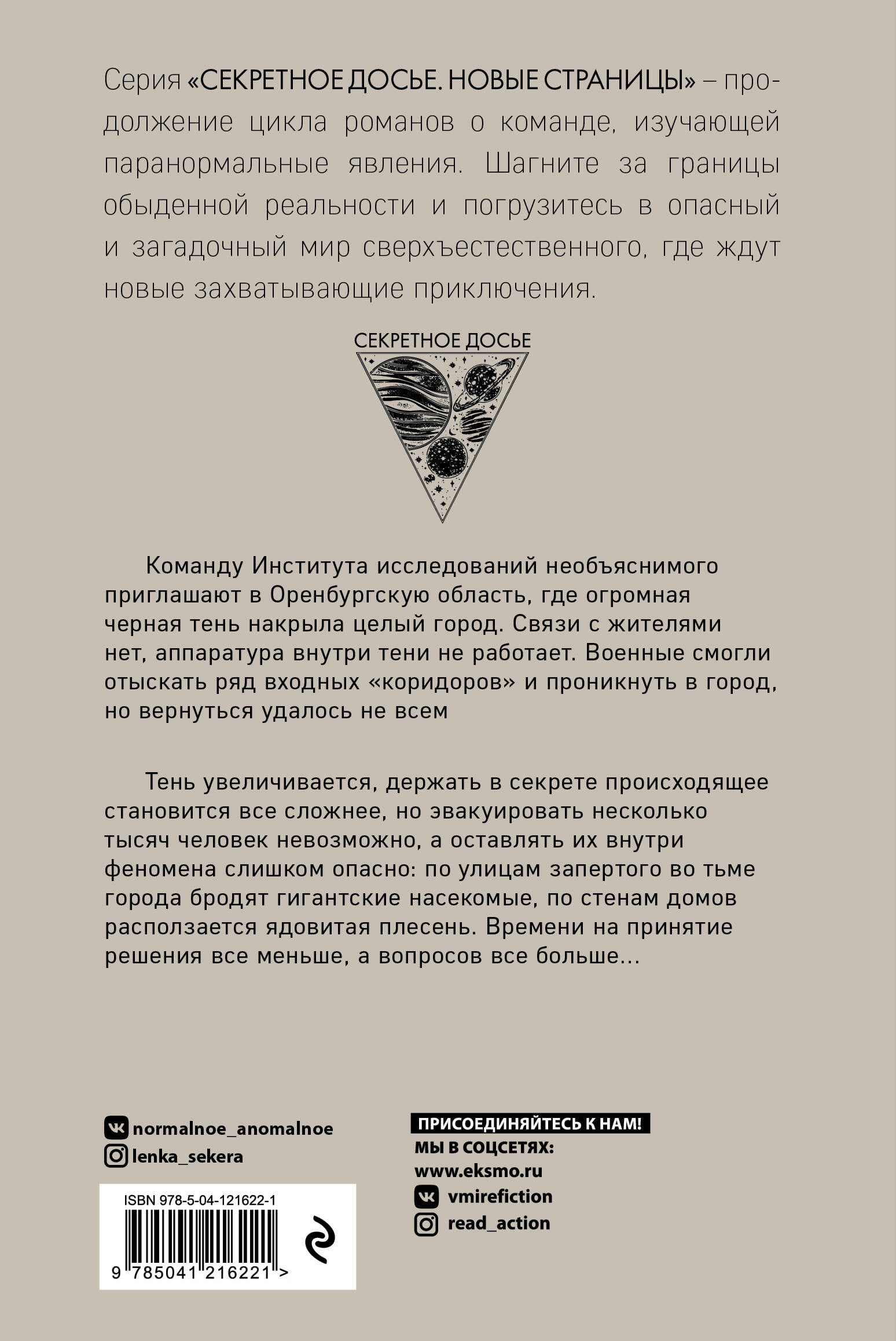 Команду Института исследований необъяснимого приглашают в Оренбургскую область, где огромная черная тень накрыла целый город. Связи с жителями нет, аппаратура внутри тени не работает. Военные смогли отыскать ряд входных «коридоров» и проникнуть в город, но вернуться удалось не всем. Тень увеличивается, держать в секрете происходящее становится все сложнее, но эвакуировать несколько тысяч человек невозможно, а оставлять их внутри феномена слишком опасно: по улицам запертого во тьме города бродят гигантские насекомые, по стенам домов расползается ядовитая плесень. Времени на принятие решения все меньше, а вопросов все больше… У цикла «Секретное досье» уже есть целая армия фанатов. Суммарный тираж серии составляет более 100 000 книг! Новый мистический детектив, который точно заставит обострить все чувства, прислушаться к шороху за дверью и надеяться, что команда ИИН придет и к тебе на помощь.