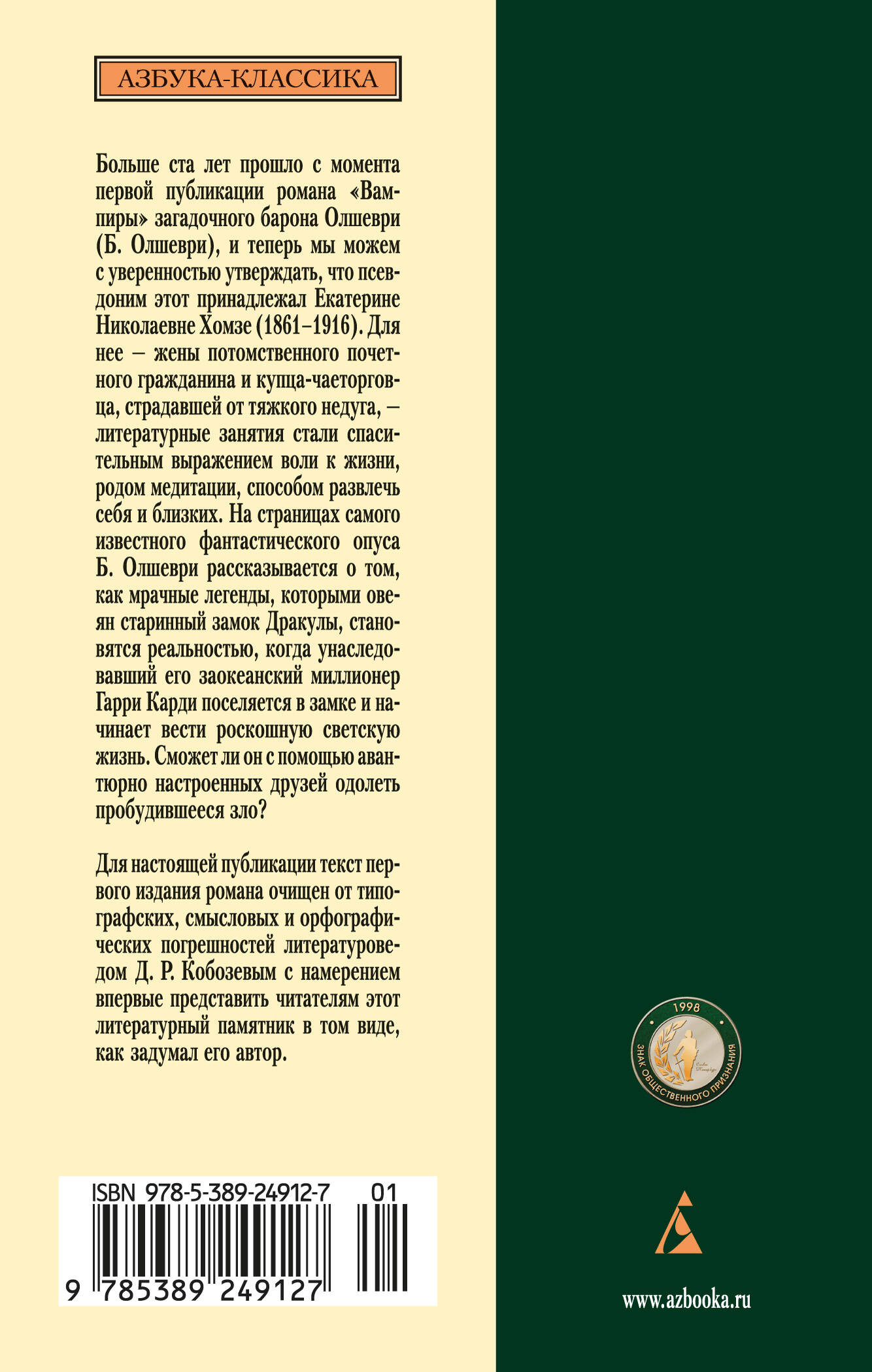 Больше ста лет прошло с момента первой публикации романа "Вампиры" загадочного барона Олшеври (Б. Олшеври), и теперь мы можем с уверенностью утверждать, что псевдоним этот принадлежал Екатерине Николаевне Хомзе (1861-1916). Для нее - жены потомственного почетного гражданина и купца-чаеторговца, страдавшей от тяжкого недуга, - литературные занятия стали спасительным выражением воли к жизни, родом медитации, способом развлечь себя и близких. На страницах самого известного фантастического опуса Б. Олшеври рассказывается о том, как мрачные легенды, которыми овеян старинный замок Дракулы, становятся реальностью, когда унаследовавший его заокеанский миллионер Гарри Карди поселяется в замке и начинает вести роскошную светскую жизнь. Сможет ли он с помощью авантюрно настроенных друзей одолеть пробудившееся зло? Для настоящей публикации текст первого издания романа очищен от типографских, смысловых и орфографических погрешностей литературоведом Д. Р. Кобозевым с намерением впервые представить читателям этот литературный памятник в том виде, как задумал его автор.