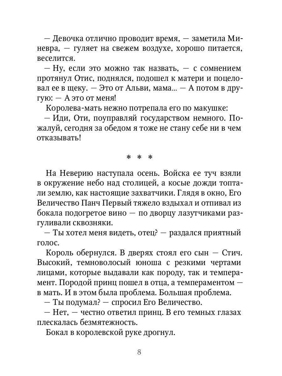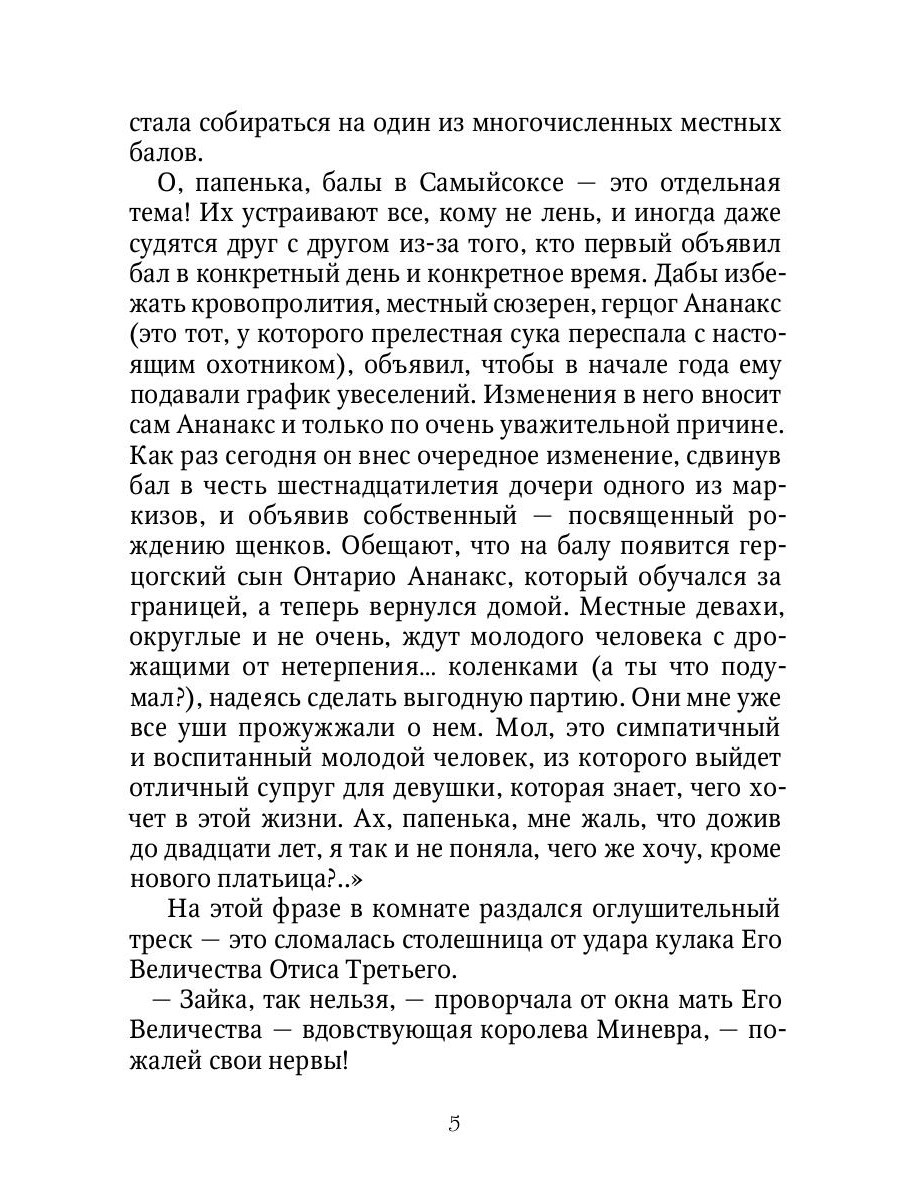 Самыйсокс - классический образец провинциального городка с патриархальным сонным укладом. Его Величество Отис Кармодонский недаром сослал именно сюда непослушную дочь, лишив ее столичных развлечений. У принцессы Альвины прескверный характер. В городке ей скучно, и она веселится, как может, то изводя тетушку, у которой проживает, то являясь в неподобающем виде на балы и приемы, которые устраивает местный сюзерен - герцог Ананакс, то бегая по окрестностям наперегонки с ветром и вопреки всем запретам. Но ситуация меняется после возвращения с чужбины герцогского сына Онтарио. И становится еще запутаннее, когда в Самыйсоксе останавливается кортеж Его Высочества Стича Неверийского, приглашенного в столицу Кармодона на празднование Дня рождения короля Отиса.| Издательство | Т8 RUGRAM |
