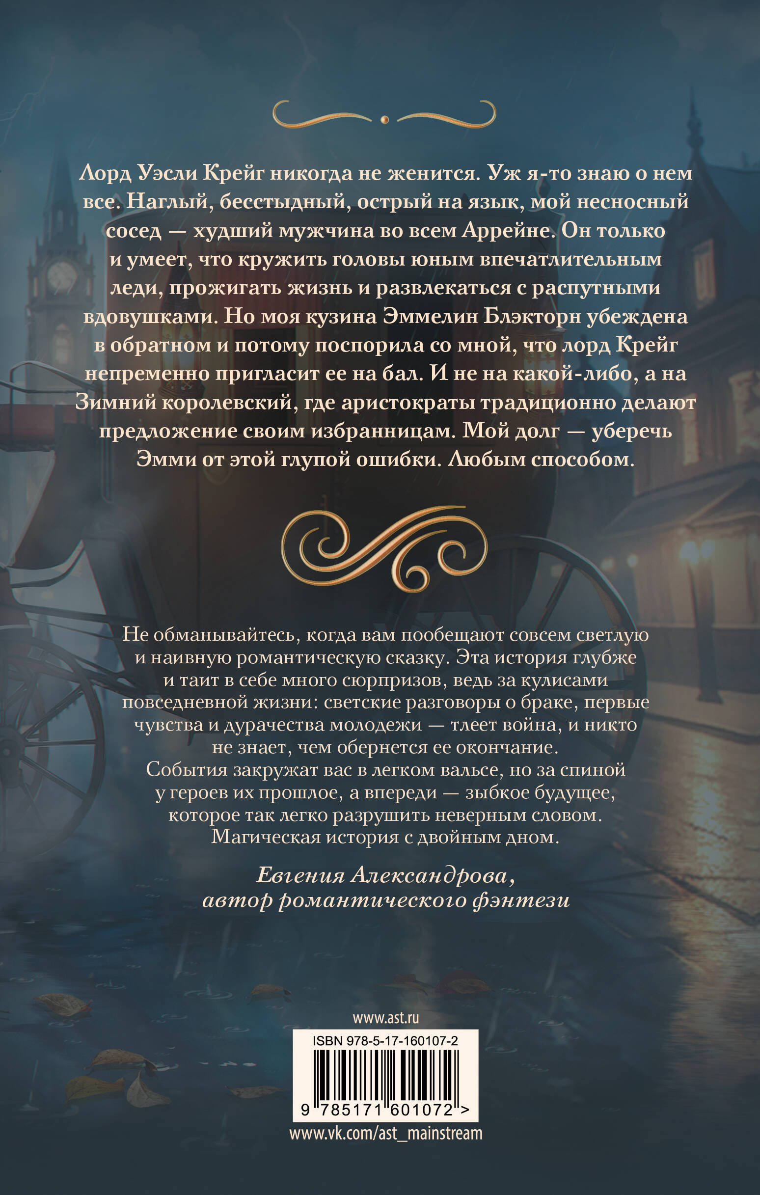Лорд Уэсли Крейг никогда не женится. Уж я-то знаю о нем все. Наглый, бесстыдный, острый на язык, мой несносный сосед - худший мужчина во всем Аррейне. Он только и умеет, что кружить головы юным впечатлительным леди, прожигать жизнь и развлекаться с распутными вдовушками. Но моя кузина Эммелин Блэкторн убеждена в обратном и потому поспорила со мной, что лорд Крейг непременно пригласит ее на бал. И не на какой-либо, а на Зимний королевский, где аристократы традиционно делают предложение своим избранницам. Мой долг - уберечь Эмми от этой глупой ошибки. Любым способом.| Издательство | Издательство "АСТ" |