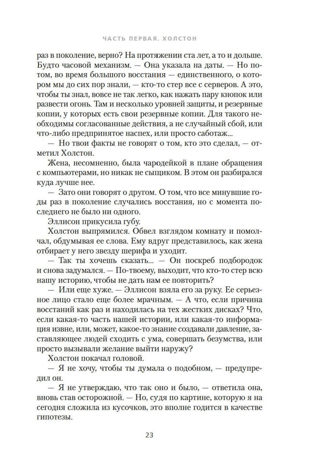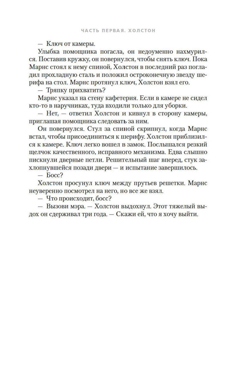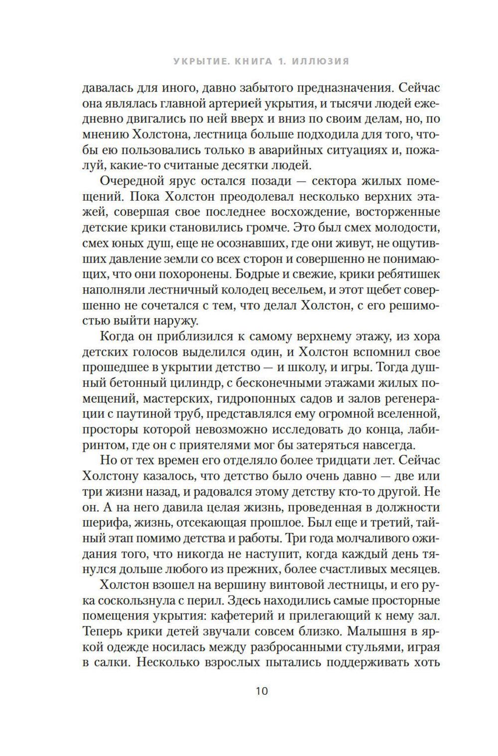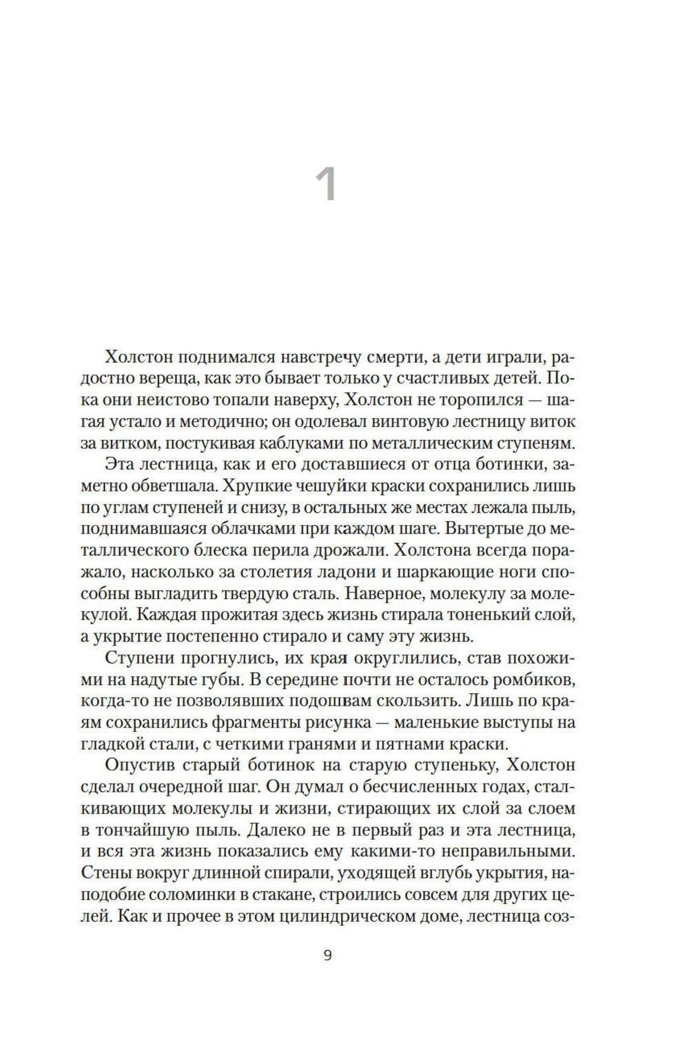 Постапокалиптический мир. Люди живут в огромнейшем искусственном бункере-укрытии. Из поколения в поколение. Выход наверх, наружу смертельно опасен. «Добровольцы», которые отправляются время от времени на очистку, то есть протирать линзы камер наружного наблюдения, быстро умирают. Жизнь в укрытии строго регламентирована. Кастовая система. Если ты носильщик, то никто другой не имеет права переносить грузы с уровня на уровень. Если ты работаешь на генераторе, поставляющем энергию на все уровни, то не можешь заниматься ничем иным. А уж тем более если работаешь в секторе АйТи, святая святых системы, главном поставщике информации об окружающем мире. Правда, никто не знает, так ли уж правдива поставляемая сектором информация, а персонал АйТи не допускает посторонних в свои владения... В ноябре 2024 года состоялась премьера второго сезона телесериала «Укрытие», снятого по роману Хауи. В главных ролях: Ребекка Фергюсон («Дюна») и Тим Роббинс («Побег из Шоушенка»). Сериал приобрел огромную популярность, получил высокие рейтинги и уже продлен на третий и четвертый сезоны. Книгу дополняет рассказ автора о съемках экранизации.