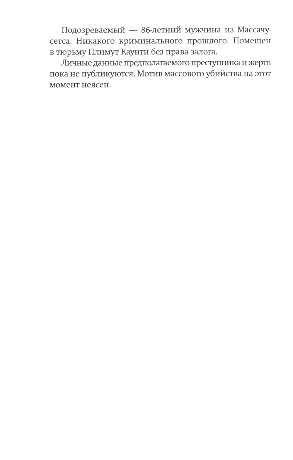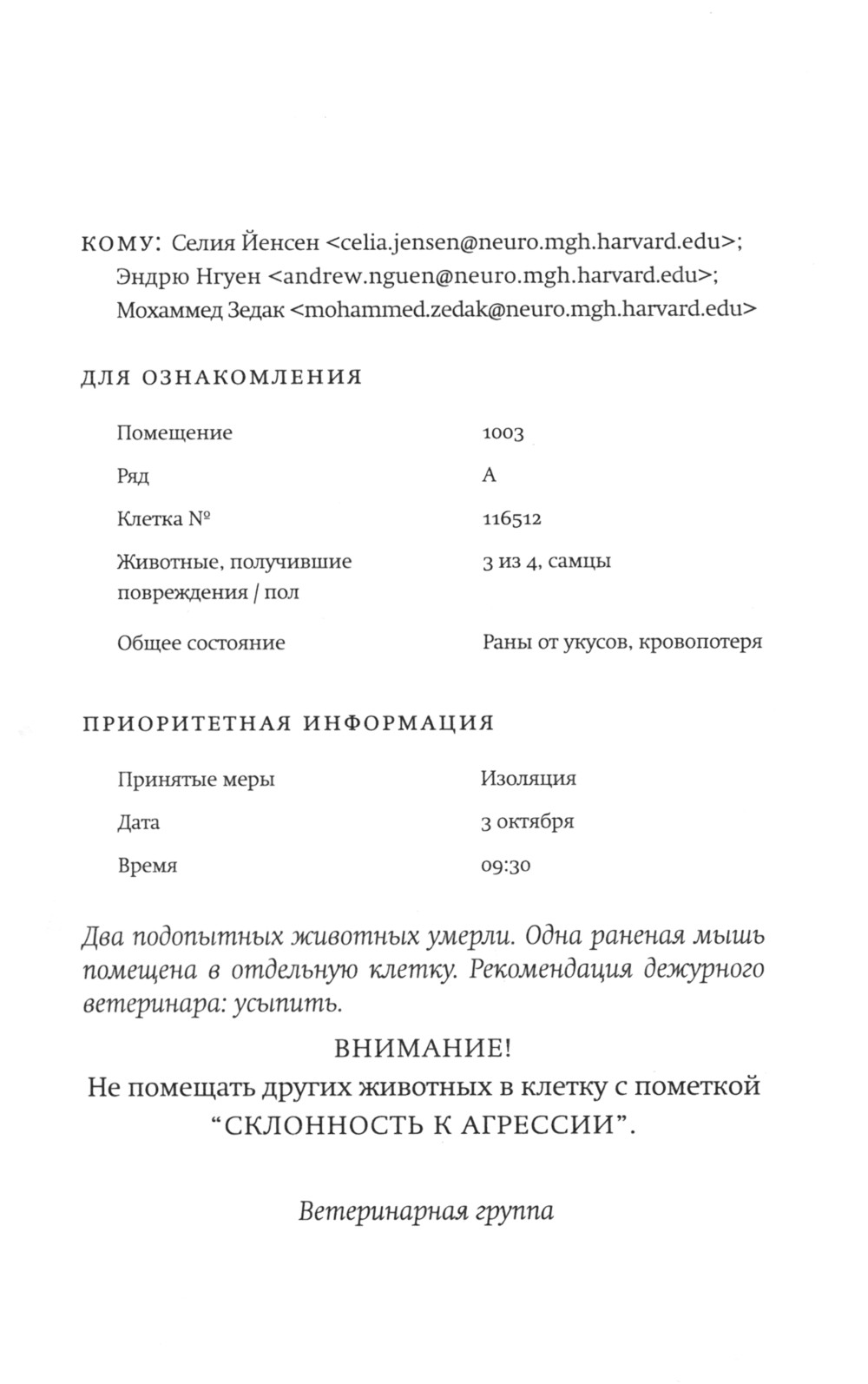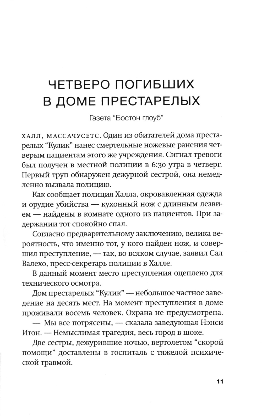 Новый роман автора "Бойни". Очень оригинальный триллер о медицинском эксперименте, который пошел наперекосяк, а также история о любви и о хрупкости человека. Биохимик Селия Йенсен в составе команды исследователей работает над новым лекарством от болезни Альцгеймера. Фармакологи полны оптимизма, они уже запустили клинические испытания на больных. И результаты поразительные. Если испытания пройдут успешно, это будет революционным прорывом в лечении страшной болезни. Но в это же время происходит серия необъяснимых актов насилия. И во всех случаях главными действующими лицами выступают пожилые люди. Связаны ли преступления с новым лекарством или это совпадение? И как быть, если препарат и в самом деле имеет столь ужасные побочные проявления? Ведь лекарство действительно чрезвычайно эффективно, а случаи насилия единичны... Или же за происходящим кроется что-то совсем иное?| Издательство | Фантом Пресс |