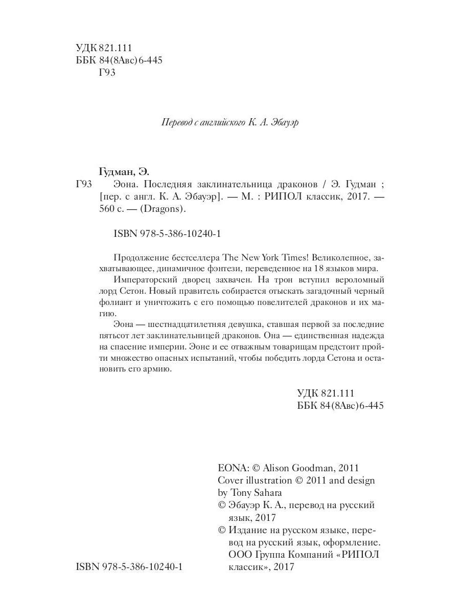 Продолжение бестселлера The New York Times! Великолепное, захватывающее, динамичное фэнтези, переведенное на 18 языков мира. Императорский дворец захвачен. На трон вступил вероломный лорд Сетон. Новый правитель собирается отыскать загадочный черный фолиант и уничтожить с его помощью повелителей драконов и их магию. Эона - шестнадцатилетняя девушка, ставшая первой за последние пятьсот лет заклинательницей драконов. Она - единственная надежда на спасение империи. Эоне и ее отважным товарищам предстоит пройти множество опасных испытаний, чтобы победить лорда Сетона и остановить его армию.| Издательство | Рипол Классик |