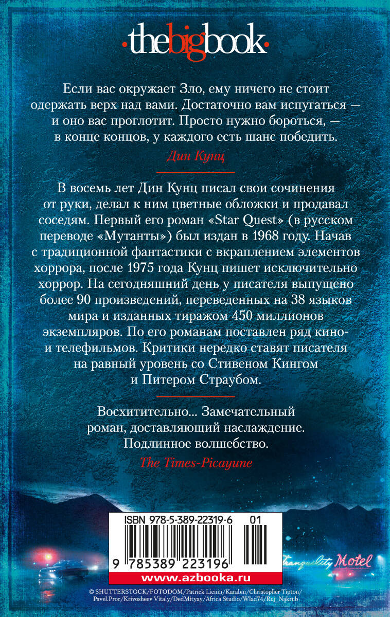 США. Недавнее прошлое. Несколько человек в разных местах страны страдают от необъяснимых недугов: Доминик, писатель, - от лунатизма, Джинджер, врач в больнице при Колумбийском университете, - от кратких отключений сознания, священник Брендан теряет веру - правда, взамен обретает дар целительства, Эрни, в прошлом морпех, прошедший Вьетнам, поражен боязнью темноты. Всех их объединяет одно: прошлым летом все они останавливались в мотеле "Транквилити", штат Невада. Там-то и начались все их личные неприятности. Похоже, кто-то сознательно вычистил из их памяти события, в которых они участвовали…| Издательство | Азбука-Аттикус Издат.группа ООО |