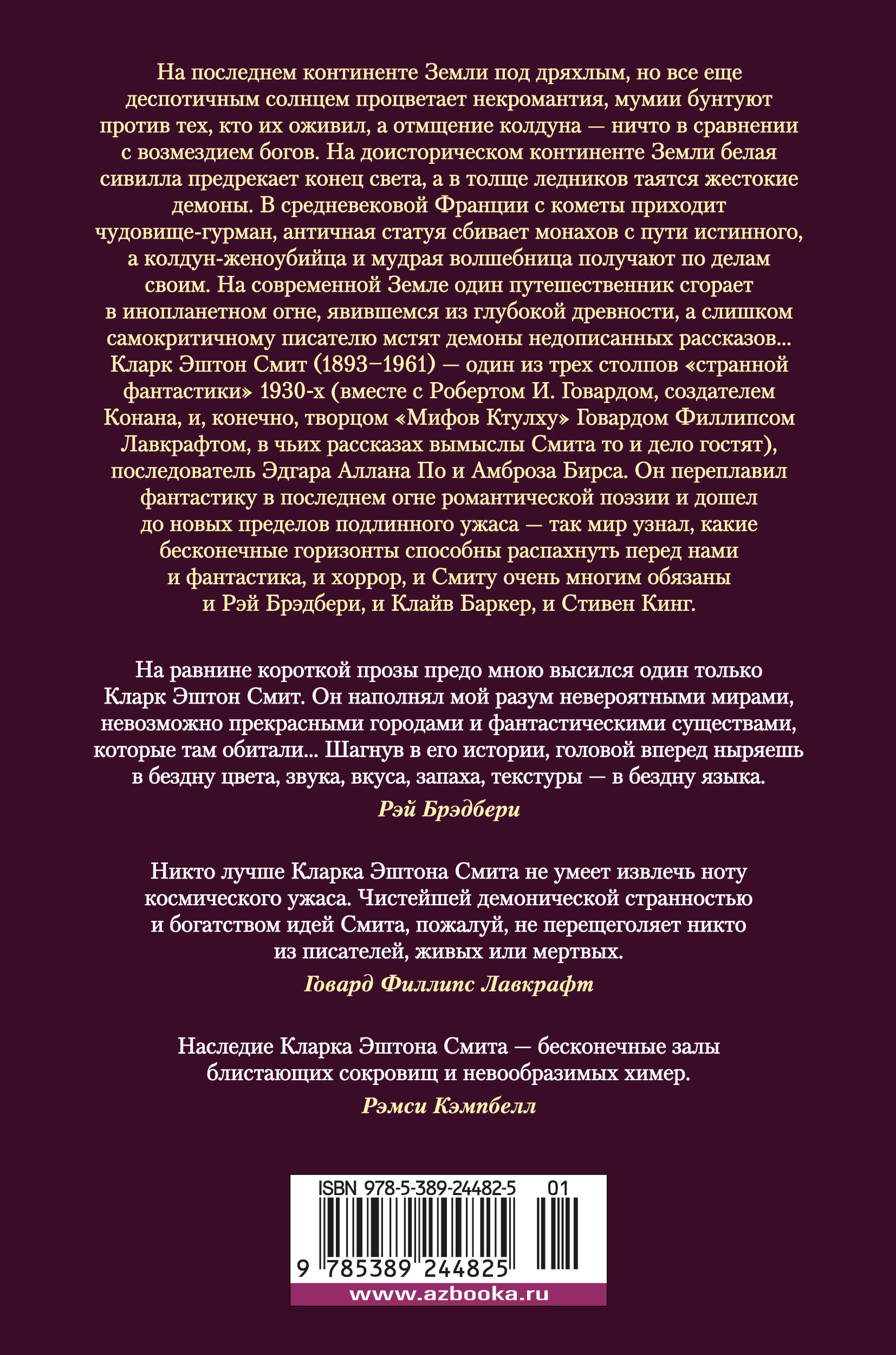 На последнем континенте Земли под дряхлым, но все еще деспотичным солнцем процветает некромантия, живыми правит бог смерти, мумии бунтуют против тех, кто их оживил, а отмщение колдуна - ничто в сравнении с возмездием богов. На доисторическом континенте Земли загадочная белая сивилла предрекает катастрофы, а в толще ледников таятся жестокие демоны. В средневековой Франции с кометы приходит чудовище-гурман, античная статуя сбивает монахов с пути истинного, а колдун-женоубийца и мудрая волшебница получают по делам своим. На современной Земле коллекционер странного безвозвратно погружается во времена, что предшествовали первобытным, путешественник сгорает в инопланетном огне, явившемся из глубокой древности, а слишком самокритичному писателю мстят демоны недописанных рассказов... Кларк Эштон Смит (1893-1961) - один из трех столпов "странной фантастики" 1930-х (вместе с Робертом И. Говардом, создателем Конана, и, конечно, творцом "Мифов Ктулху" Говардом Филлипсом Лавкрафтом, в чьих рассказах вымыслы Смита то и дело гостят), последователь Эдгара Аллана По и Амброза Бирса. Он переплавил фантастику в последнем огне романтической поэзии и дошел до новых пределов подлинного ужаса - так мир узнал, какие бесконечные горизонты способны распахнуть перед нами и фантастика, и хоррор, и Смиту очень многим обязаны и Рэй Брэдбери, и Клайв Баркер, и Стивен Кинг. В этом сборнике представлены работы 1932-1935 годов, периода бурного расцвета Смита как рассказчика, а также его менее многочисленные позднейшие тексты; большинство рассказов здесь публикуются в новых переводах.| Издательство | Азбука-Аттикус Издат.группа ООО |