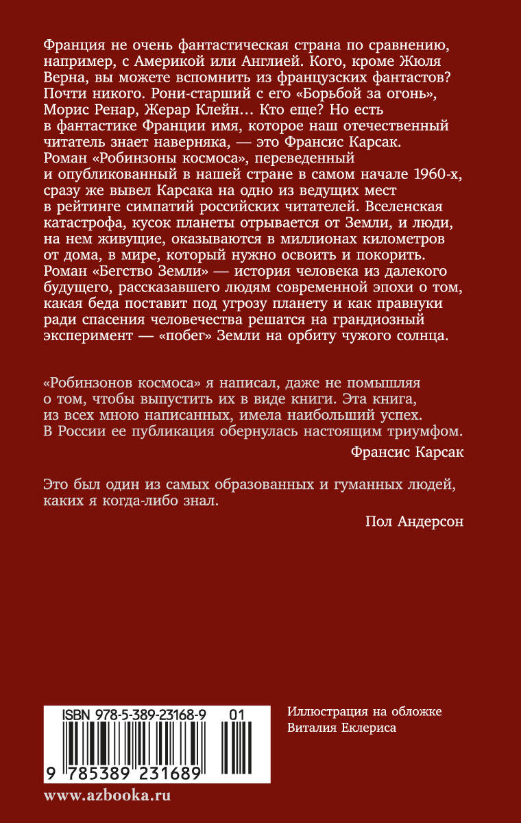 Франция не очень фантастическая страна по сравнению, например, с Америкой или Англией. Кого, кроме Жюля Верна, вы можете вспомнить из французских фантастов? Почти никого. Рони-старший с его "Борьбой за огонь", Морис Ренар, Жерар Клейн… Кто еще? Но есть в фантастике Франции имя, которое наш отечественный читатель знает наверняка, - это Франсис Карсак. Роман "Робинзоны космоса", переведенный и опубликованный в нашей стране в самом начале 1960-х, сразу же вывел Карсака на одно из ведущих мест в рейтинге симпатий российских читателей. Вселенская катастрофа, кусок планеты отрывается от Земли, и люди, на нем живущие, оказываются в миллионах километров от дома, в мире, который нужно освоить и покорить. Роман "Бегство Земли" - история человека из далекого будущего, рассказавшего людям современной эпохи о том, какая беда поставит под угрозу планету и как правнуки ради спасения человечества решатся на грандиозный эксперимент - "побег" Земли на орбиту чужого солнца.| Издательство | Азбука-Аттикус Издат.группа ООО |
