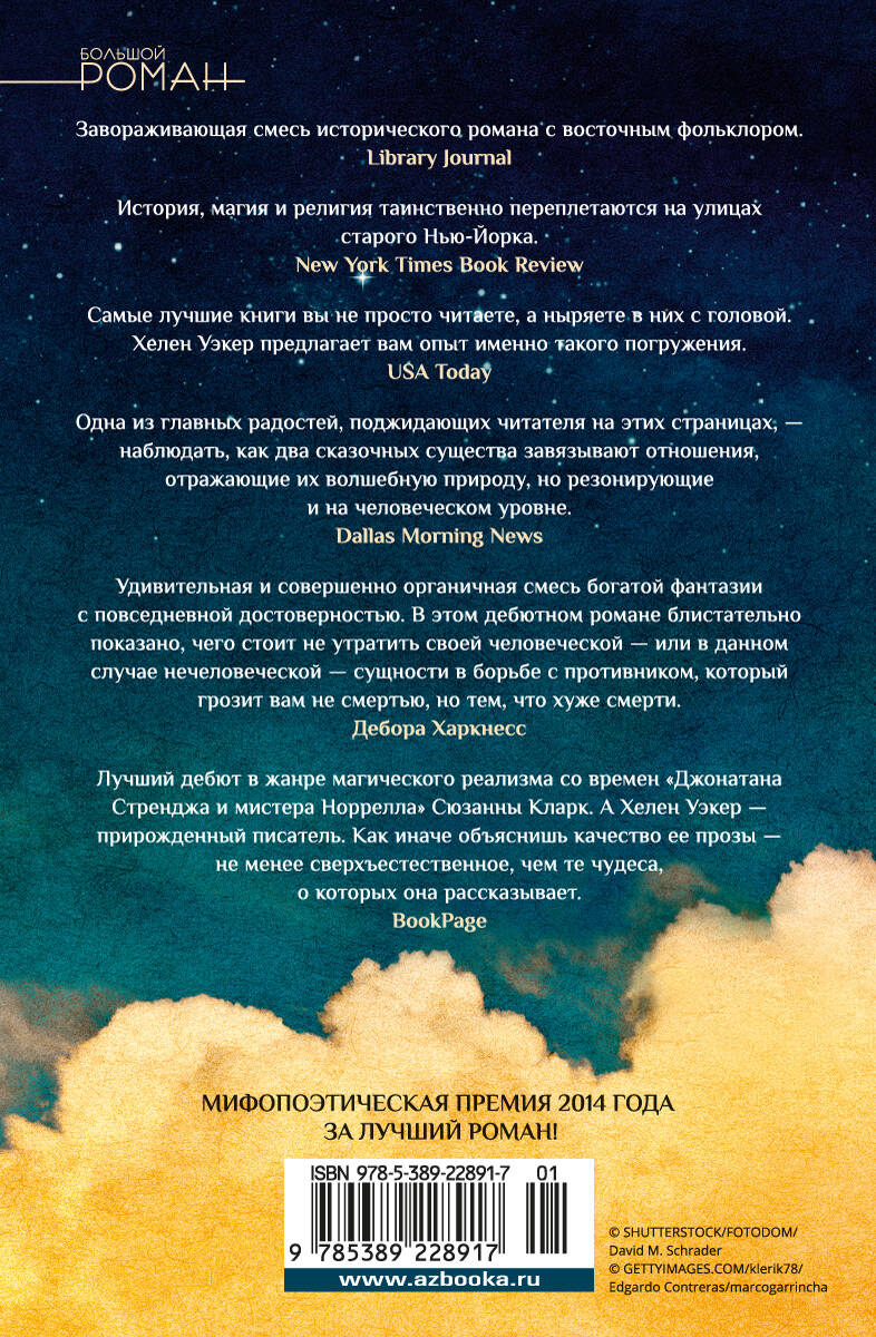 Трудно быть чужим среди людей, еще труднее быть чужеродным. Как освоиться в незнакомой стране, как преодолеть непонимание, одиночество и страх, как найти свой путь, начать новую жизнь?.. В 1899 году в Нью-Йорке оказываются два мифических существа. Голем, созданный из глины в женском облике, призван верно служить хозяину, но теряет его по дороге в Америку, и внезапная свобода оборачивается сущим мучением. Джинна после тысячелетнего заточения случайно выпускает на волю жестянщик из нью-йоркского района Маленькая Сирия. Могущественный дух пустыни, напрочь забывший прошлое, предшествовавшее его пленению, бессилен в человеческом теле и мечтает вырваться из этих оков. Ожившие персонажи древних преданий очень одиноки, но однажды ночью посреди опустевшего города их пути пересекутся... "Голем и Джинн" представляет собой "метафорическую автобиографию" - по признанию автора, роман основан на ее личной истории и она вдохновлялась сходством между двумя семьями, принадлежащими к различным культурным традициям. В 2014 году книга была удостоена Мифопоэтической премии за лучший роман.