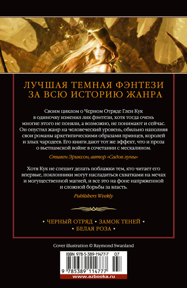 Тьма сражается с тьмой, а Черный Отряд кочует из страны в страну и нанимается к тем, кто готов платить - хоть за доблестную битву, хоть за кровавую расправу. В целом мире не сыщется равных этим суровым, закаленным воинам, привыкшим свои сомнения хоронить вместе со своими павшими братьями. Уже не счесть, который раз они сменили хозяина. Теперь их в бой посылает чудовищная Госпожа, а в подручных у нее самые могущественные колдуны - Десять Взятых. Но сильны и враги, поднявшие мятеж против Госпожи. Их войска неисчислимы, и они верят, что сбывается древнее пророчество: где-то уже родилась Белая Роза, которая приведет их к победе.| Издательство | Издательство АЗБУКА ООО |