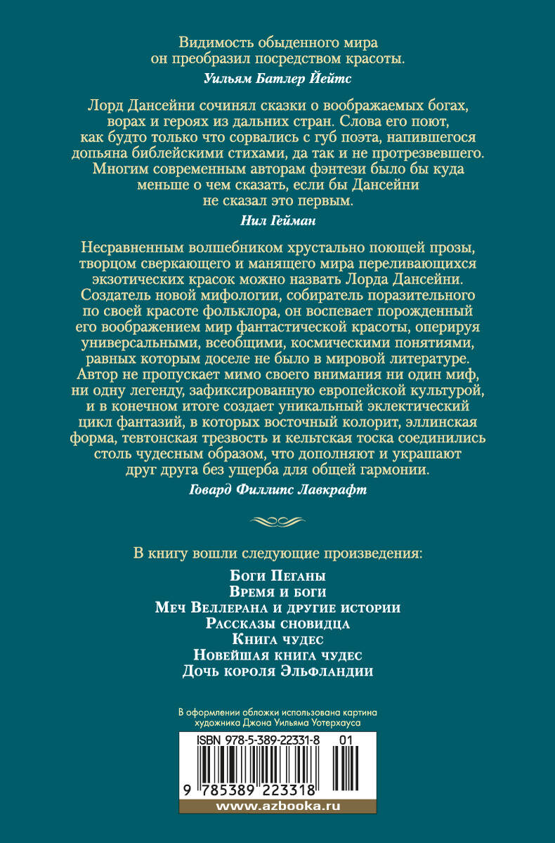 Эдвард Джон Мортон Дракс Планкетт, 18-й барон Дансейни, публиковавшийся как лорд Дансейни, - знаменитый автор множества романов, пьес и литературных сказок, стоявший у истоков самого жанра фэнтези. Едва ли не первым в европейской литературе он создал целый "вторичный мир" - со своей космологией, мифологией, историей и географией. Его мифология повлияла на Лавкрафта, Толкина и Борхеса, а парадоксальный юмор, постоянная игра с читательскими ожиданиями - на Нила Геймана и на всю современную ироническую фэнтези. В данной книге вашему вниманию предлагаются шесть сборников мастера - "Боги Пеганы", "Время и боги", "Меч Веллерана и другие истории", "Рассказы сновидца", "Книга чудес", "Новейшая книга чудес", - а также роман "Дочь короля Эльфландии". Здесь бог радости и сладкоголосых музыкантов может встретить бога сновидений и фантазий, здесь народу полей никогда не добраться до Каркассона, здесь 250-летний кентавр наконец отправляется на поиски невесты, а парламент деревни, расположенной недалеко от границы Волшебной страны, решает, чтобы их землею правил чародей... Часть произведений публикуется в новых переводах, остальные - в новой редакции. Издание сопровождается иллюстрациями знаменитого художника-сказочника Сидни Сайма, сделанными для первых публикаций книг Дансейни.