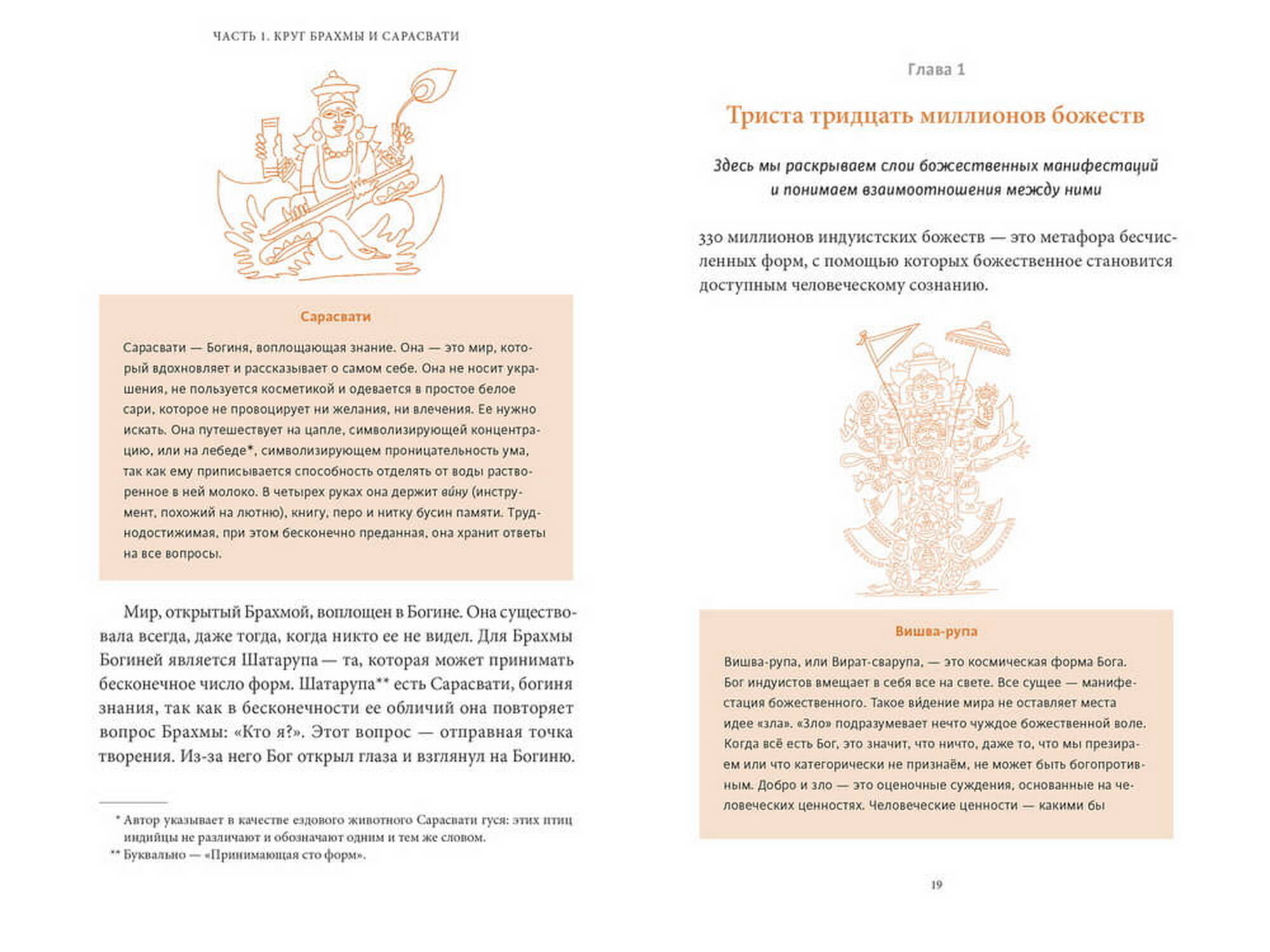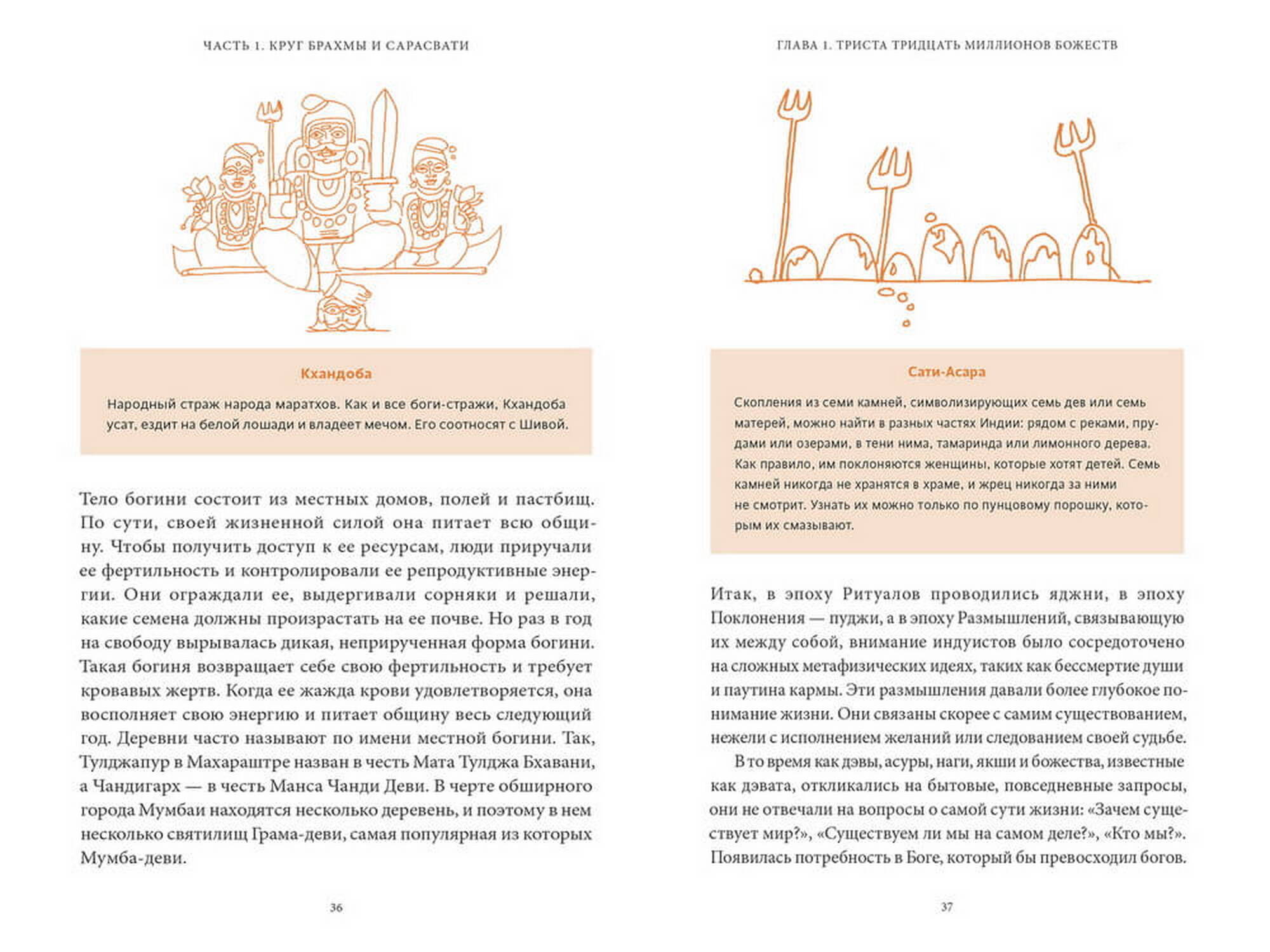Индийская мифология исключительно разнообразна. В ней есть 330 миллионов божеств. Есть боги и богини, духи, личные боги, домашние боги и боги пространства и времени. Есть боги для каждой касты и те, что заботятся о ремесленниках. Есть боги, охраняющие природу, живущие на деревьях и те, что принимают форму животных. Некоторые увлечены минералами, некоторые - геометрическими формами. Кроме того, есть множество демонов, у каждого из которых есть история взлета и падения. Чего нет в индийской мифологии, так это аналога дьявола, верховного демона, который повелевает прочими злыми духами. Эта книга - своего рода путеводитель по основным аспектам индийской мифологии. Девдатт Паттанаик выбирает несколько историй, которые говорят сами за себя, помогая читателям понять, почему Юдхиштхира отправился на небеса, а его братья - в ад. Он показывает, почему Рама был образцовым властителем, несмотря на то что изгнал Ситу в лес. Он также объясняет, почему Гаури и Кали едины, хотя одна питает, а другая убивает. Для кого эта книга: Для ценителей истории, мифологии и их места в современности. Для всех, кто хочет погрузиться в жизнь народов прошлого. Для тех, кто любит Индию. От автора: Мы все живем в мифе. Многим людям эта мысль неприятна. Ведь принято считать, что миф - это обман. Приятнее верить, что мы живем в истинной реальности. Однако истин много. Они бывают объективными и субъективными. Бывают логическими и интуитивными. Одни существуют в рамках одной культуры, другие универсальны. Одни основываются на доказательствах, другие зависят от веры. Миф - это истина субъективная, интуитивная, прочно связанная с конкретной культурой и базирующаяся на вере. Если миф - это идея, то мифология - это движущая сила идеи. Мифология формирует истории, символы и ритуалы, благодаря которым миф становится объемным. Это по сути своей языки; языки, которые можно услышать, увидеть и обыграть. Все вместе они составляют культурные истины. В этой книге исследуется индуистская мифология. За мифологией стоит миф. За мифом стоит истина: унаследованное представление о жизни и смерти, о природе и культуре, о совершенстве и возможностях, об иерархиях и горизонтах. Эта субъективная и культурная истина индусов не превосходит и не уступает другим истинам. Это всего лишь еще одно человеческое понимание жизни.