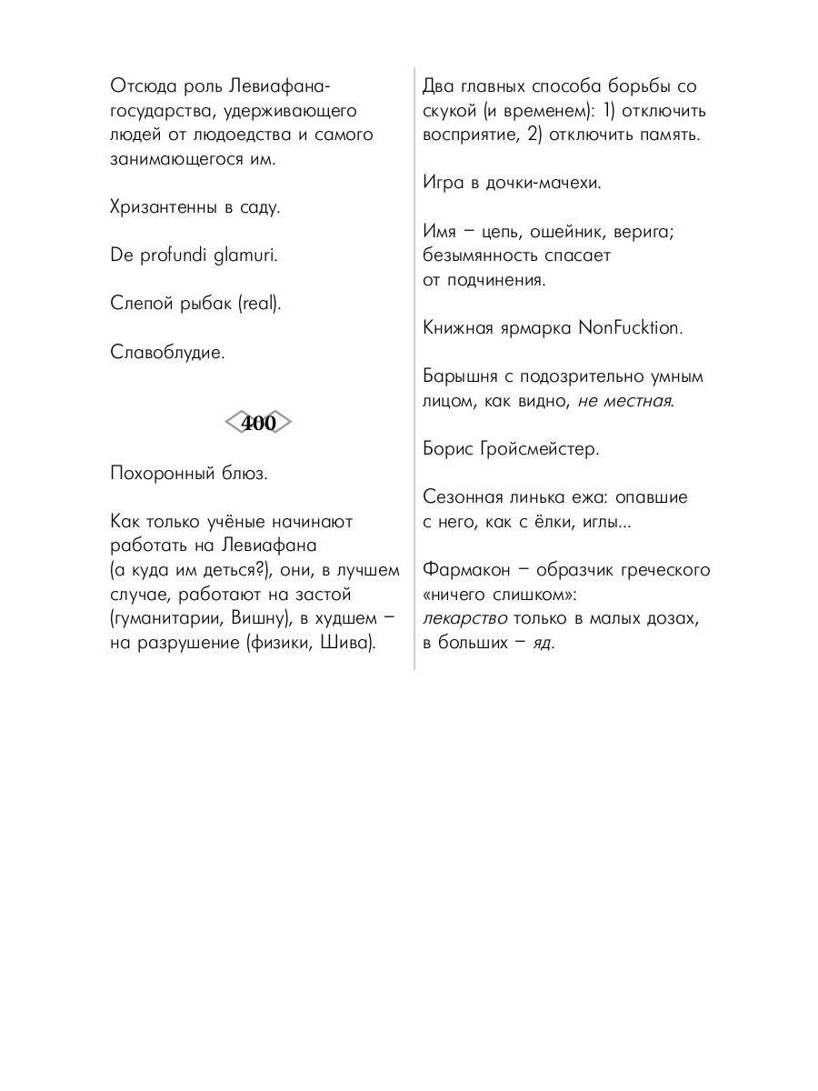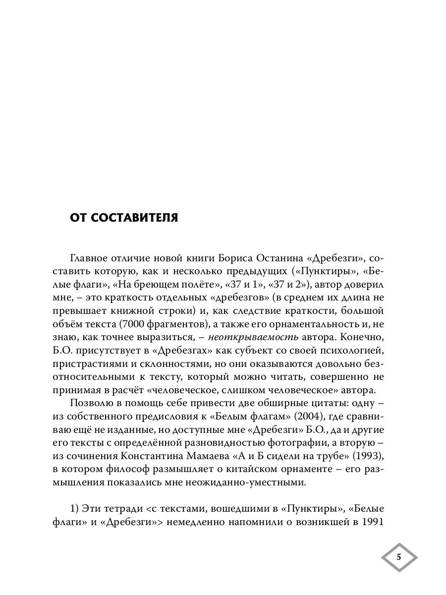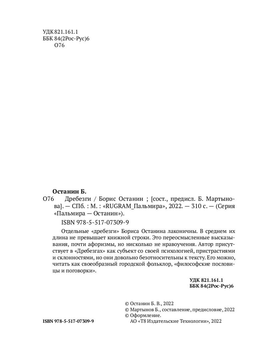 Отдельные «дребезги» Бориса Останина лаконичны. В среднем их длина не превышает книжной строки. Это переосмысленные высказывания, почти афоризмы, но нисколько не нравоучения. Автор присутствует в «Дребезгах» как субъект со своей психологией, пристрастиями и склонностями, но они довольно безотносительны к тексту. Его можно, читать как своеобразный городской фольклор, «философские пословицы и поговорки».| Издательство | Т8 RUGRAM |